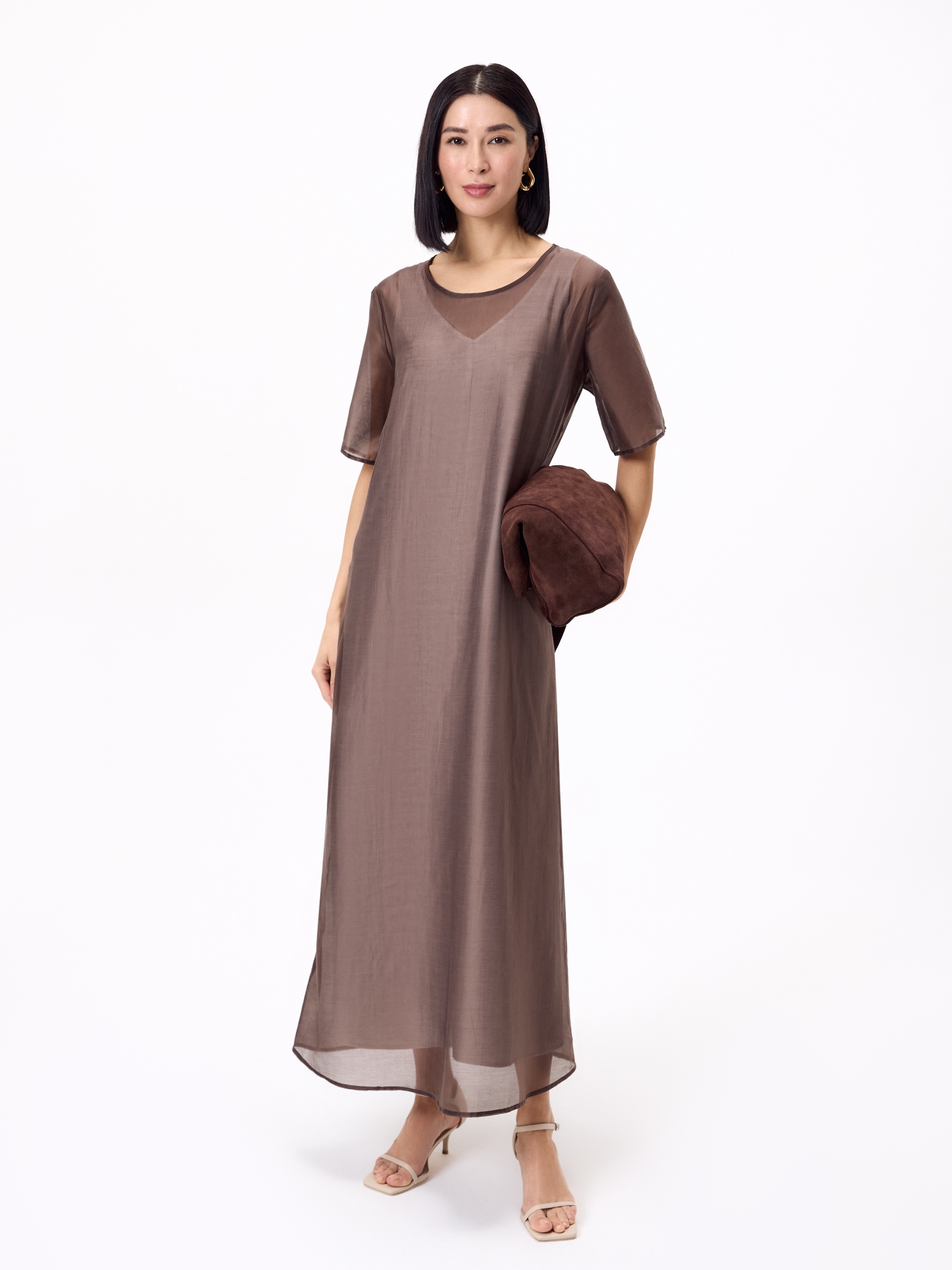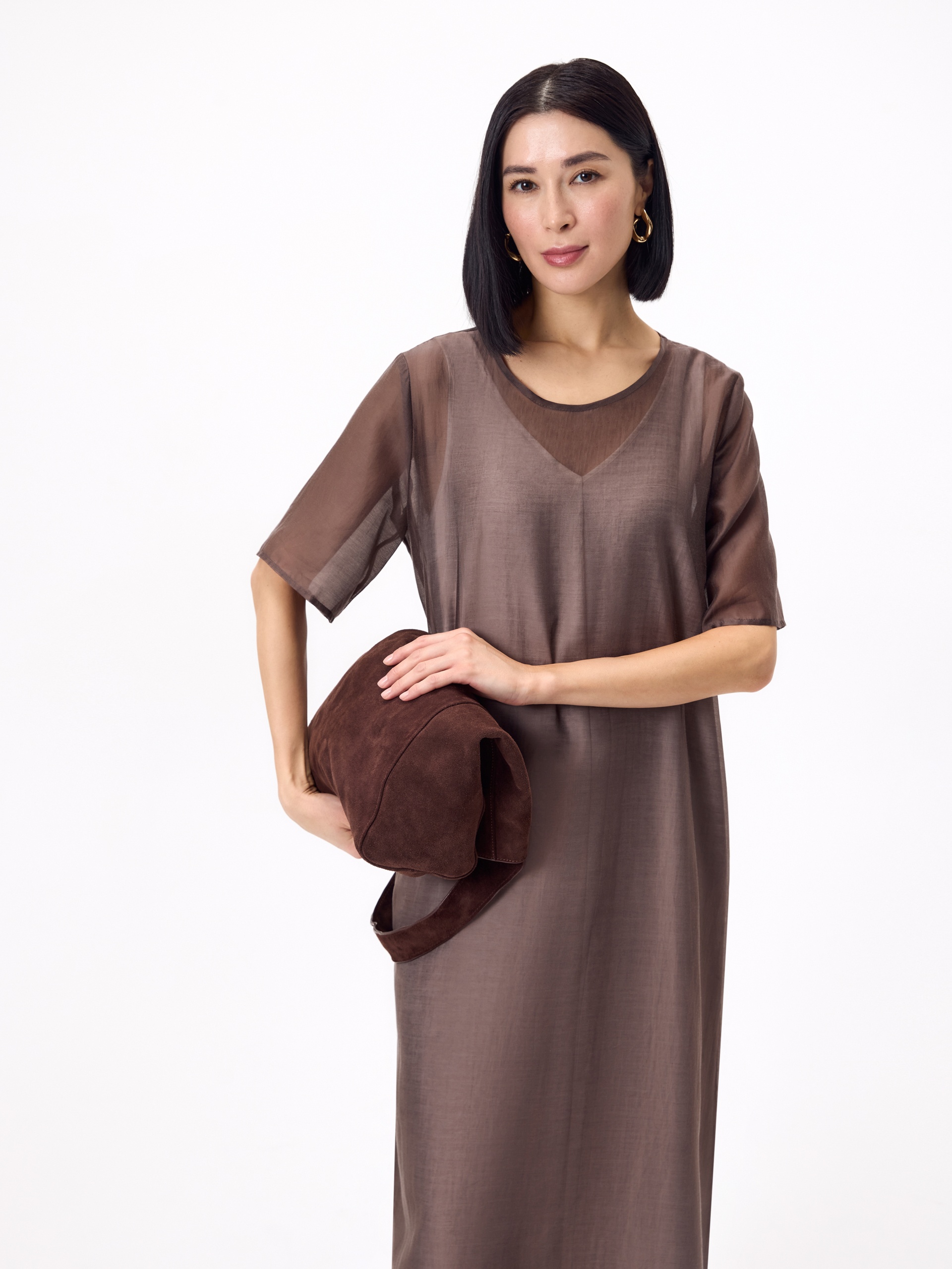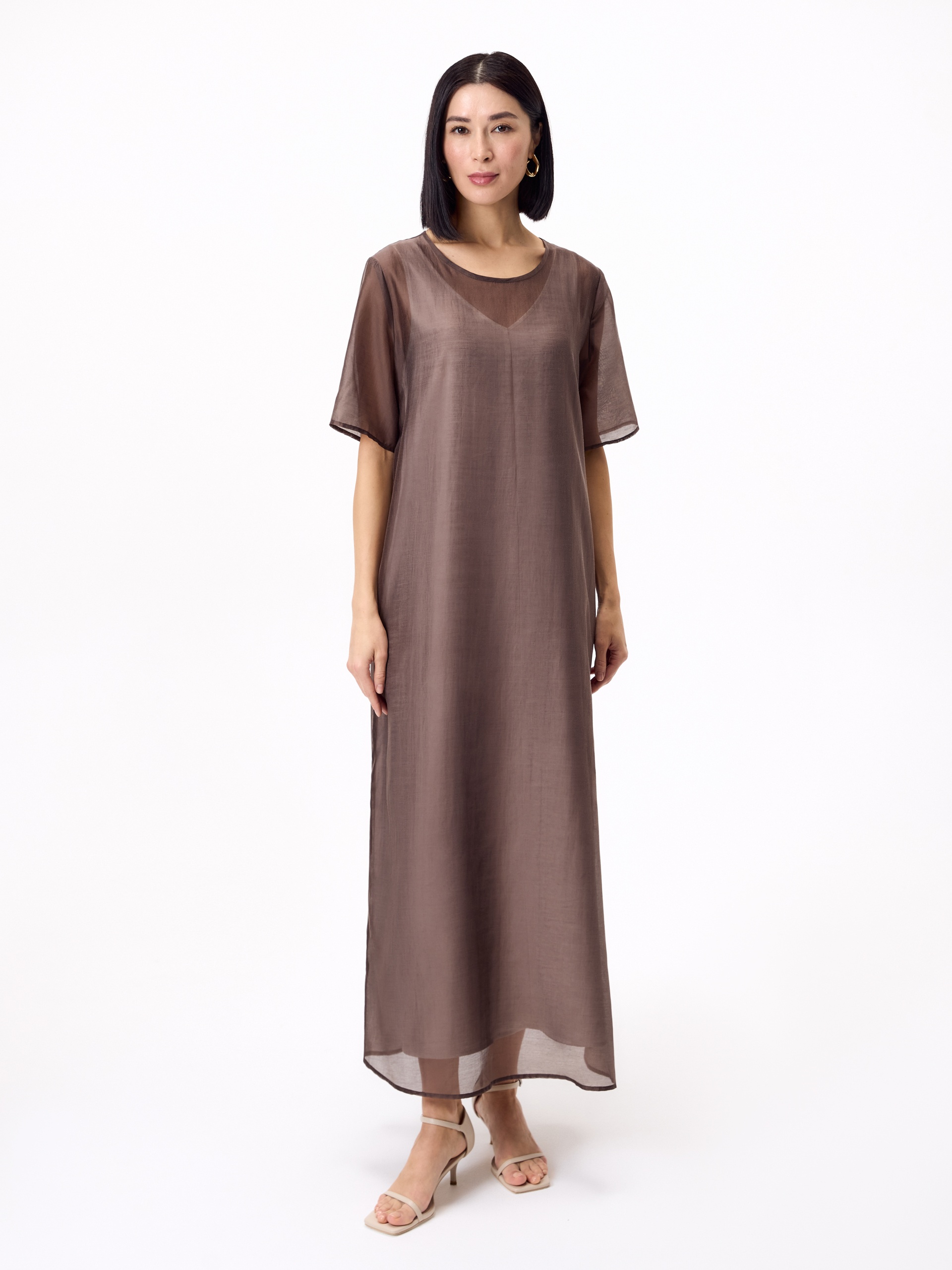 Прозрачное шоколадное платье-футболка из легкой ткани. Под ним — длинное маки и белое атласное платье-комбинация.