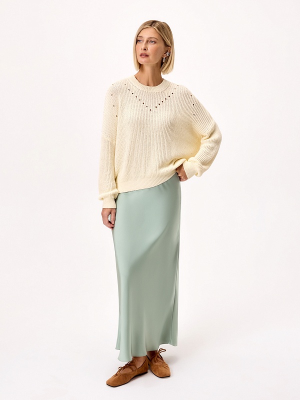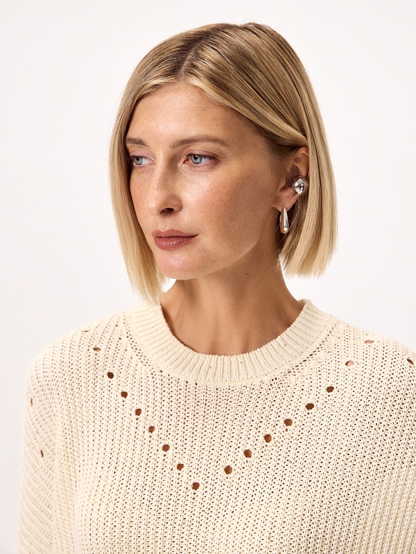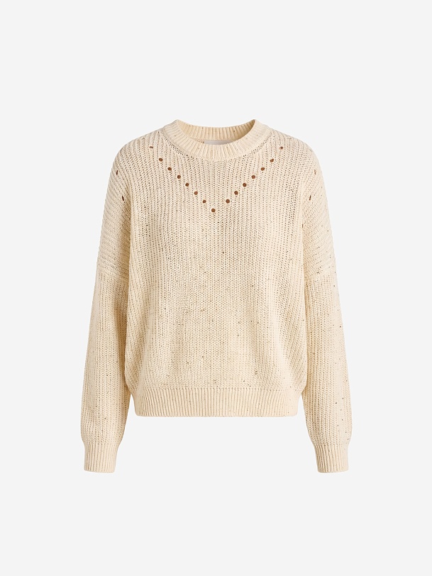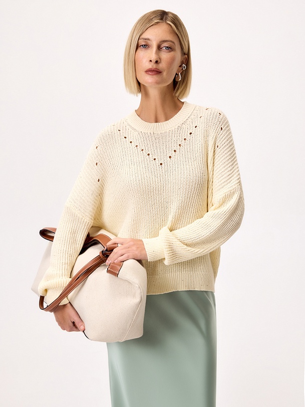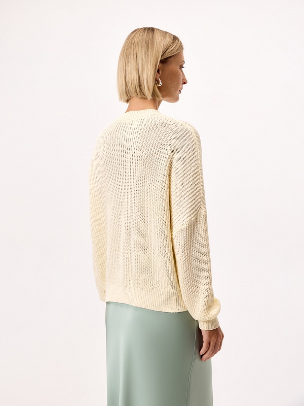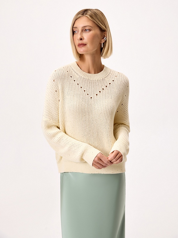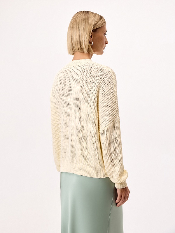 Воздушный мерцающий джемпер трендового оттенка сливочного масла, с вкраплениями золотых микропайеток сделает Ваш повседневный образ более изысканным и нарядным, а натуральная хлопковая пряжа позволит чувствовать себя комфортно при вечерних выходах в свет. Модель имеет круглую горловину , манжеты и низ изделия на резинке.