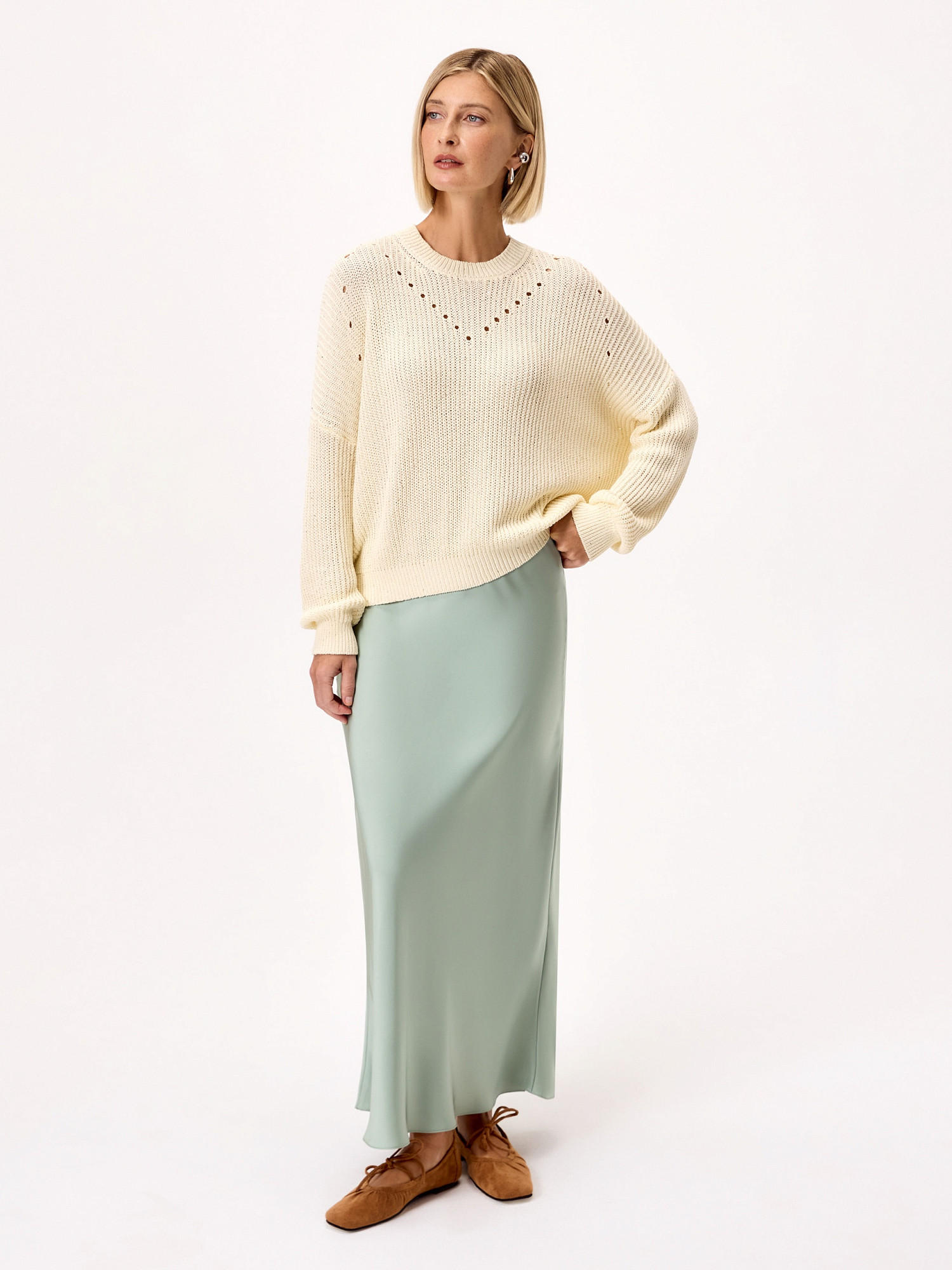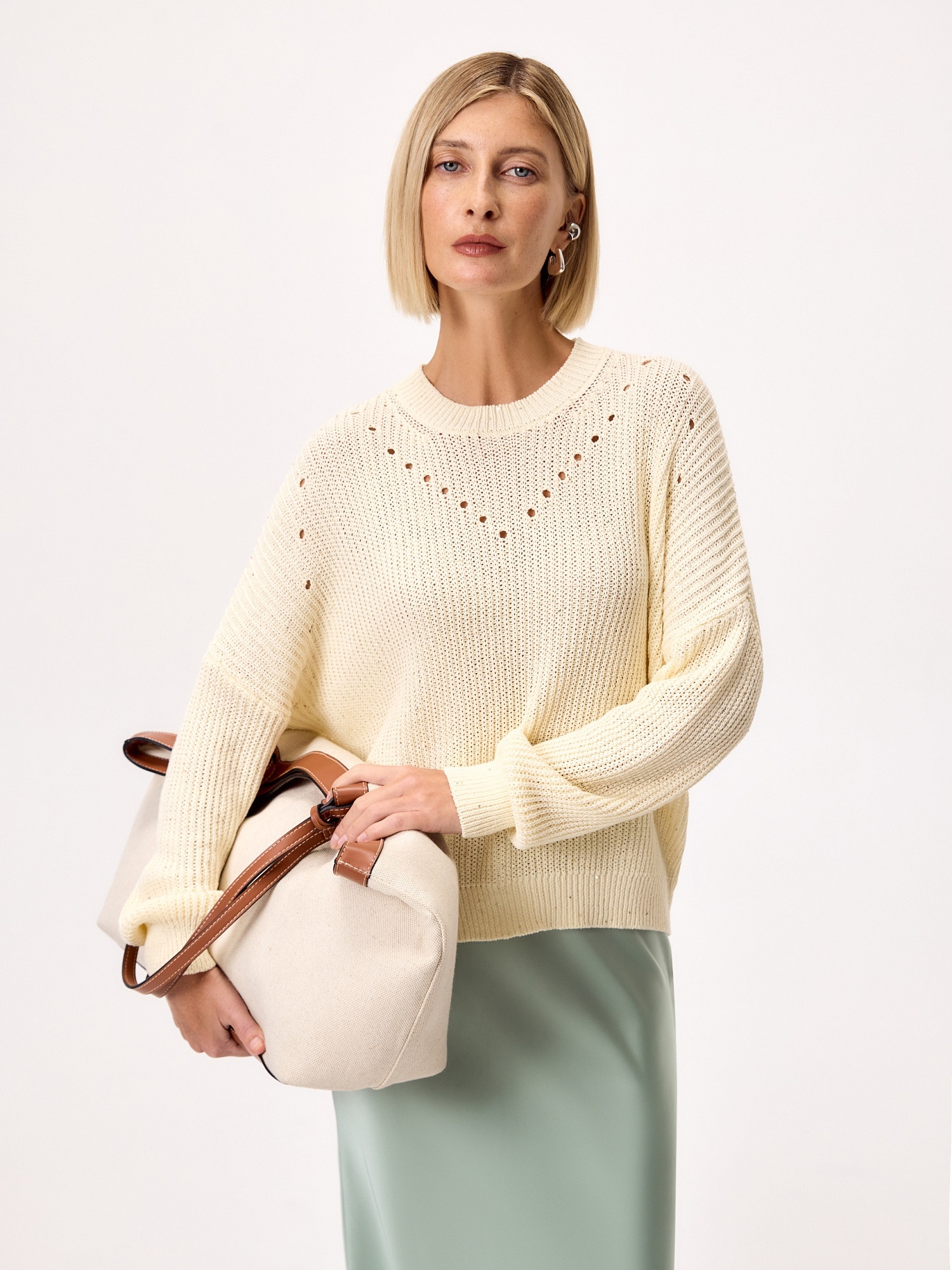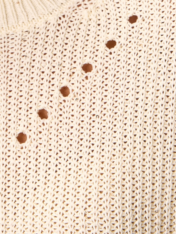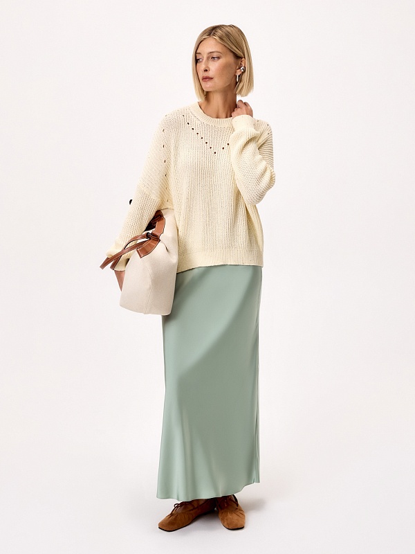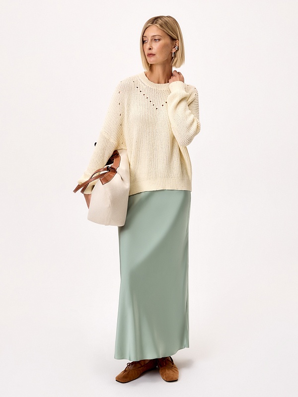 Воздушный мерцающий джемпер трендового оттенка сливочного масла, с вкраплениями золотых микропайеток сделает Ваш повседневный образ более изысканным и нарядным, а натуральная хлопковая пряжа позволит чувствовать себя комфортно при вечерних выходах в свет. Модель имеет круглую горловину , манжеты и низ изделия на резинке.