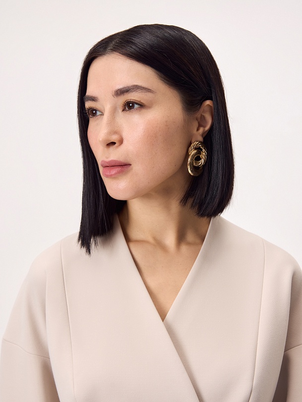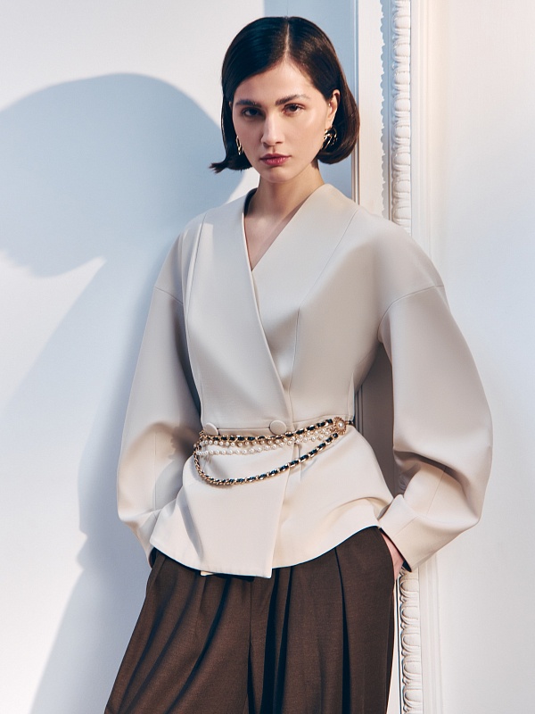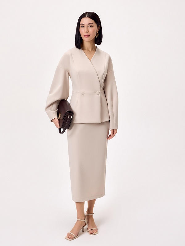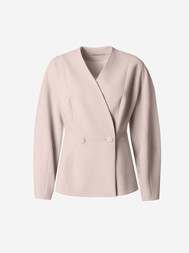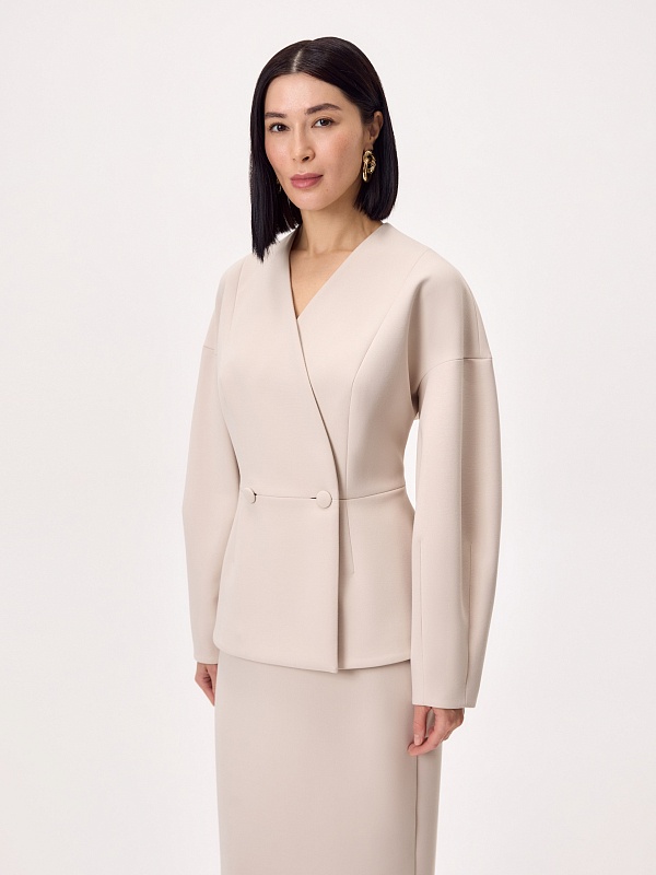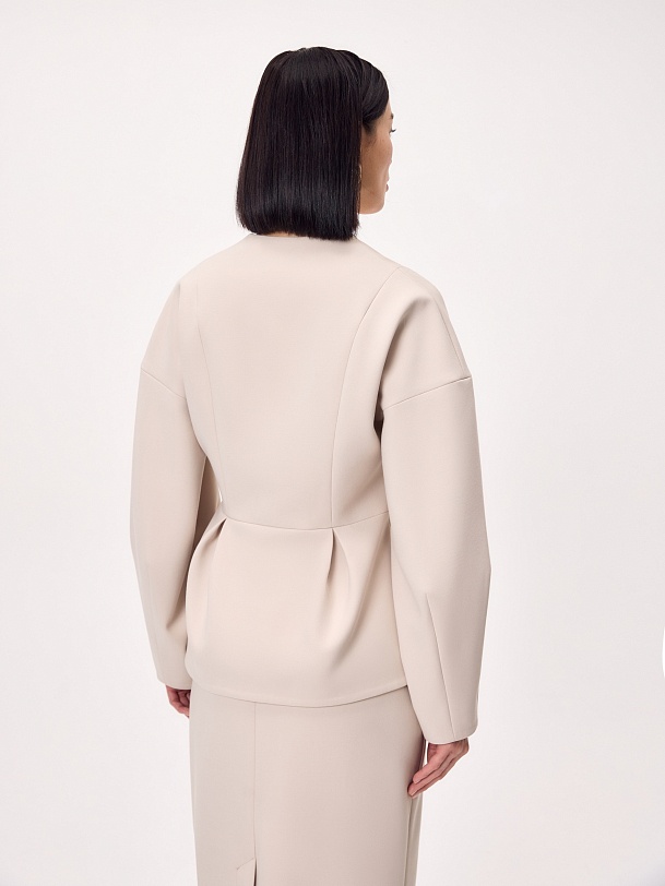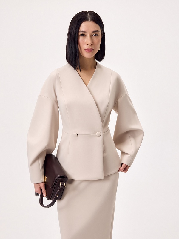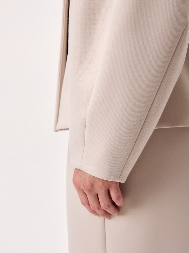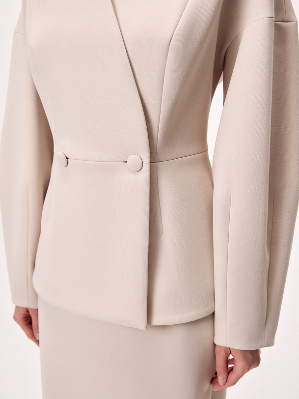 Жакет из благородного светло-бежевого материала на подкладке приталенного силуэта с двубортной застежкой на обтяжные пуговицы из основной ткани, длиной до линии бедер. Спинка с двумя встречными складками от линии талии. Рукав втачной объемного покроя с заужением к низу, линяя плеча спущенная. Идеальный комплект к жакету составит юбка и брюки из единого материала.