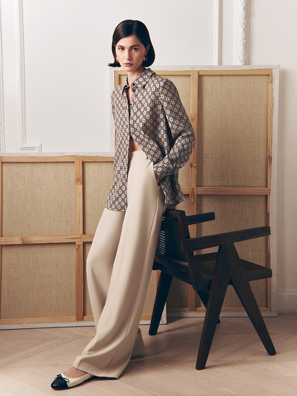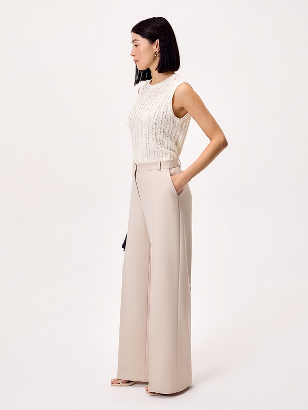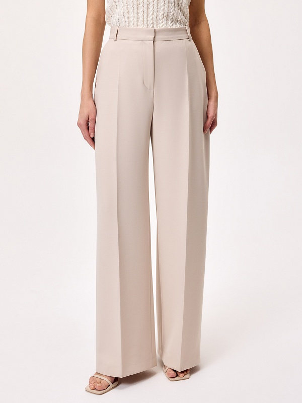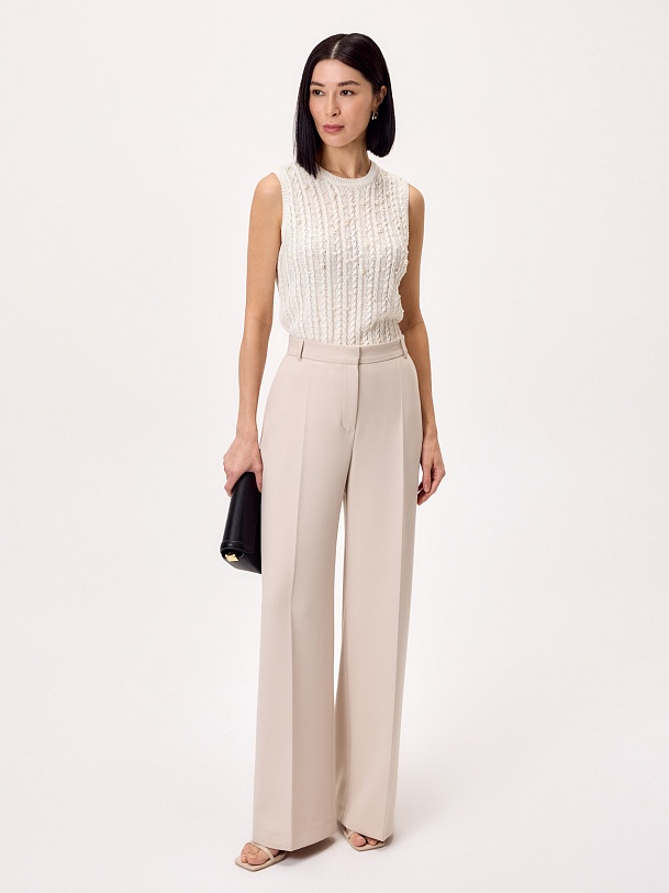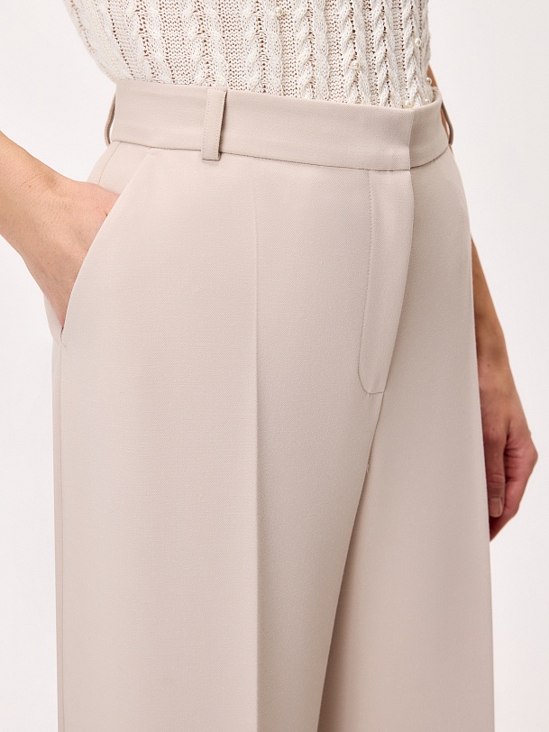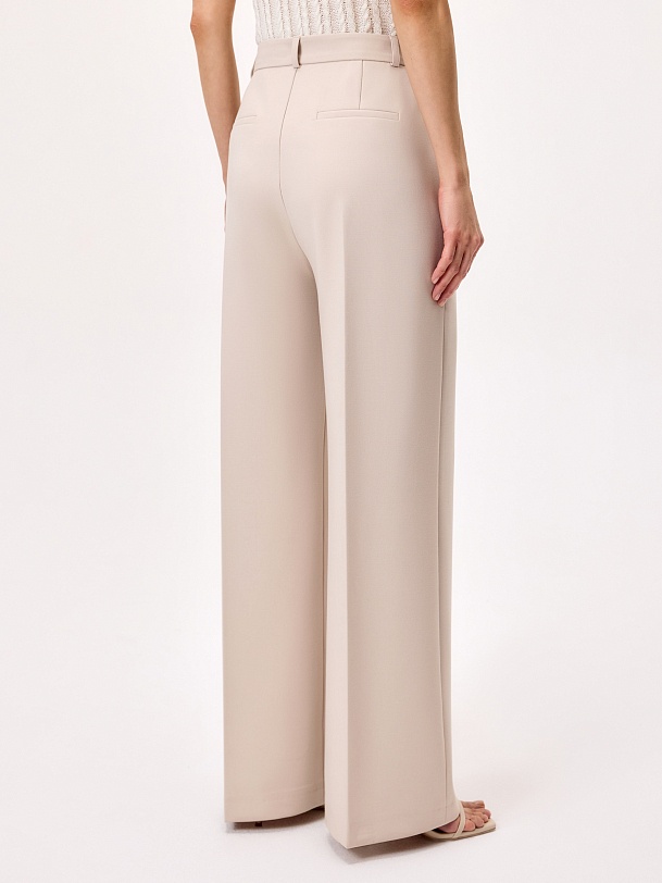 Брюки из благородного светло-бежевого материала высокой посадки прямого покроя, с боковыми карманами на переде и прорезными карманами с листочками на спинке. С брюками будет идеально сочетаться жакет из единой ткани.