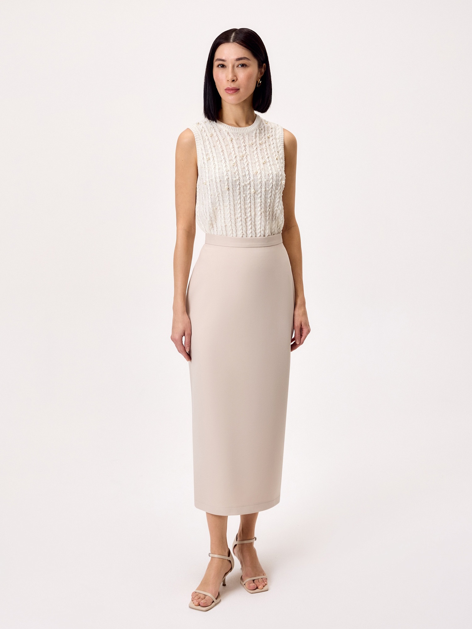 Юбка из благородного светло-бежевого материала высокой посадки прямого кроя с заужением к низу на подкладке длиной ниже колена. Юбка будет идеально сочетаться с жакетом из единой ткани.