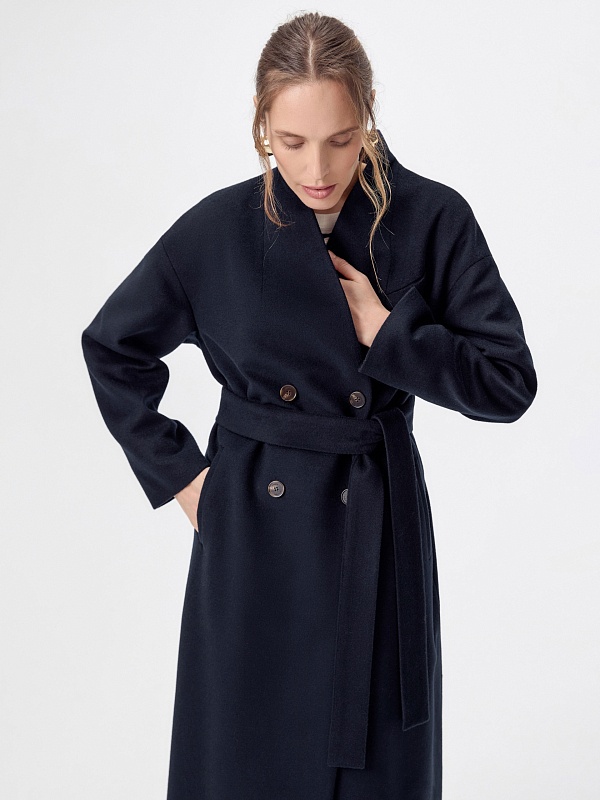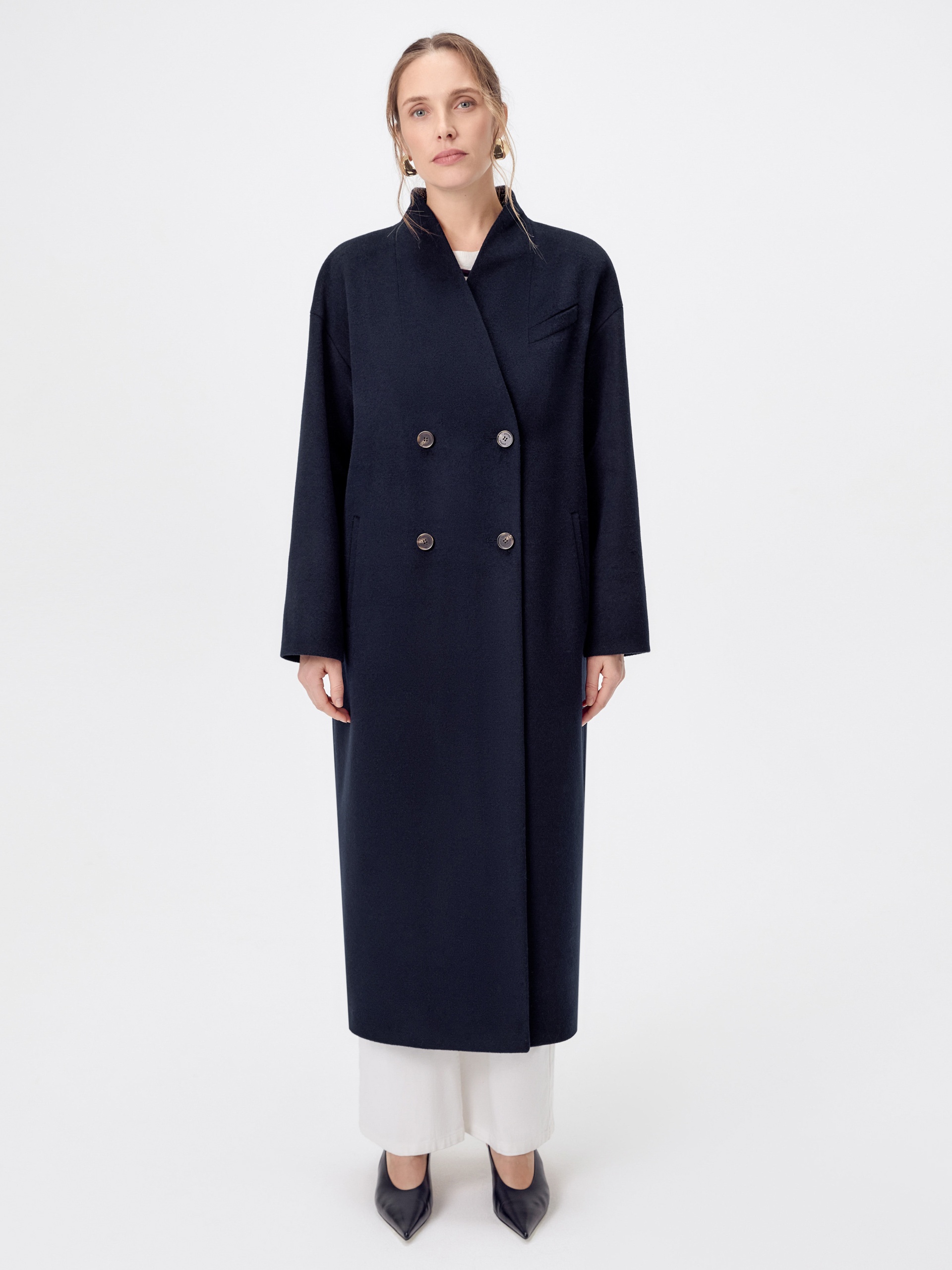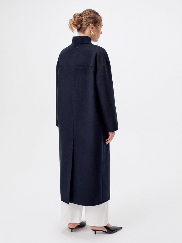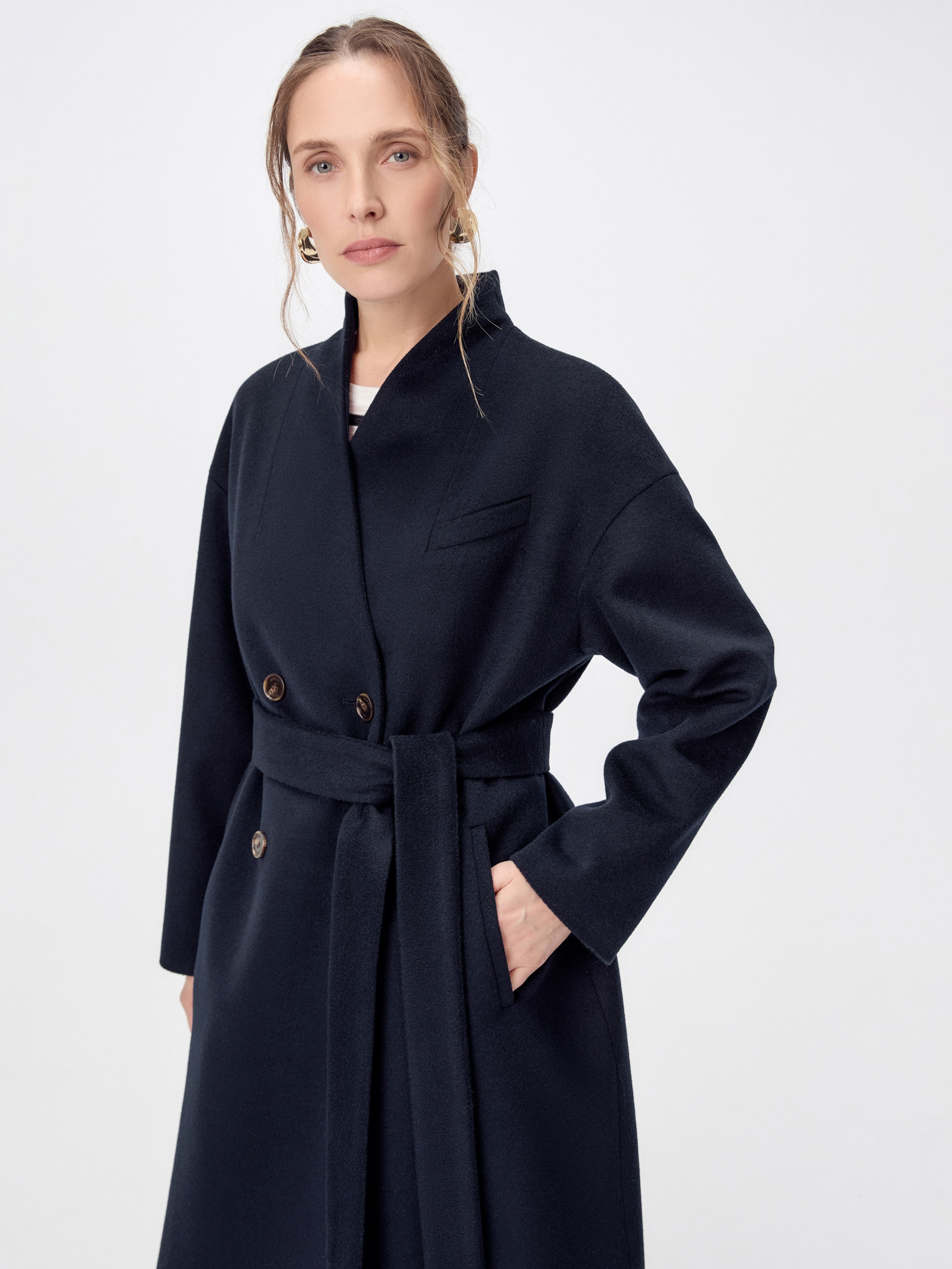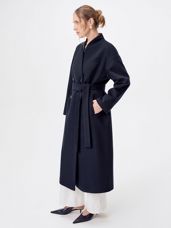 Длинное пальто в классическом глубоком черно-синем цвете. В этой новой конструкции с цельнокроеным воротником-стойкой и почти прямой стойкой наши дизайнеры смело создают легкое восточное настроение. Пальто двубортное, сшито из ворсовой ткани с высоким содержанием натуральной шерсти. На груди расположена декоративная листочка, по бокам вместительные карманы. Спинка пальто с широкой кокеткой и высокой шлицей. В комплекте с пальто предлагается пояс из основной ткани. А для наилучшей защиты от непогоды пальто выполнено с использованием высокотехнологичной мембраны RaftPro. Произведено в Санкт-Петербурге.