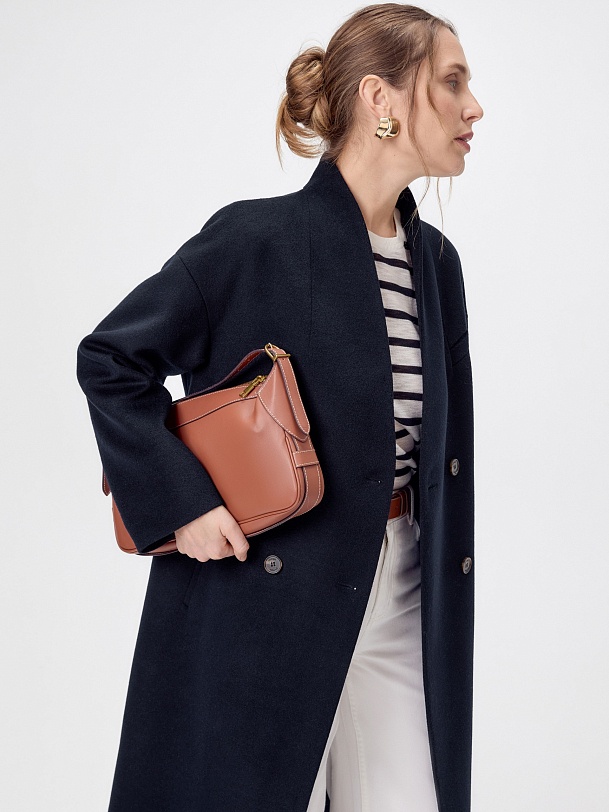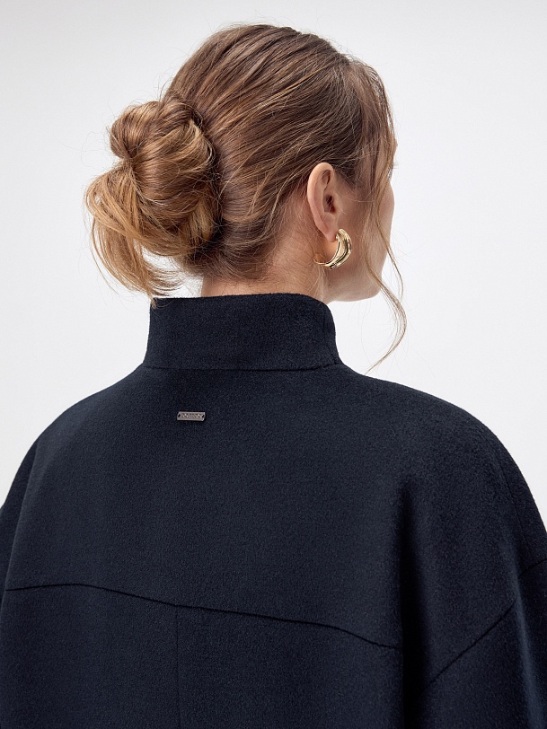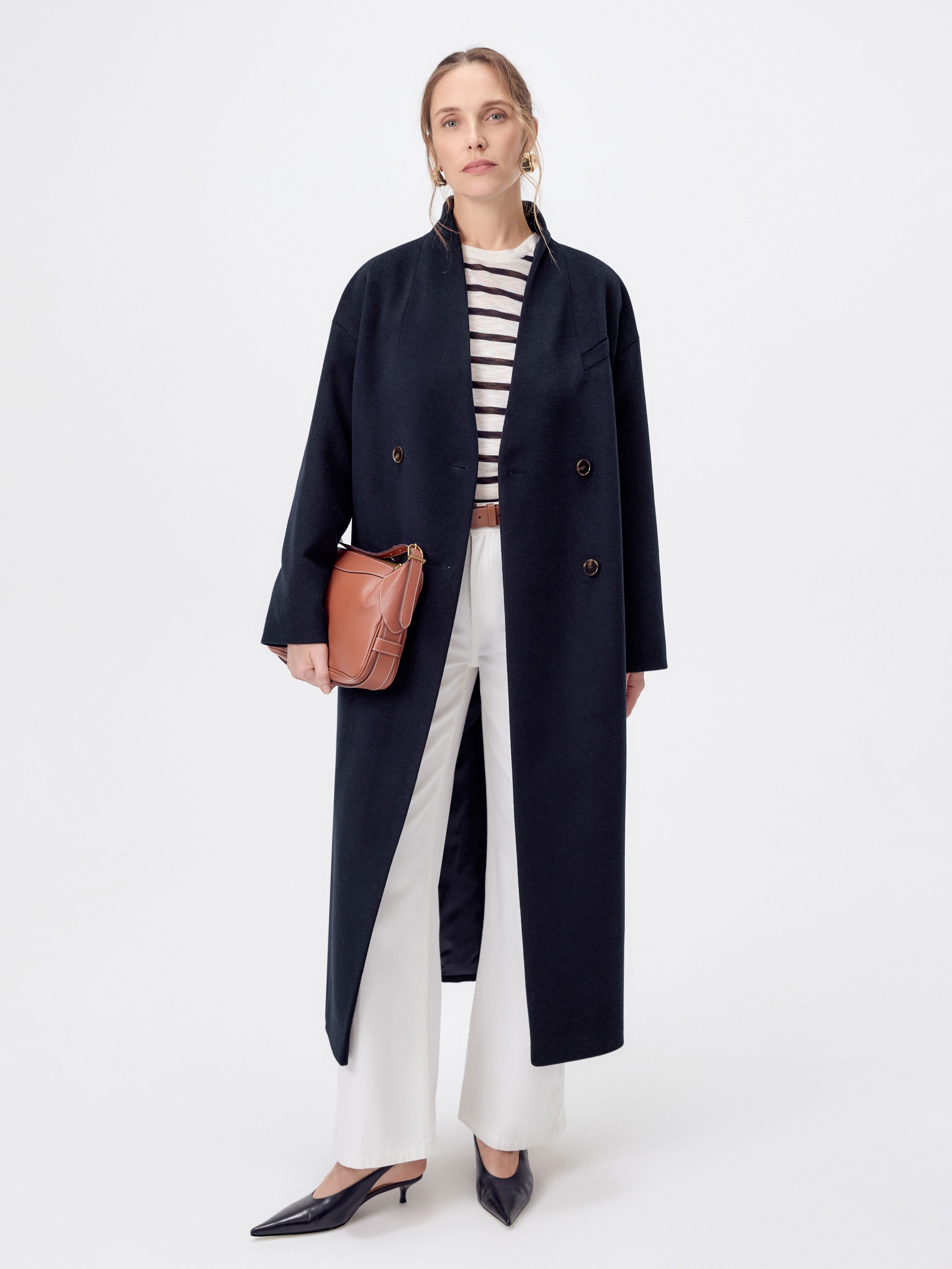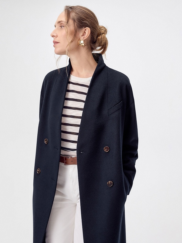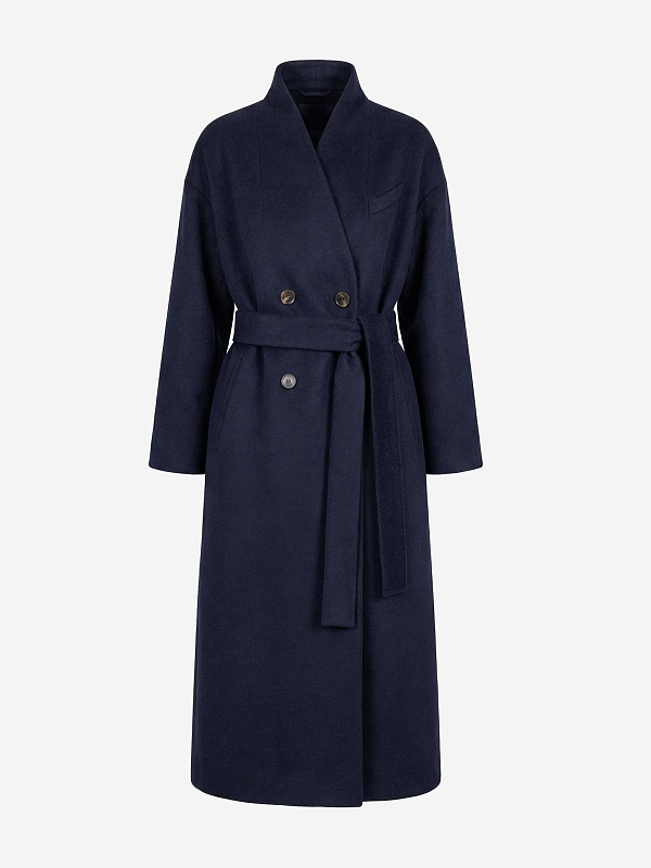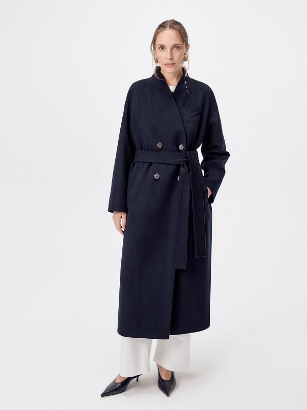 Длинное пальто в классическом глубоком черно-синем цвете. В этой новой конструкции с цельнокроеным воротником-стойкой и почти прямой стойкой наши дизайнеры смело создают легкое восточное настроение. Пальто двубортное, сшито из ворсовой ткани с высоким содержанием натуральной шерсти. На груди расположена декоративная листочка, по бокам вместительные карманы. Спинка пальто с широкой кокеткой и высокой шлицей. В комплекте с пальто предлагается пояс из основной ткани. А для наилучшей защиты от непогоды пальто выполнено с использованием высокотехнологичной мембраны RaftPro. Произведено в Санкт-Петербурге.