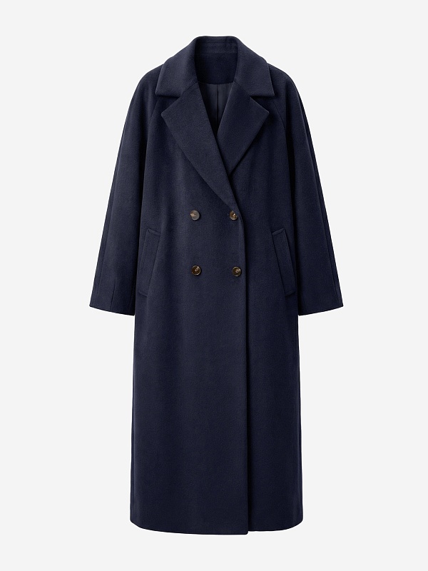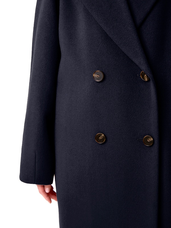 Длинное двубортное пальто из черно-синей шерстяной ткани с содержанием нежных волокон кашемира. Силуэт кокон создает расслабленный образ, дарит комфорт и уют. Пальто с английским воротником и рукавом-реглан, зауженным к низу. В боковых швах прячутся удобные глубокие карманы. Застежка на два ряда стильных крупных пуговиц. А для наилучшей защиты от непогоды пальто выполнено с использованием высокотехнологичной мембраны RaftPro. Произведено в Санкт-Петербурге.