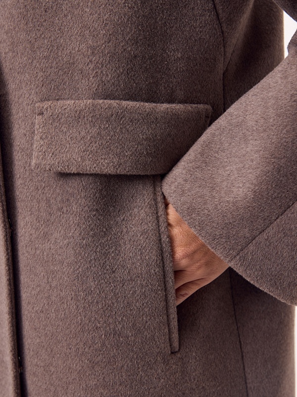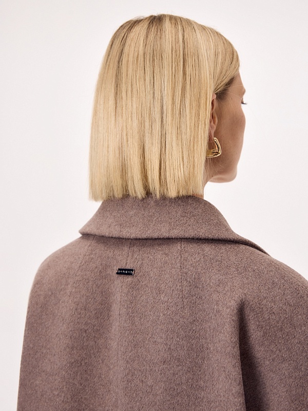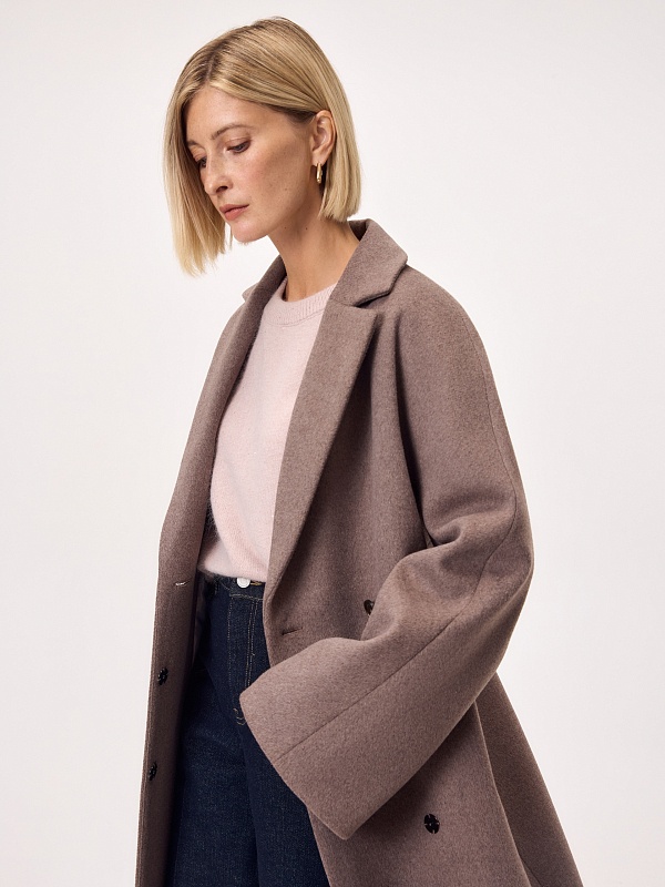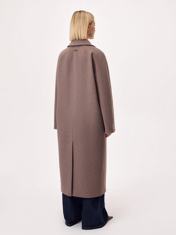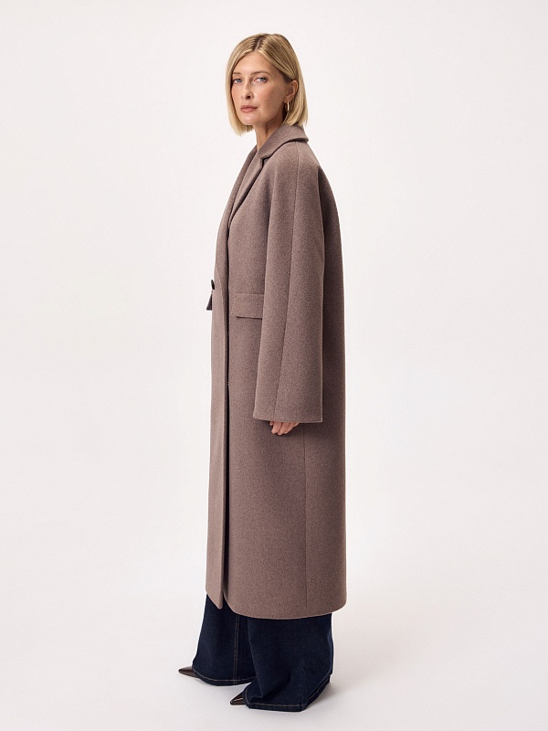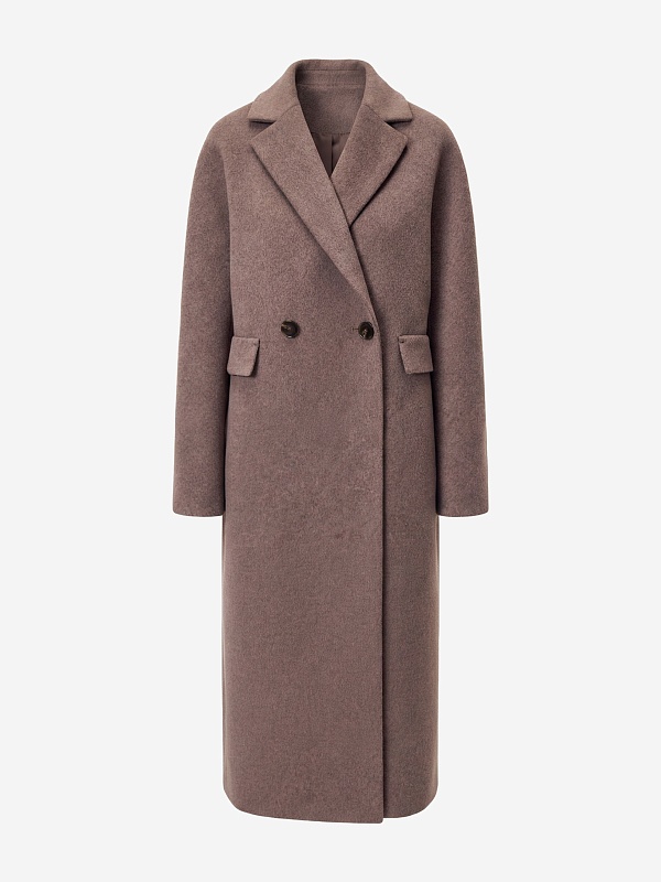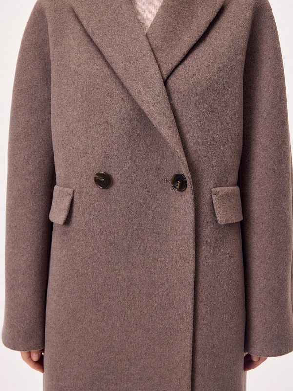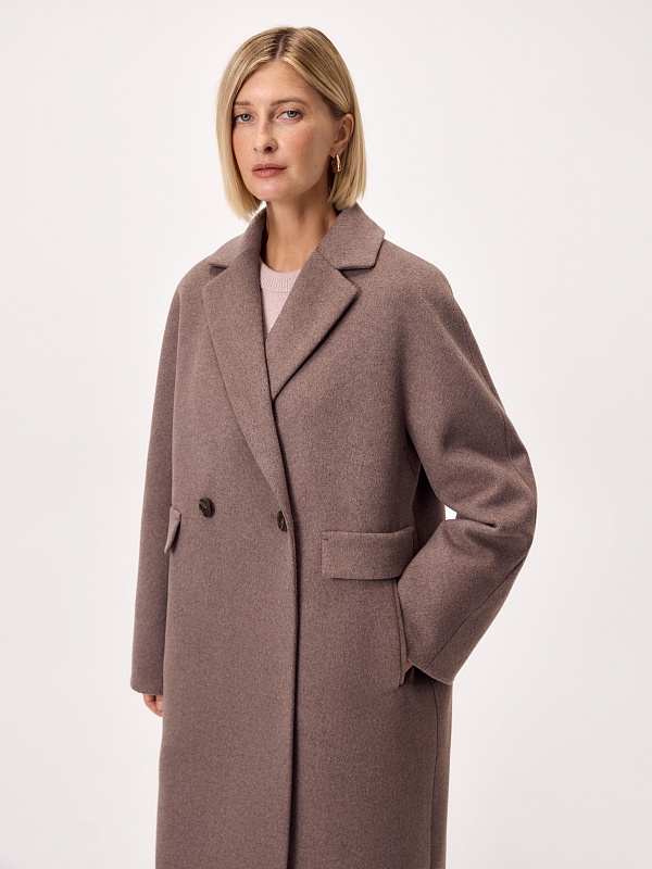 Двубортное пальто силуэта "удлиненный кокон" в модном цвете мокко. Пальто сшито из ворсовой меланжевой ткани с высоким содержанием натуральной шерсти. Пальто имеет английский воротник с узким лацканом и широкие цельнокроеные рукава "кимоно" европейской длины 7/8 с отворачивающимися манжетами по низу. Застежка на две крупных пуговицы и кнопки. Длина изделия до середины икры. Декоративным элементом служат карманы с узкими листочками и широкими клапанами. Для наилучшей защиты от непогоды изделие выполнено с использованием высокотехнологичной мембраны RaftPro. Произведено в Санкт-Петербурге.