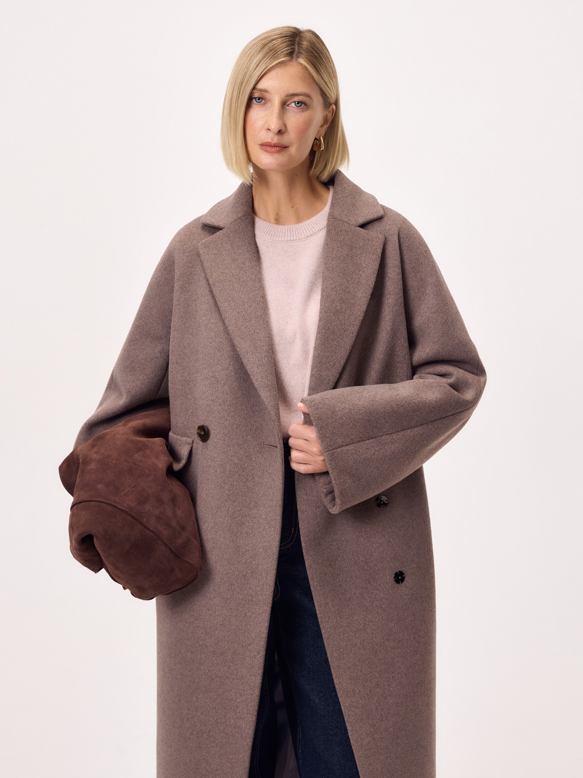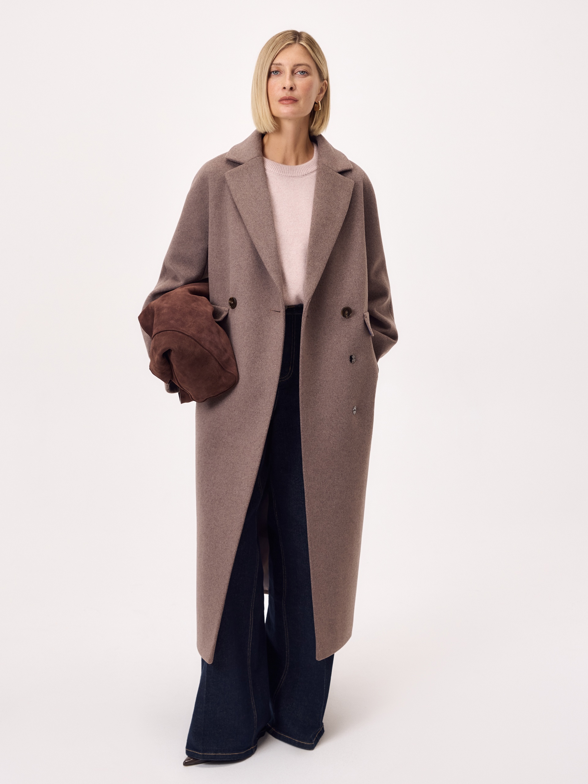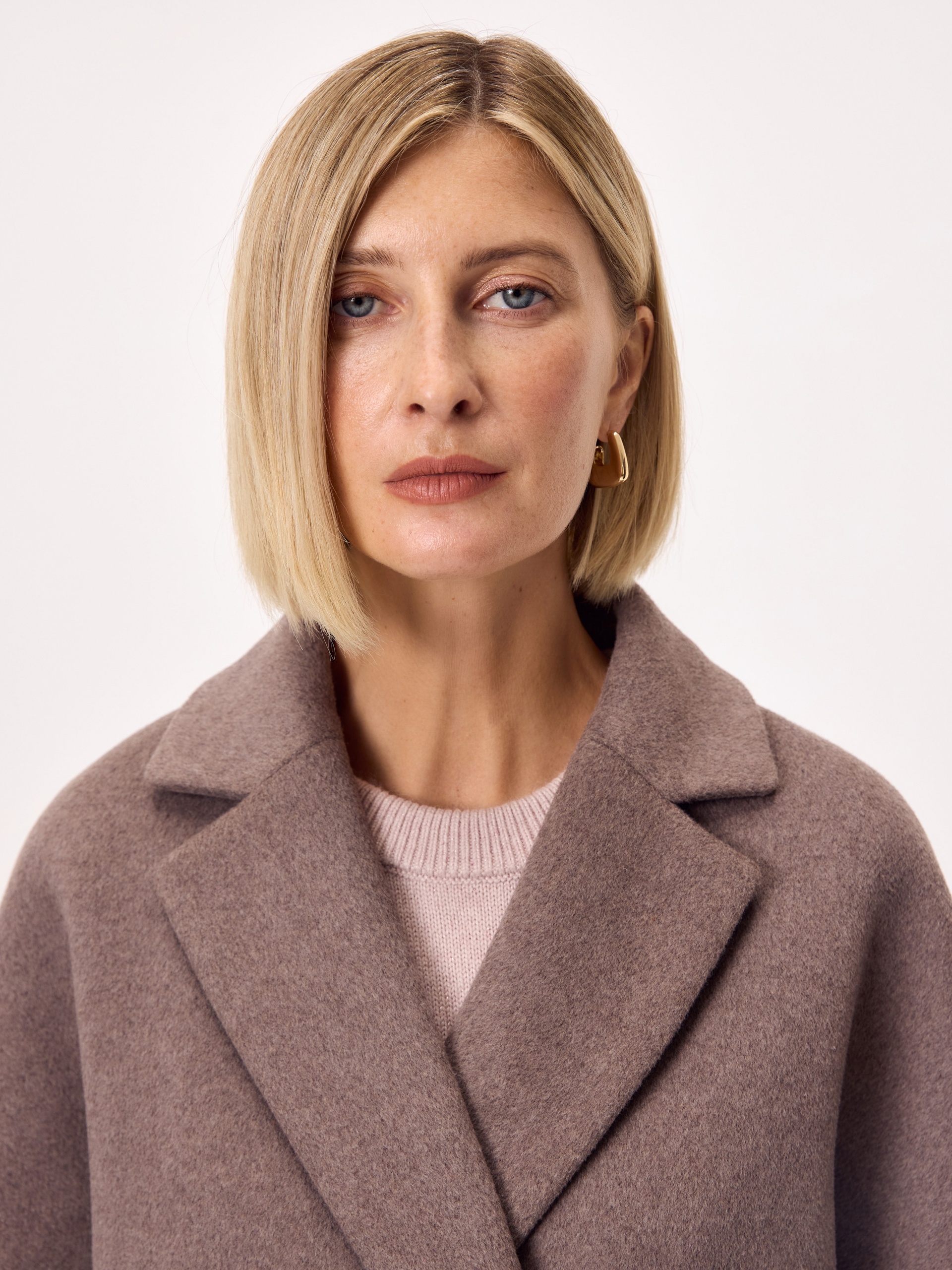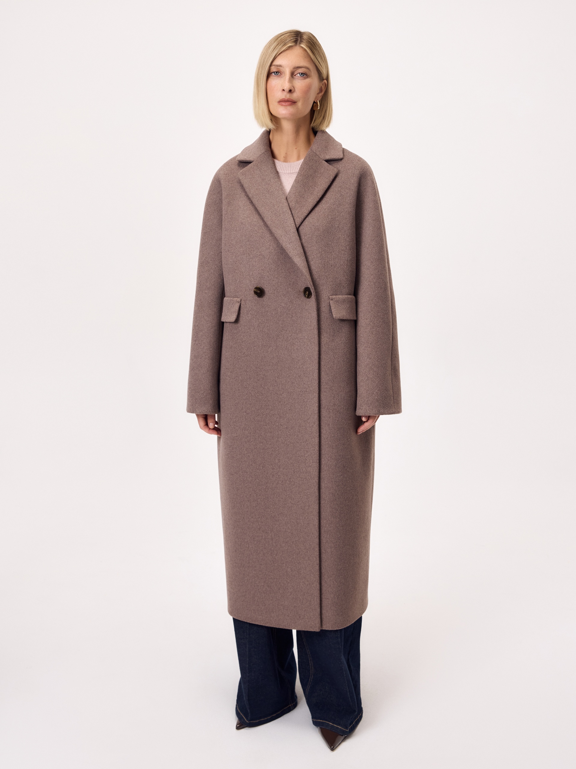 Двубортное пальто силуэта "удлиненный кокон" в модном цвете мокко. Пальто сшито из ворсовой меланжевой ткани с высоким содержанием натуральной шерсти. Пальто имеет английский воротник с узким лацканом и широкие цельнокроеные рукава "кимоно" европейской длины 7/8 с отворачивающимися манжетами по низу. Застежка на две крупных пуговицы и кнопки. Длина изделия до середины икры. Декоративным элементом служат карманы с узкими листочками и широкими клапанами. Для наилучшей защиты от непогоды изделие выполнено с использованием высокотехнологичной мембраны RaftPro. Произведено в Санкт-Петербурге.