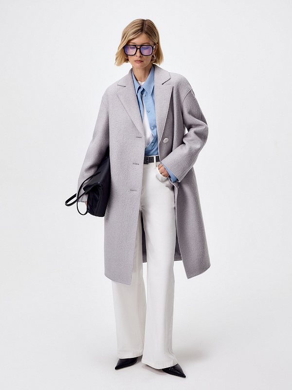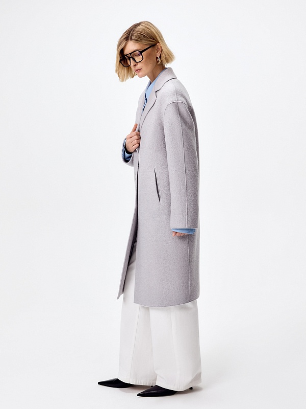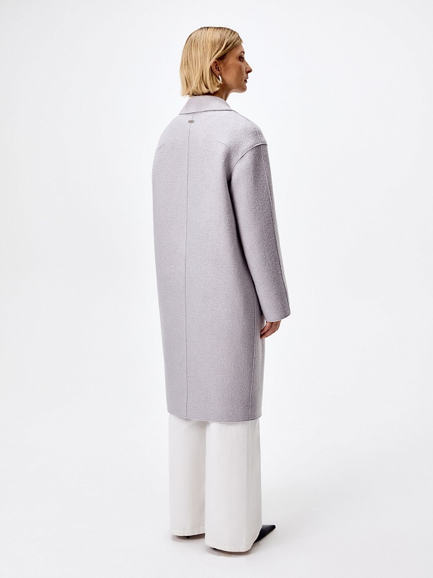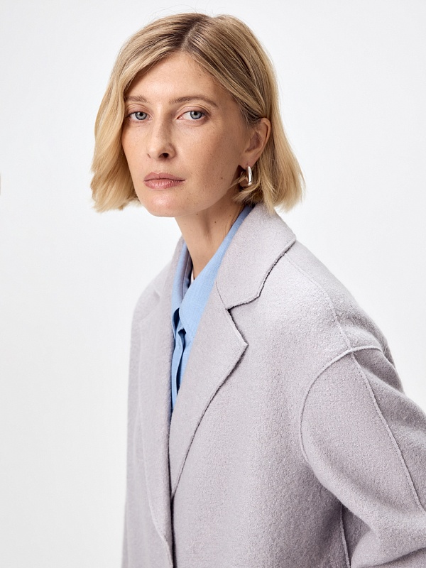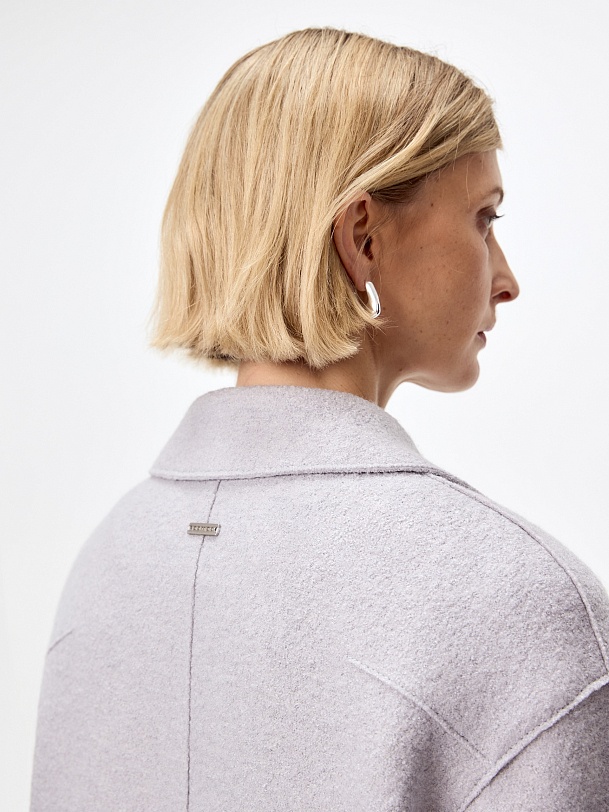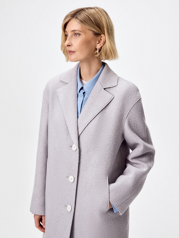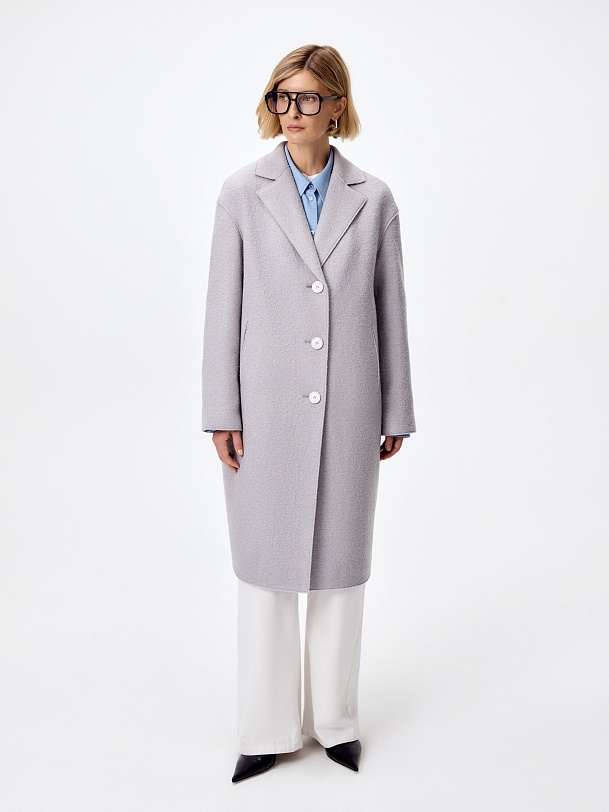 Однобортное лаконичное пальто-кокон из ткани "вареная шерсть" в нежном серо-жемчужном оттенке. Английский воротник с зауженным лацканом и втачной спущенный рукав делают пальто стильным и удобным. По бокам расположены прорезные карманы-щели. Длина пальто закрывает колено. Застегивается изделие на ряд крупных стильных пуговиц. Уникальным декоративным элементом являются открытые срезы и тонкие отделочные строчки, которые смотрятся особенно эффектно благодаря фактуре ткани. Пальто изготовлено с использованием запатентованных технологий: высокотехнологичная мембрана RaftPro надежно защищает от ветра, холода и перепада температур. Произведено в Санкт-Петербурге.