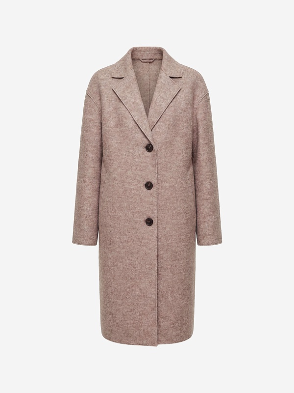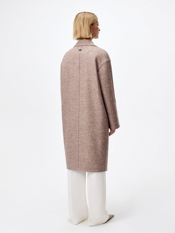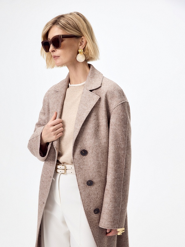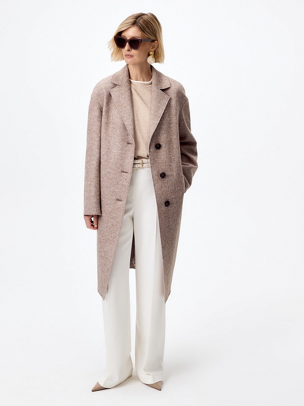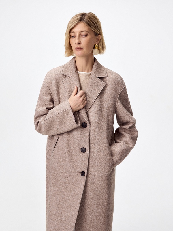 Однобортное лаконичное пальто-кокон из ткани "вареная шерсть" в нежном оттенке какао. Английский воротник с зауженным лацканом и втачной спущенный рукав делают пальто стильным и удобным. По бокам расположены прорезные карманы-щели. Длина пальто закрывает колено. Застегивается изделие на ряд крупных стильных пуговиц. Уникальным декоративным элементом являются открытые срезы и тонкие отделочные строчки, которые смотрятся особенно эффектно благодаря фактуре ткани. Пальто изготовлено с использованием запатентованных технологий: высокотехнологичная мембрана RaftPro надежно защищает от ветра, холода и перепада температур. Произведено в Санкт-Петербурге.