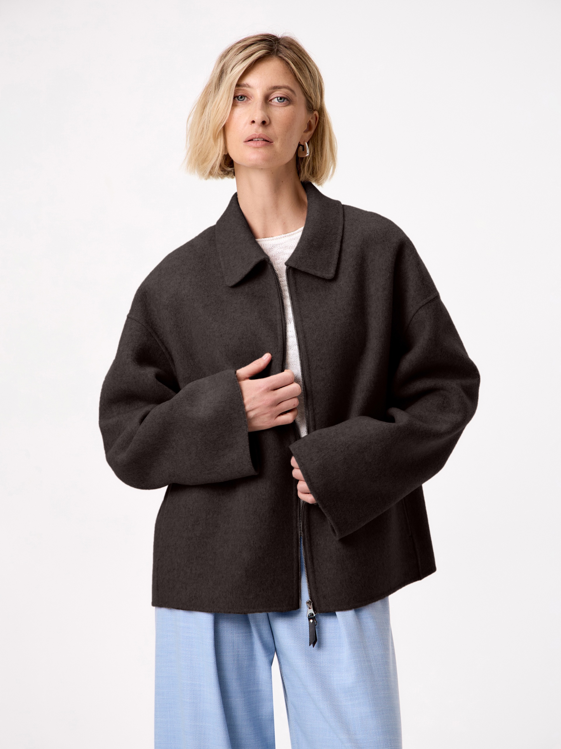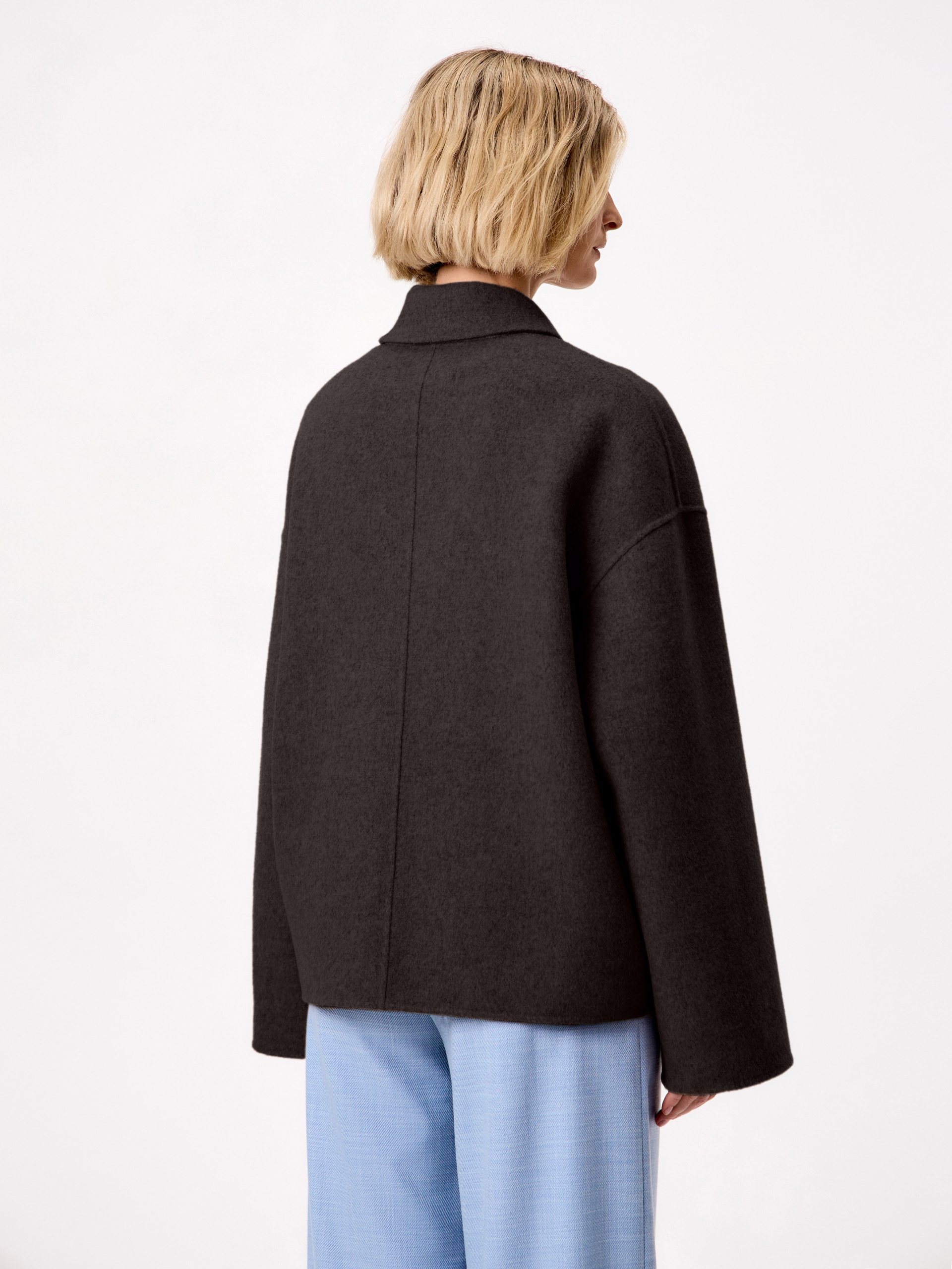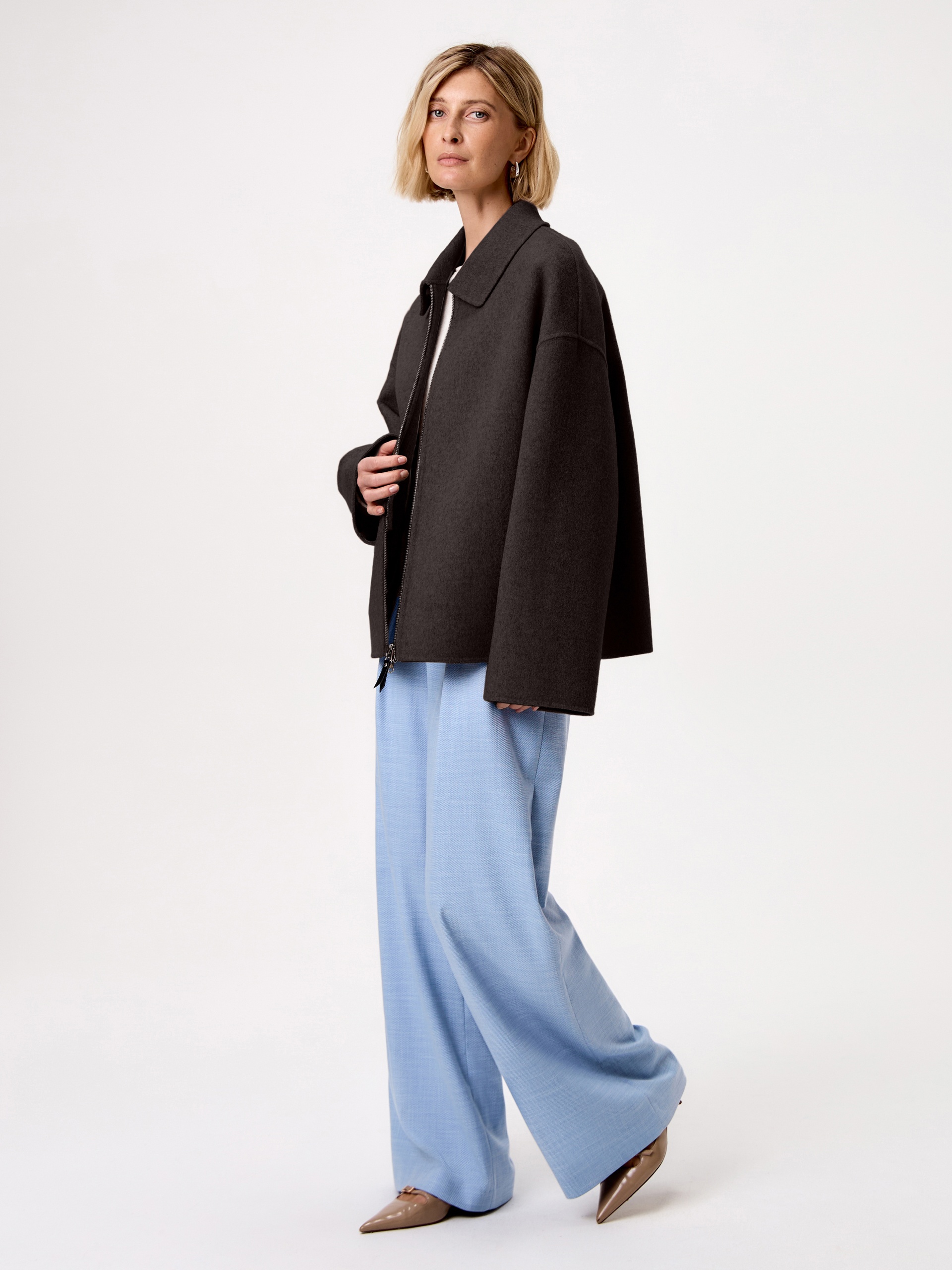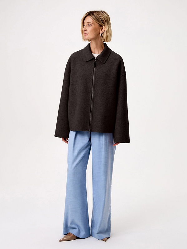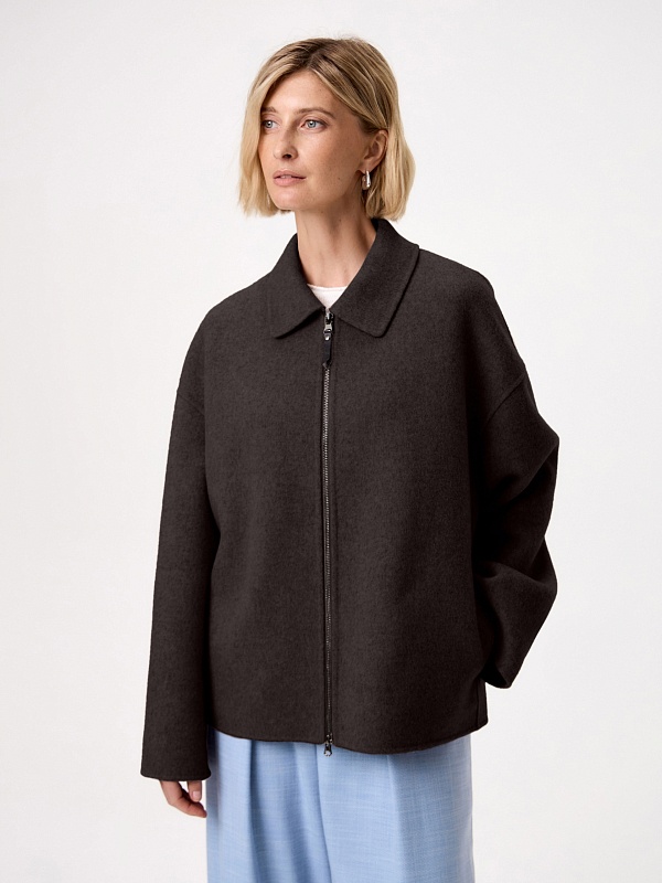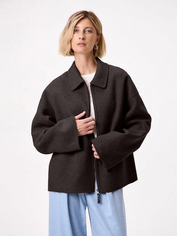 Must have весеннего сезона - легкое укороченно полупальто из ткани double face. Для этой модели мы выбрали премиальную шерстяную ткань с добавлением волокон кашемира. Трендовый шоколадный оттенок освежает образ и позволяет сочетать эту куртку с любыми изделиями. У полупальто классический отложной воротник с отрезной стойкой и просторный рубашечный рукав. В рельефных швах прячутся карманы с узкими листочками. Застежка на надежную тесьму-молнию.