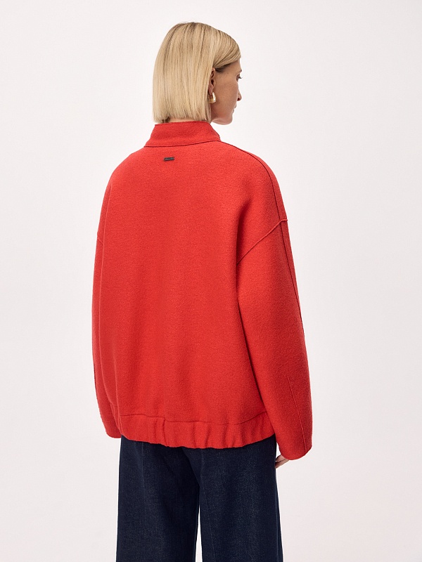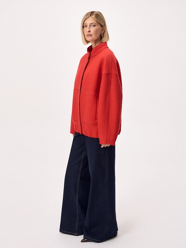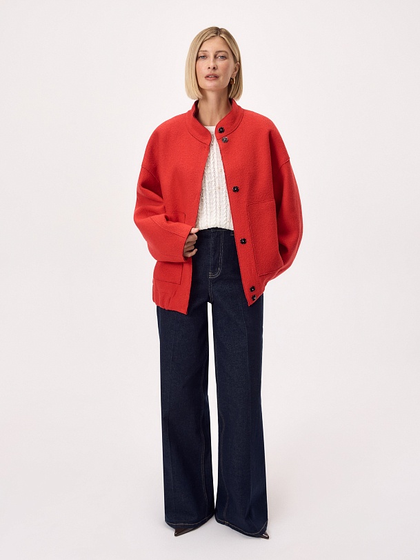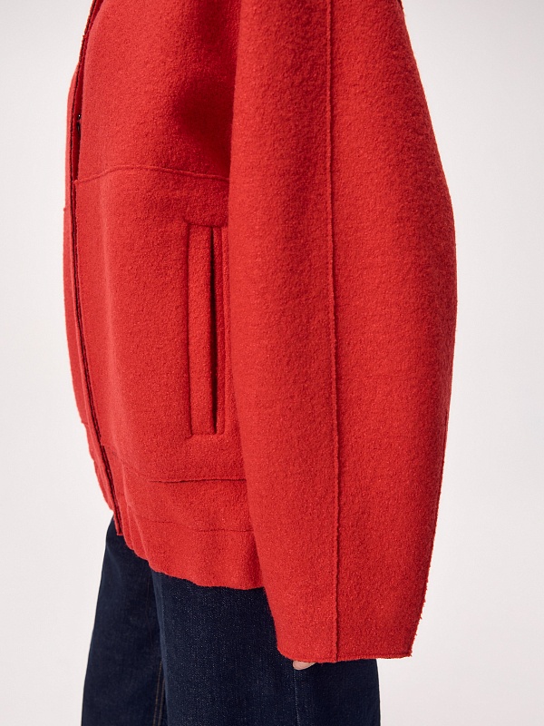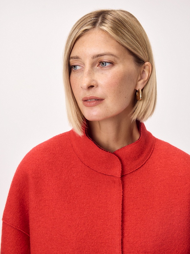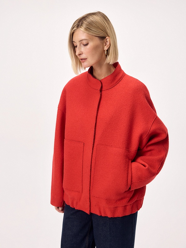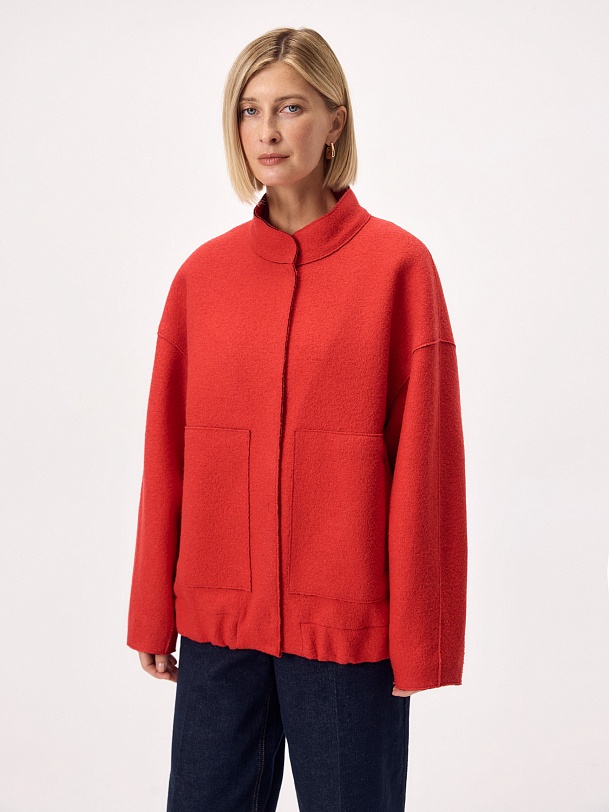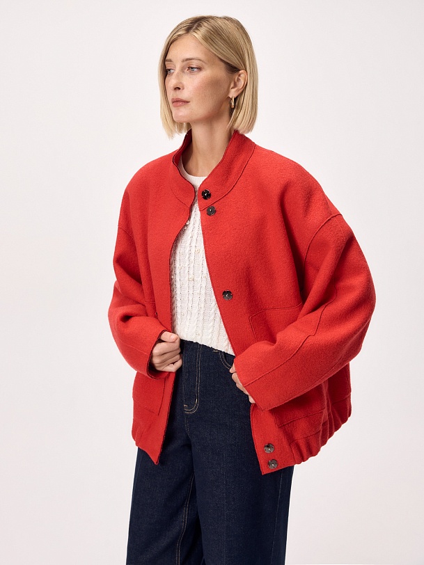 Актуальный бомбер из мягкого шерстяного букле жизнеутверждающего алого цвета, длиной до середины бедра. Изделие с центральной застежкой на кнопки, воротником-стойкой, обьемными рукавами, карманами с листочками и манжетой с резинкой по низу изделия. Куртка изготовлена с использованием запатентованных технологий: высокотехнологичная мембрана RaftPro надежно защищает от ветра, холода и перепада температур. Произведено в Санкт-Петербурге.