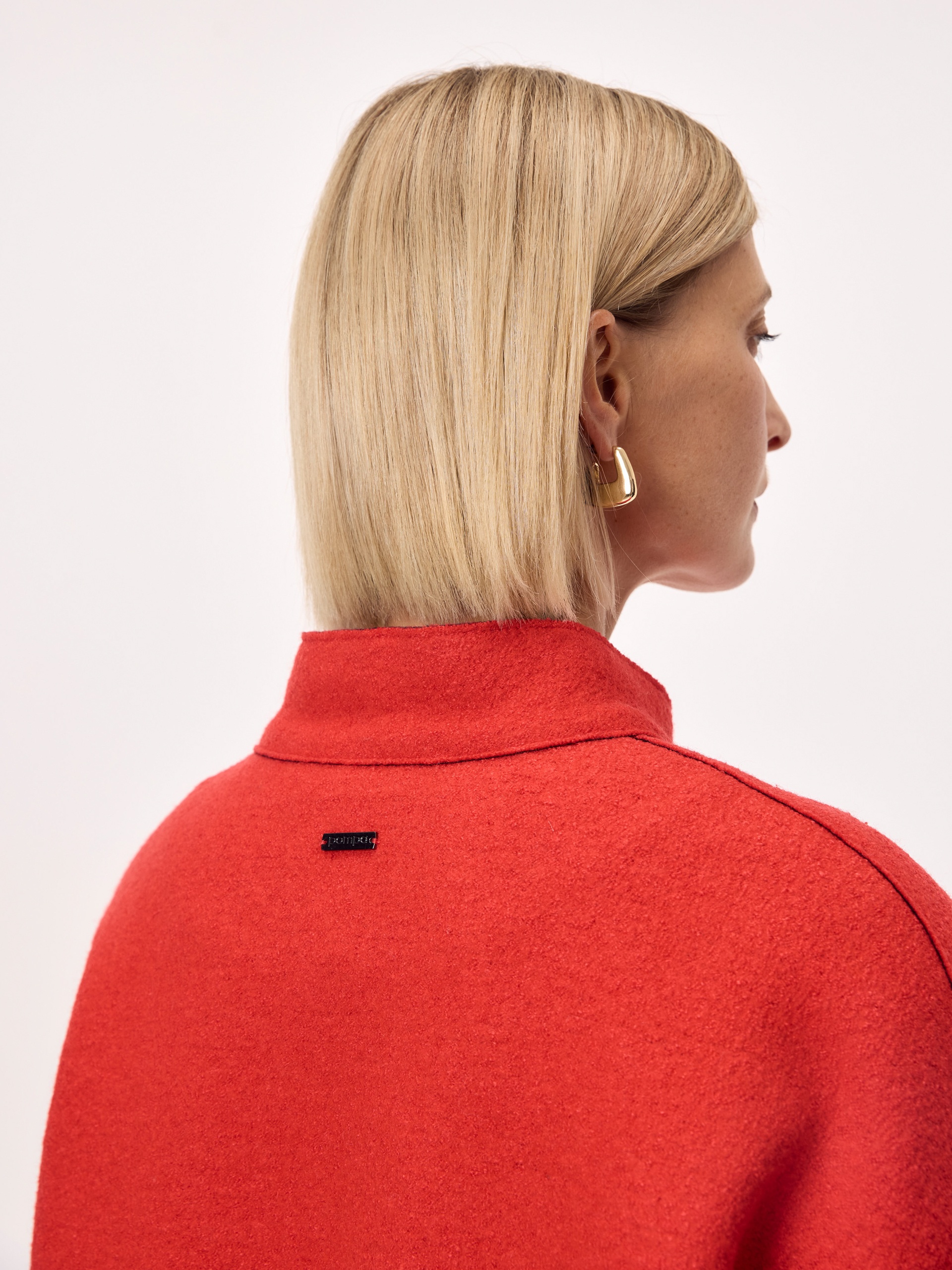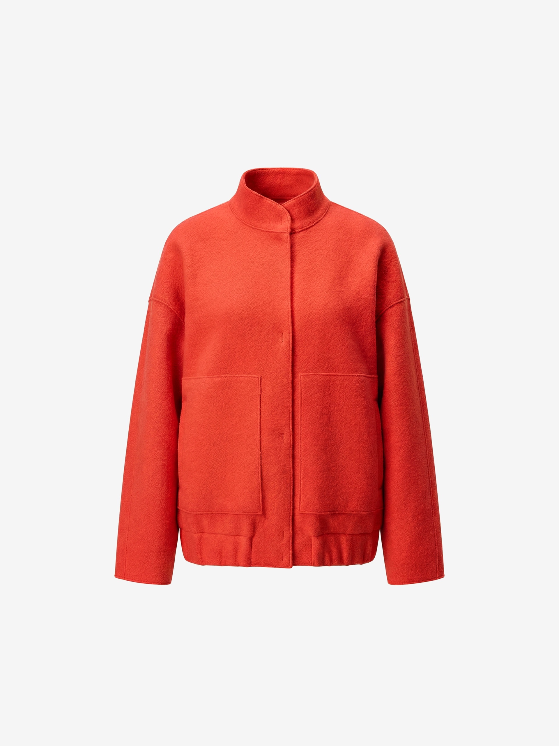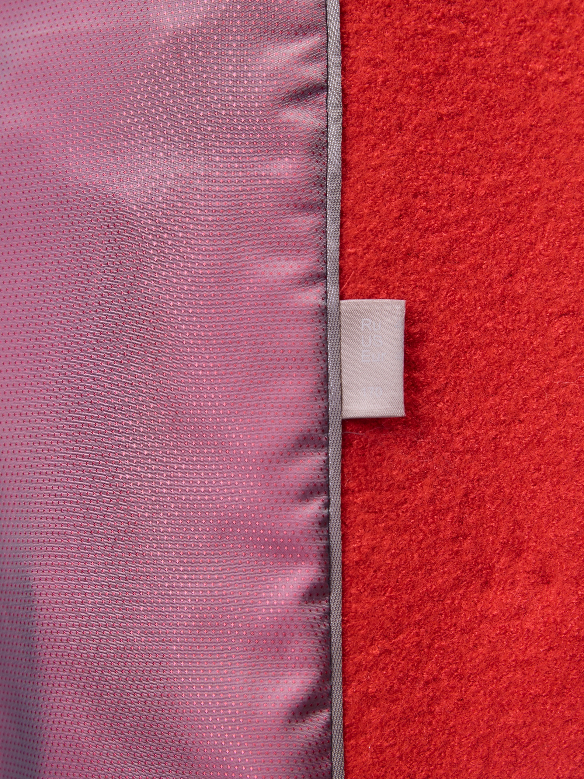 Актуальный бомбер из мягкого шерстяного букле жизнеутверждающего алого цвета, длиной до середины бедра. Изделие с центральной застежкой на кнопки, воротником-стойкой, обьемными рукавами, карманами с листочками и манжетой с резинкой по низу изделия. Куртка изготовлена с использованием запатентованных технологий: высокотехнологичная мембрана RaftPro надежно защищает от ветра, холода и перепада температур. Произведено в Санкт-Петербурге.