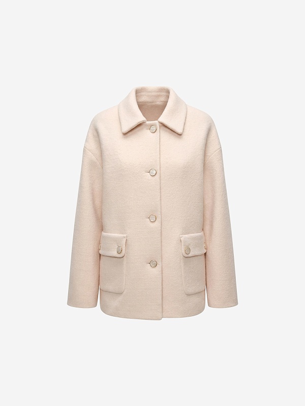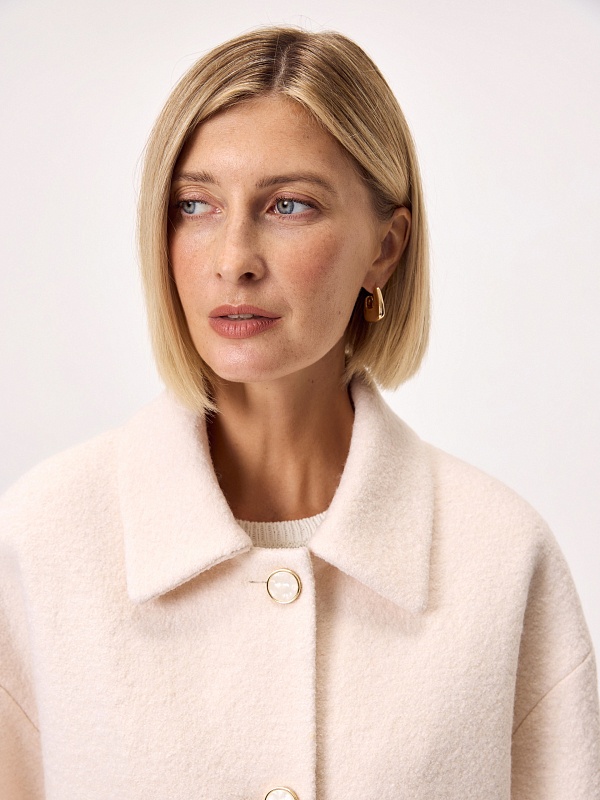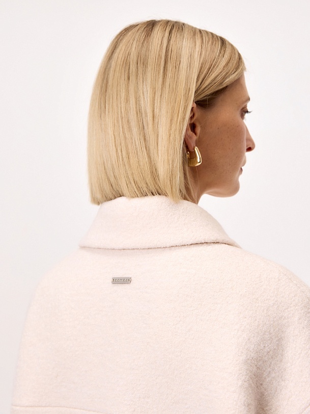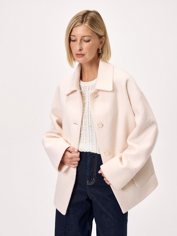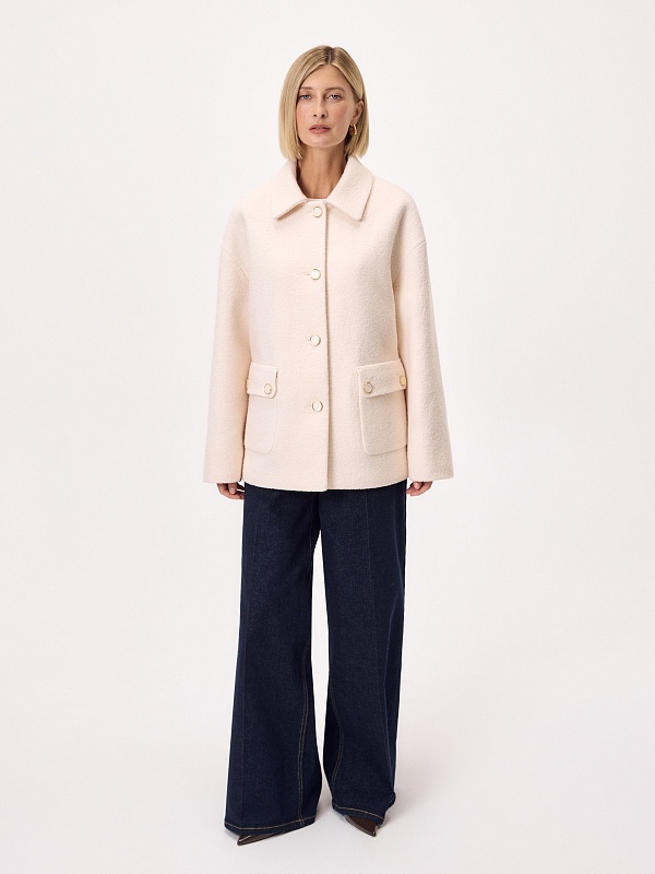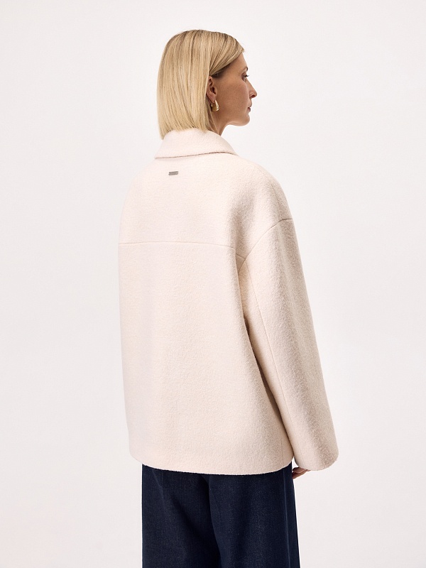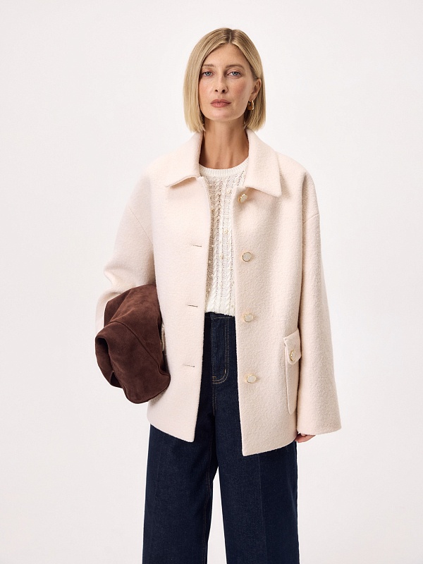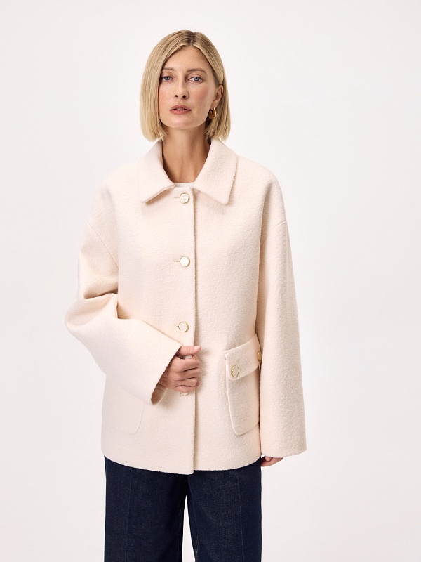 Лаконичная куртка из нежной буклированной шерстяной ткани в перламутровом оттенке. Модель однобортная, с отложным воротником и накладными карманами с клапанами. Свободный рубашечный рукав не стесняет движений, а изящные перламутровые пуговицы подчёркивают изысканность пальто. Такая куртка станет незаменимым спутником в прохладные весенние дни, а высокотехнологичная мебрана Raft Pro. расположенная в спинке изделия, надежно защитит от пронизывающего ветра Изделие на подкладке. Произведено в Санкт-Петербурге.