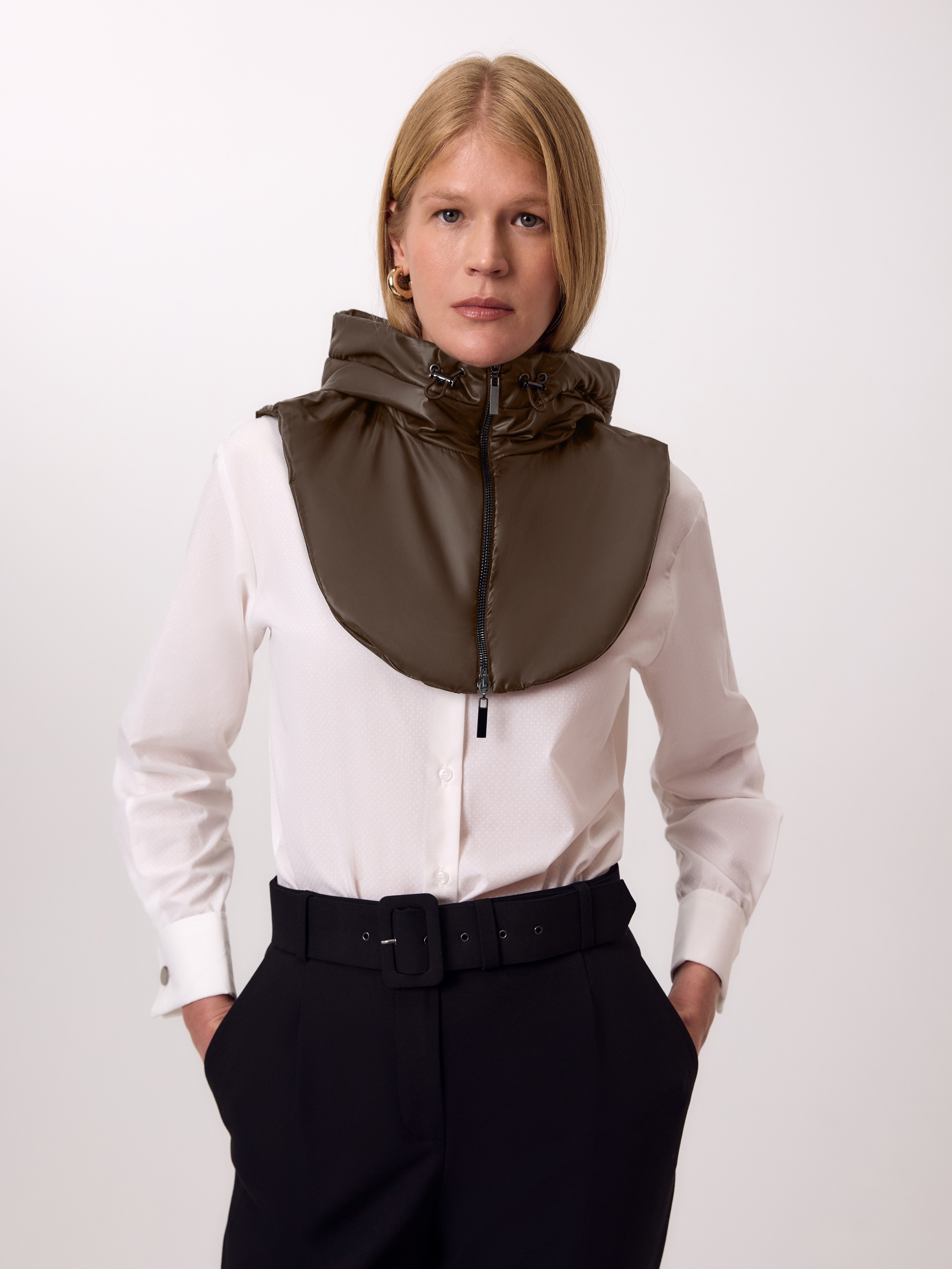 Съемный утепленный капюшон из плащевой ткани с водоотталкивающим покрытием. Капюшон имеет манишку и застежку на молнию. По бокам располагаются два мягких фиксатора для регулирования объема. Такой капюшон послужит прекрасным дополнением к любому образу с пальто из нашей коллекции и надежно защитит от непогоды. Произведено в Санкт-Петербурге.