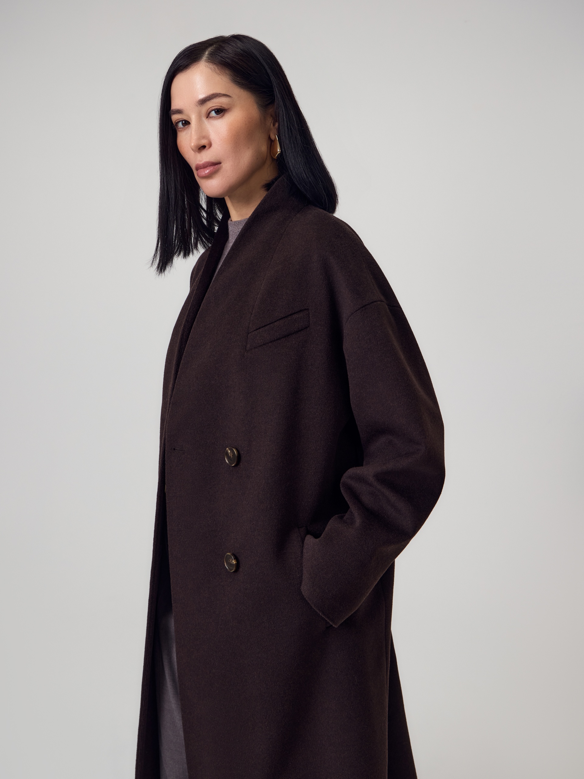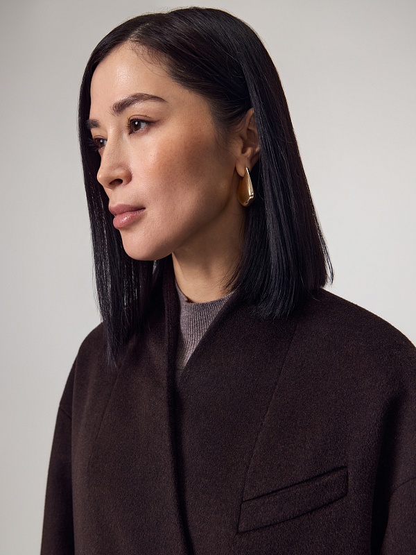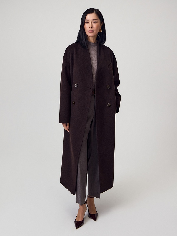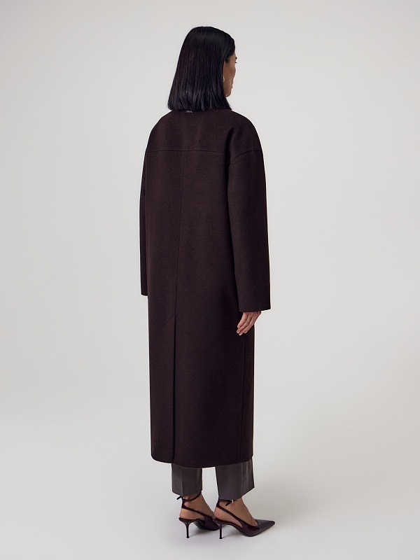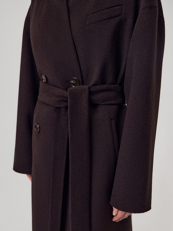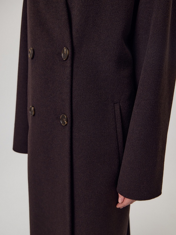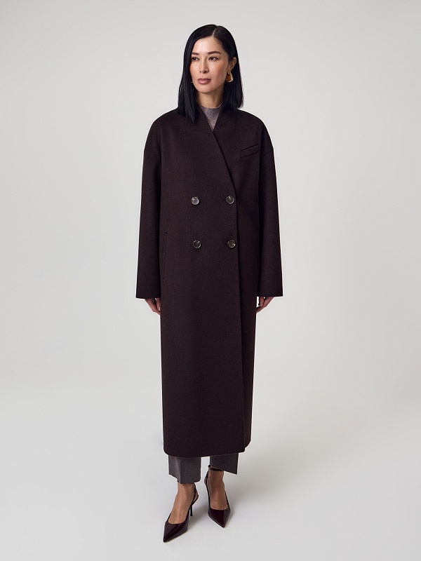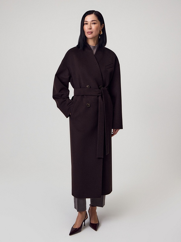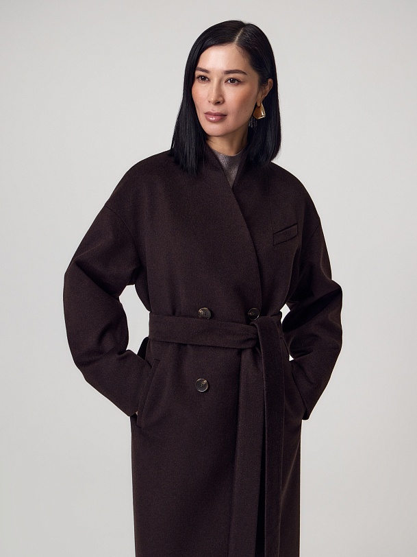 Длинное двубортное пальто из ворсовой ткани с высоким содержанием натуральной шерсти в классическом оттенке горького шоколада. Пальто имеет новый цельнокроенный воротник-стойку и мягкий рубашечный рукав. На груди расположена декоративная листочка, по бокам вместительные карманы. Спинка пальто с широкой кокеткой и высокой шлицей. В комплекте с пальто предлагается пояс из основной ткани. А для наилучшей защиты от непогоды пальто выполнено с использованием высокотехнологичной мембраны RaftPro и инновационного утеплителя DuPont Sorona. Произведено в Санкт-Петербурге.