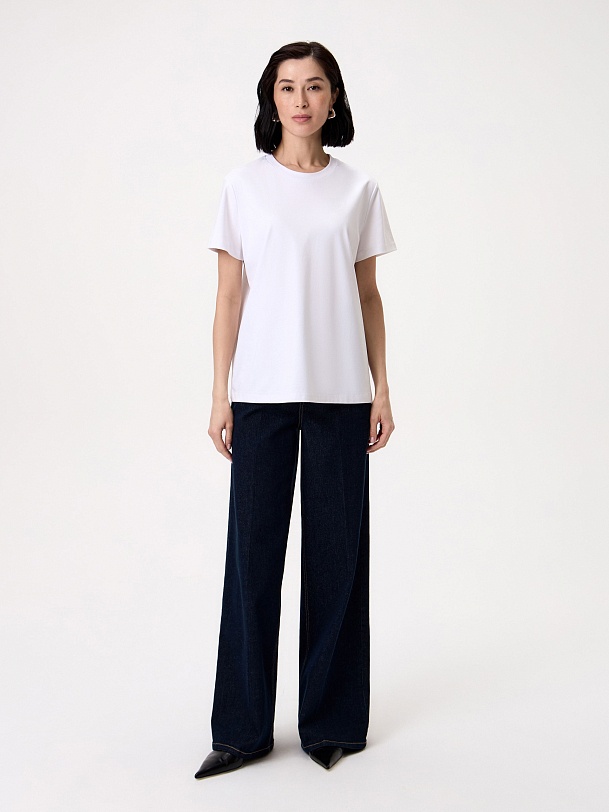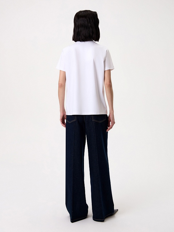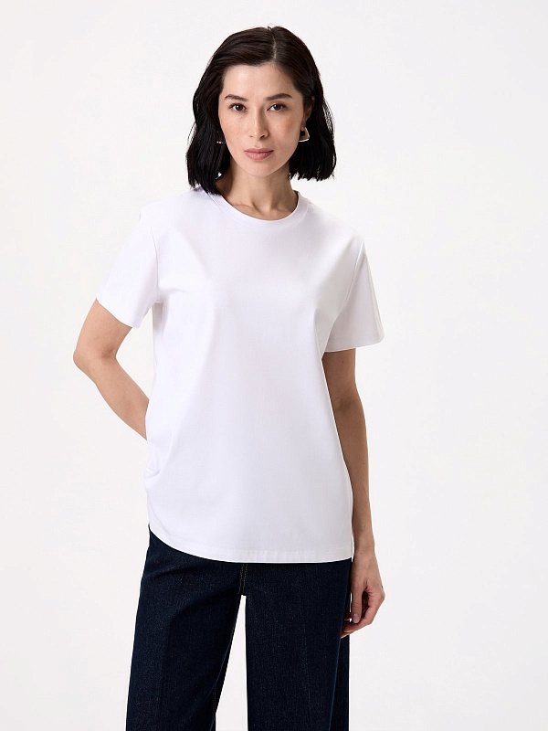 Футболка прямого силуэта в белом цвете будет прекрасно сочетаться как с джинсовыми изделиями, так и с классическими ансамблями. Мерсеризованный хлопок имеет шелковистый блеск и не деформируется после стирок, практически не мнется и не выцветает со временем.