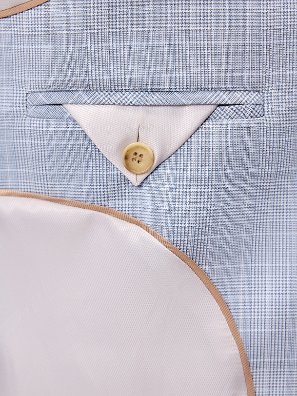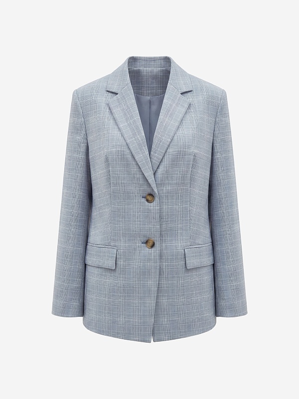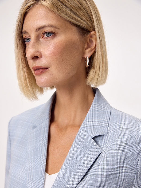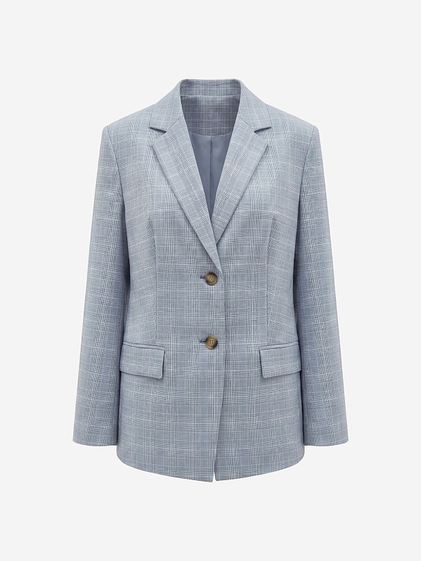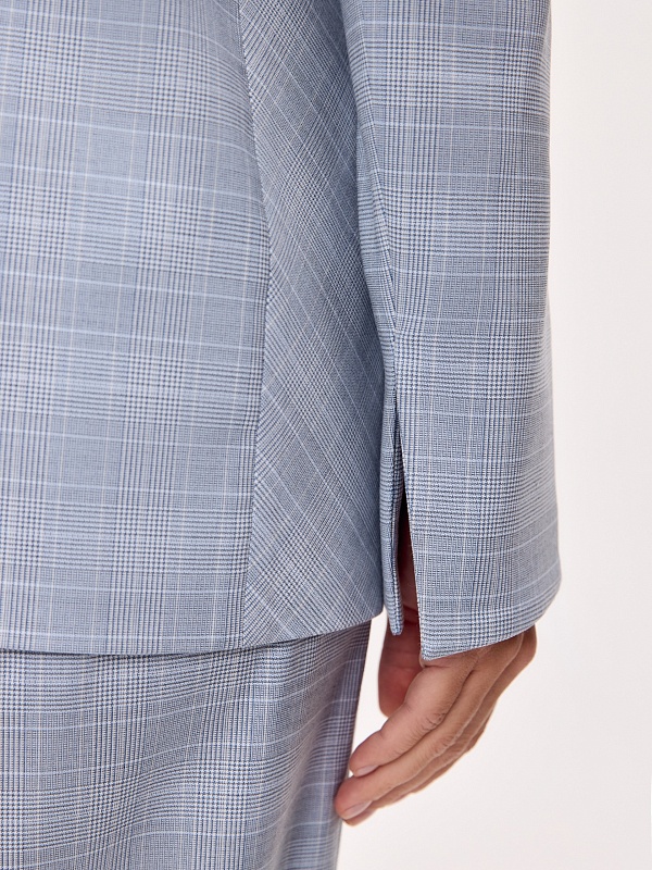 Прямой удлиненный однобортный жакет в мужском стиле с расширенной линией плеча из костюмной вискозной ткани в голубо-серую клетку. С активными лацканами и скошенной линией борта по мотивам мужского жакета. Жакет с застежкой на 2 пуговицы, на полочке прорезные карманы с листочками. Составит идеальную пару с брюками из одной ткани или компаньоном в голубом цвете.