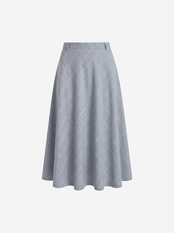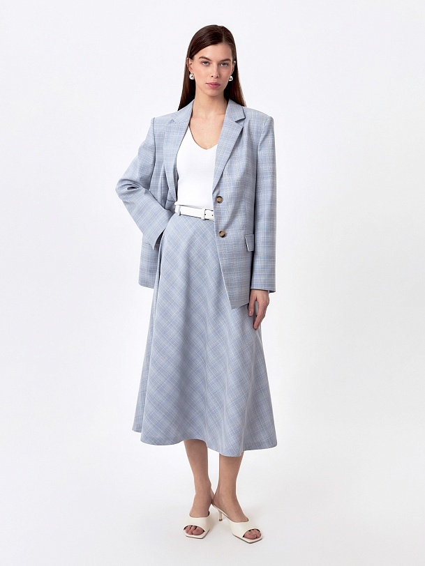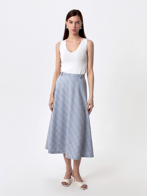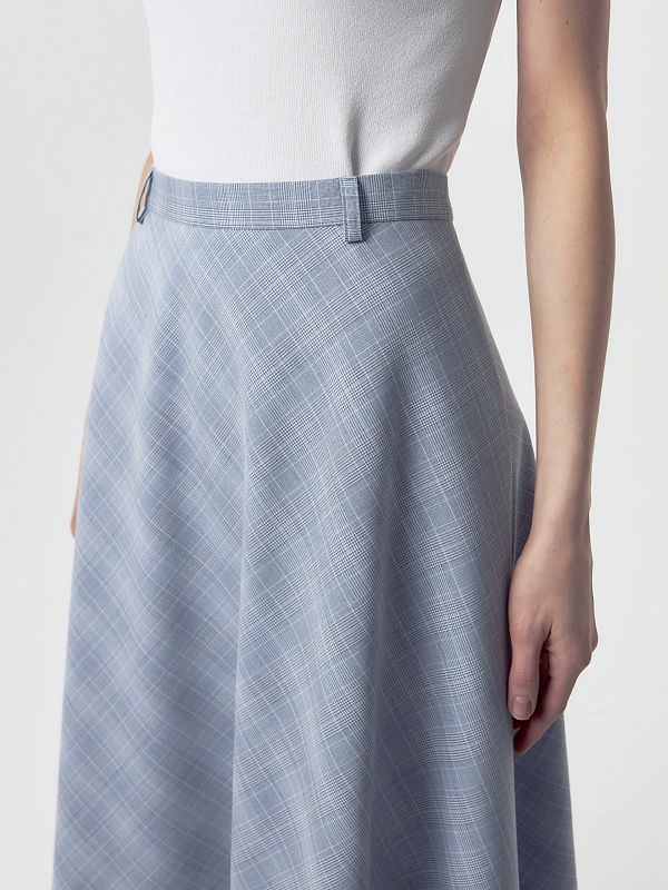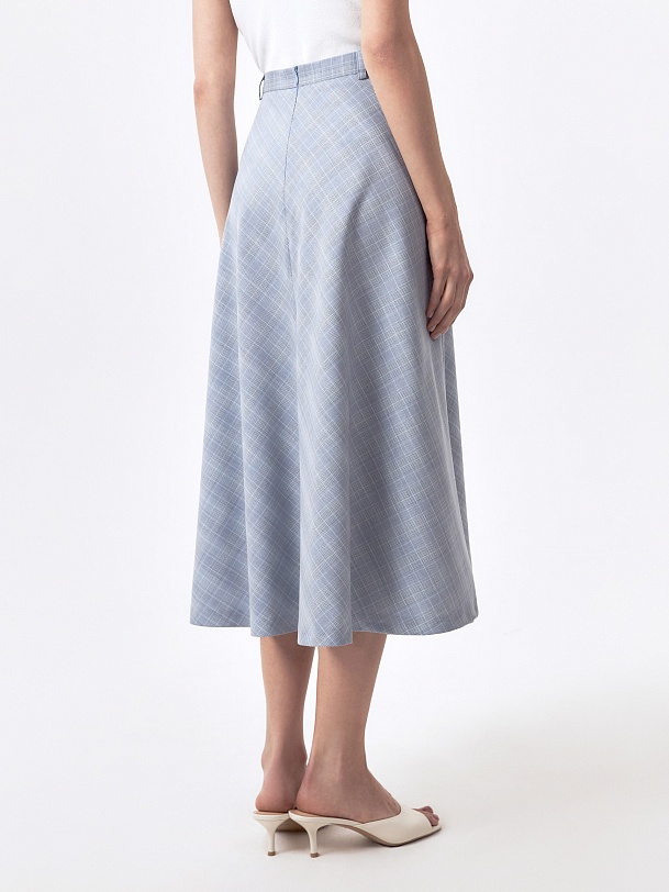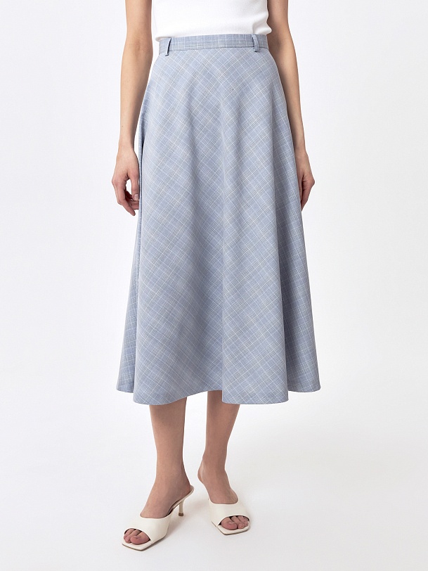 Юбка-миди трапеция из костюмной вискозной ткани в голубо-серую клетку по косой. Юбка на талии с прямым поясом. Потайная молния в боковом шве.