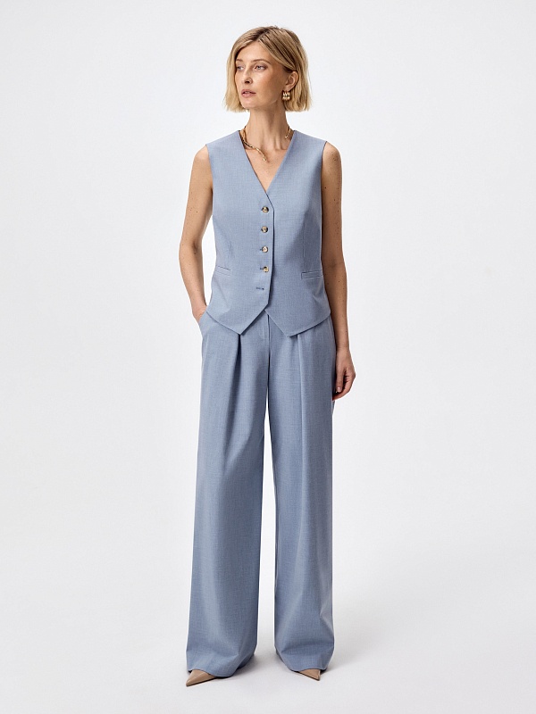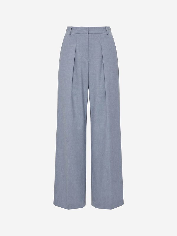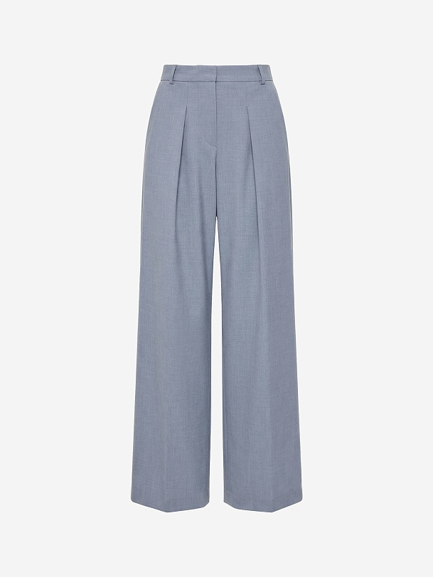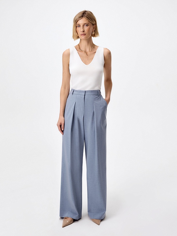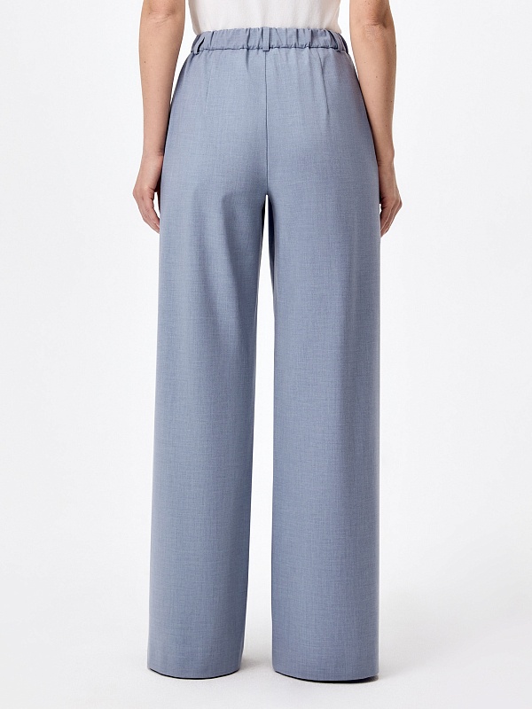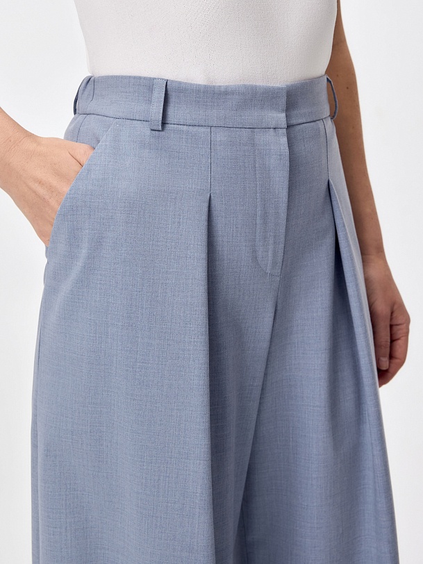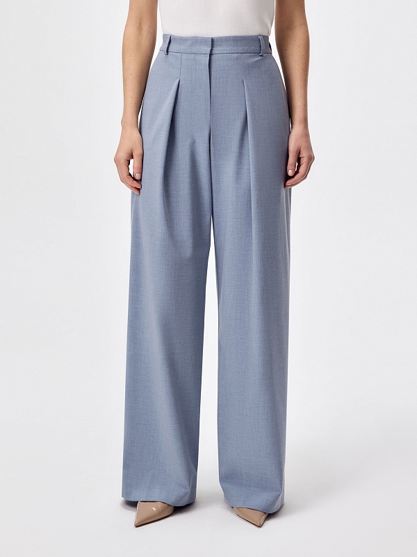 Прямые широкие брюки со складками на высокой посадке с притачным поясом. Брюки выполнены из костюмной ткани голубого цвета. Имеют два функциональных кармана по бокам и резинку на спинке для комфортной посадки.
