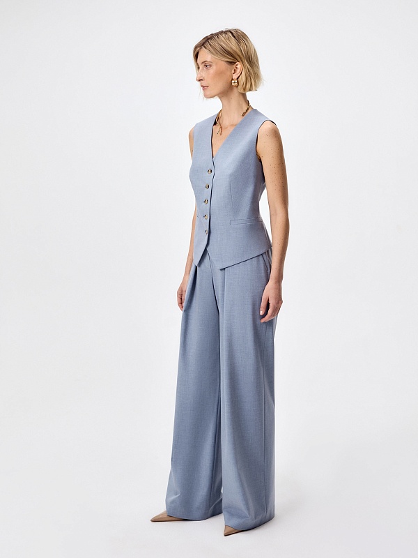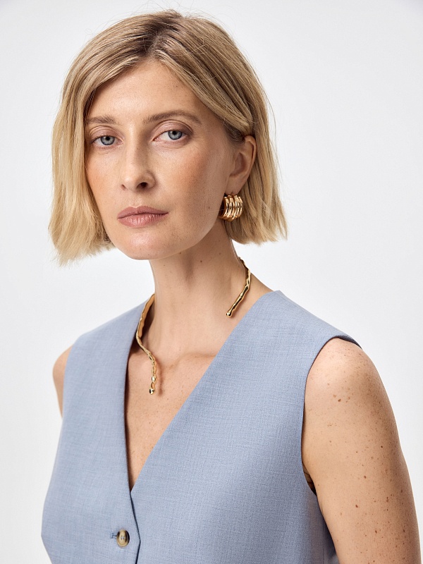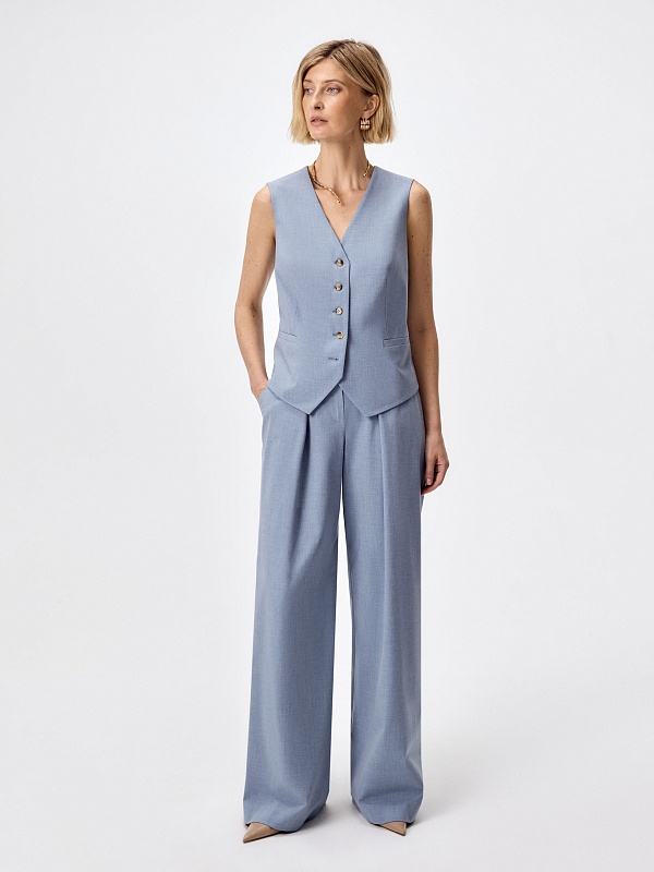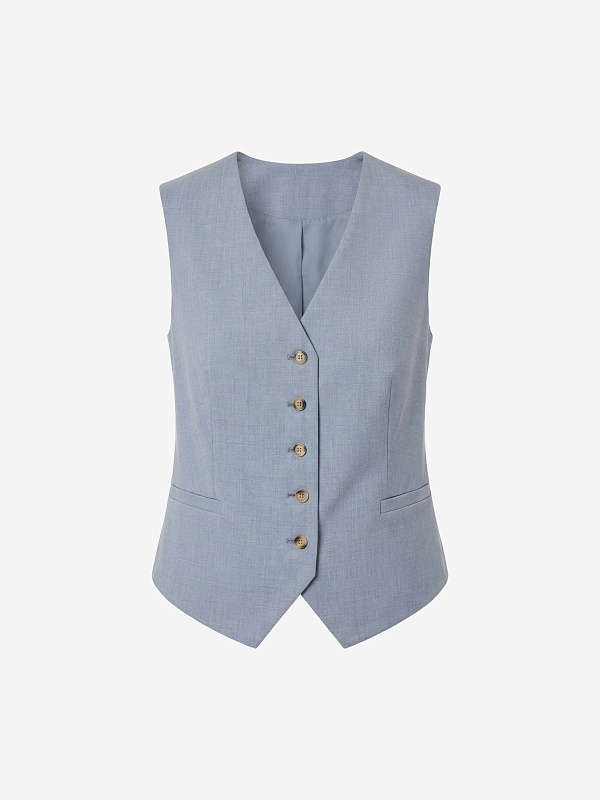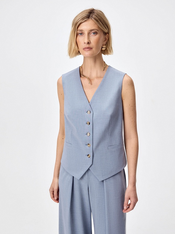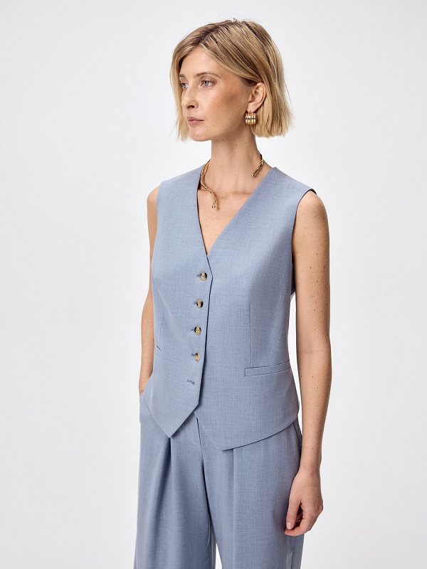 Прямой жилет с V-образным вырезом и листочками. Жилет выполнен из костюмной ткани голубого цвета на подкладке. Составит идеальный комплект с жакетом в клетку.