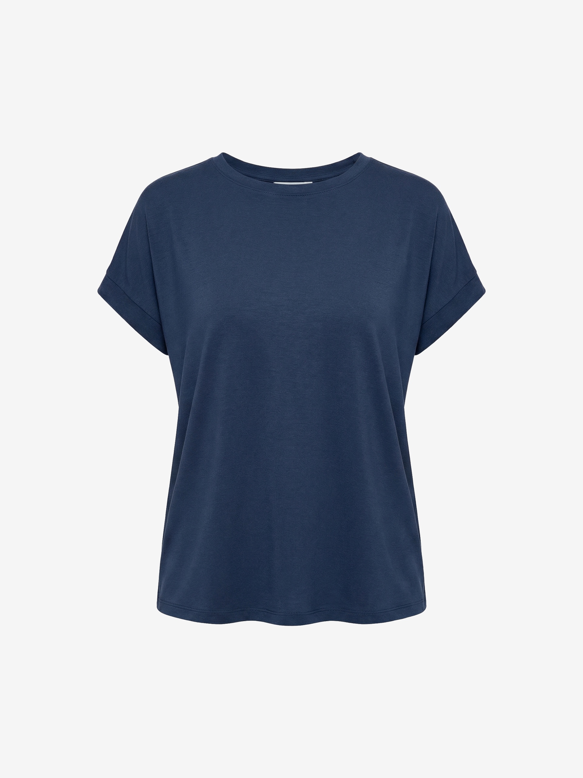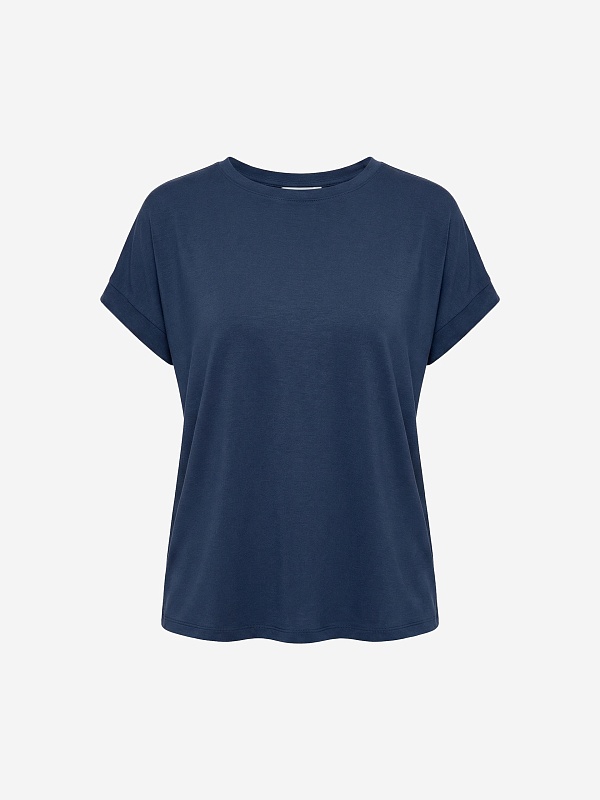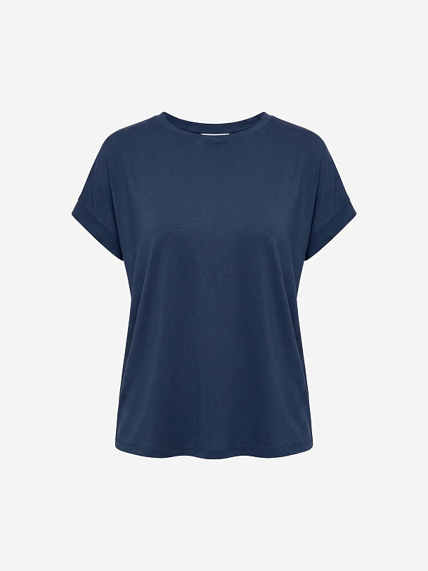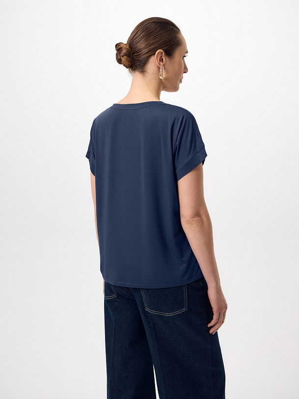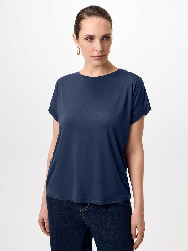 Мягкая футболка из модала в благородном серо-голубом цвете отлично впишется в ваш гардероб. Горловина в форме лодочки, рукава цельнокроеные, наподобие кимоно.