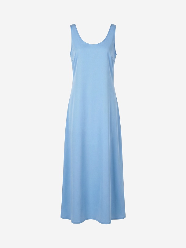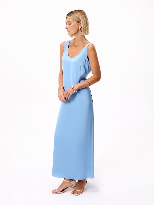 Платье-макси прилегающего силуэта из атласной ткани с голубого цвете. Платье-майка с потайной молнией в боковом шве.