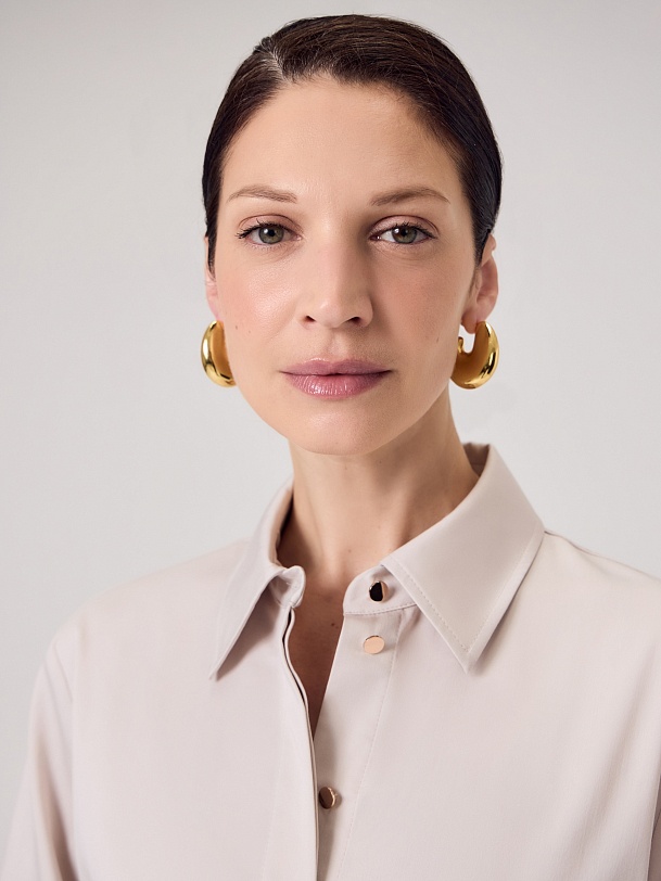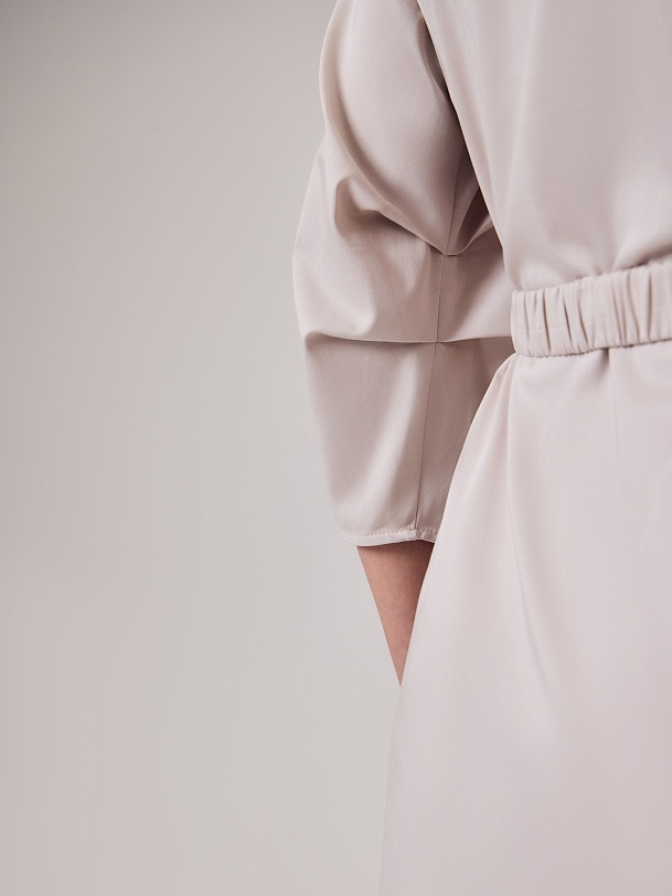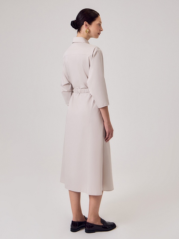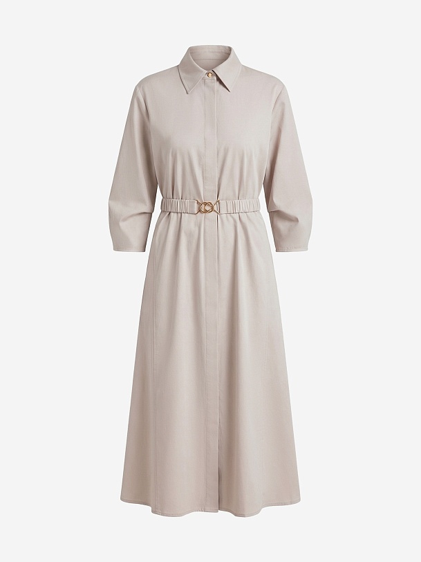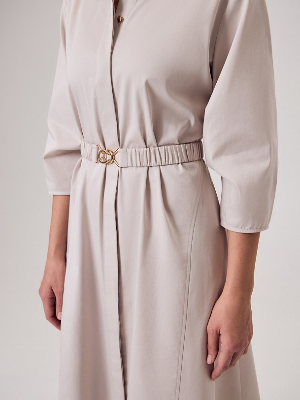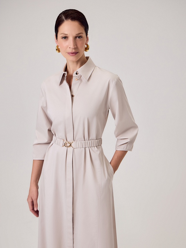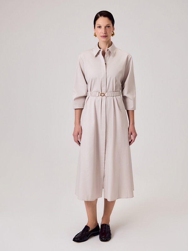 Полуприлегающее платье-миди из хлопковой ткани светло-бежевого цвета с классическим отложным воротником и потайной застежкой на пуговицы, рукав втачной со спущенной линией плеча 3/4 и складками в районе локтя. По бокам клинья для придания выразительности фигуры.