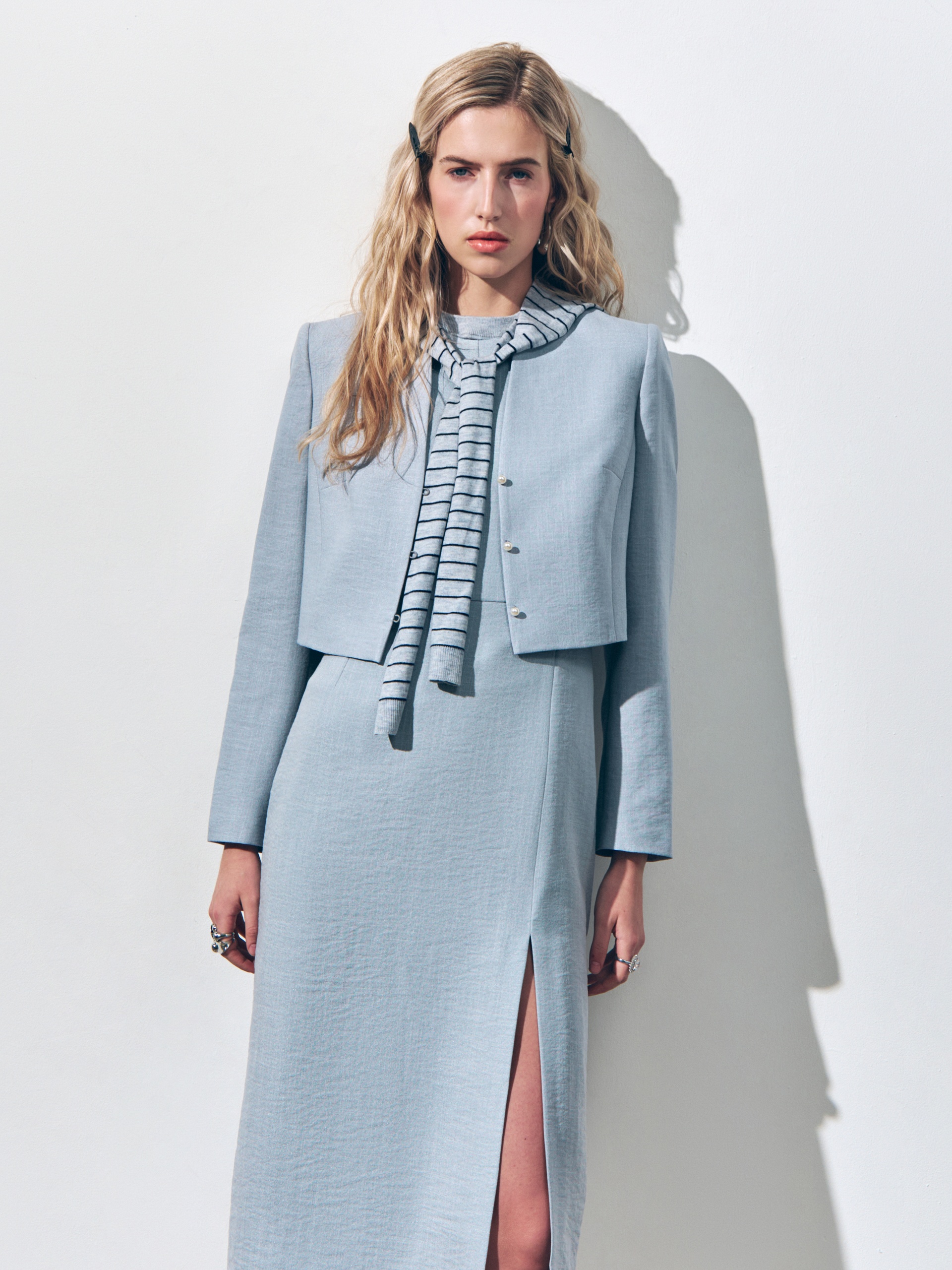 Укороченный жакет прилегающего силуэта на подкладке. Перед с центральной застежкой на пуговицы-жемчужины, с рельефными швами. Спинка со средним швом и рельефными швами. Рукав втачной полной длины. Воротник цельнокроеная стойка по переду, по спинке втачной воротник-стойка. Жакет будет прекрасно смотреться в комплекте с платьем из единого материала.