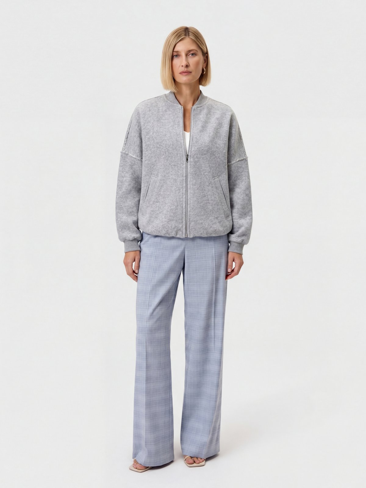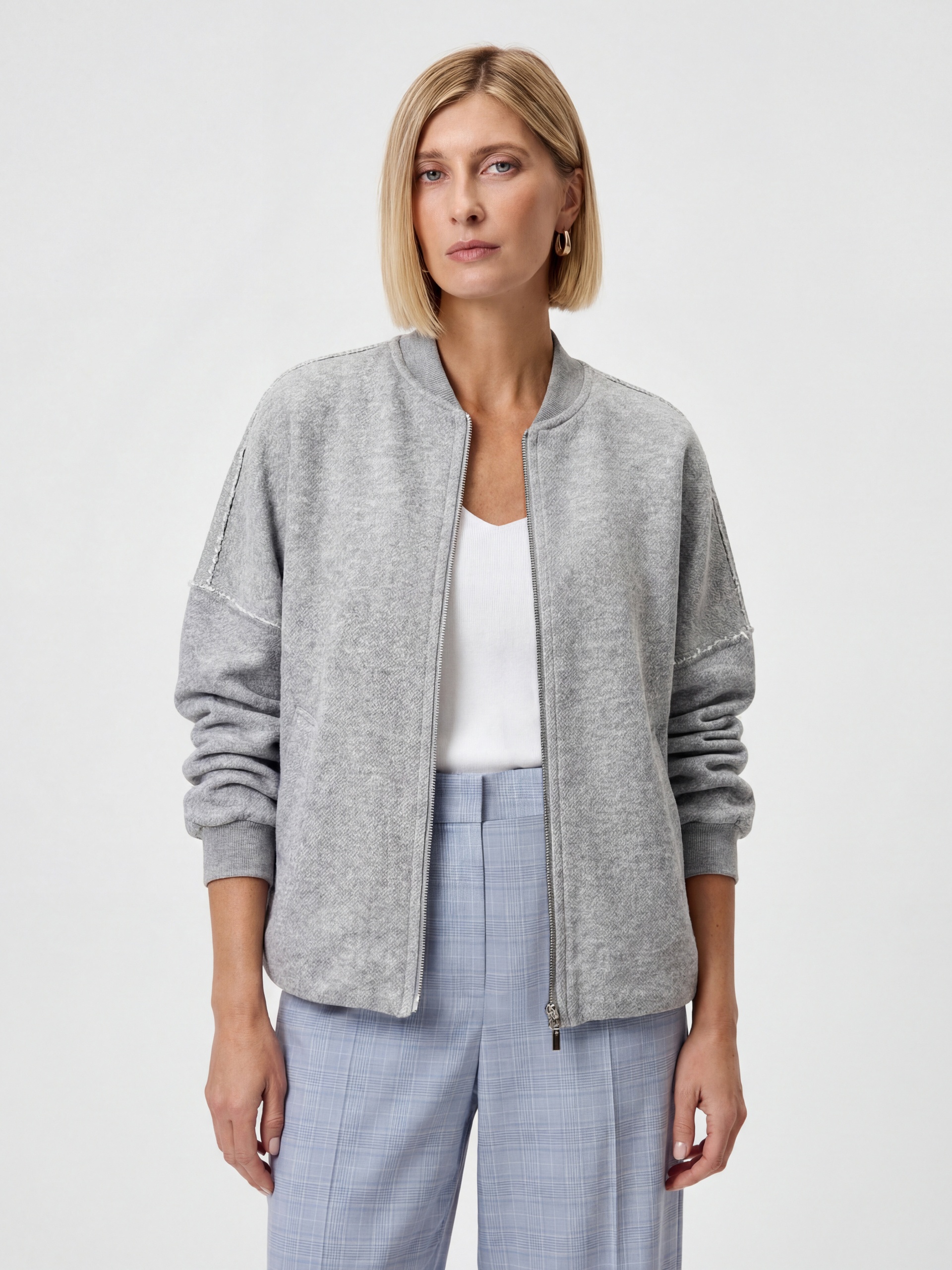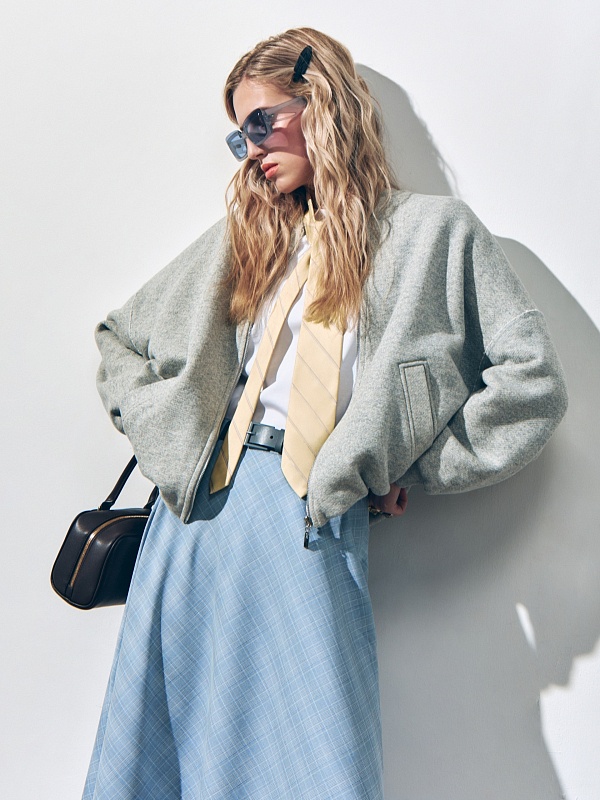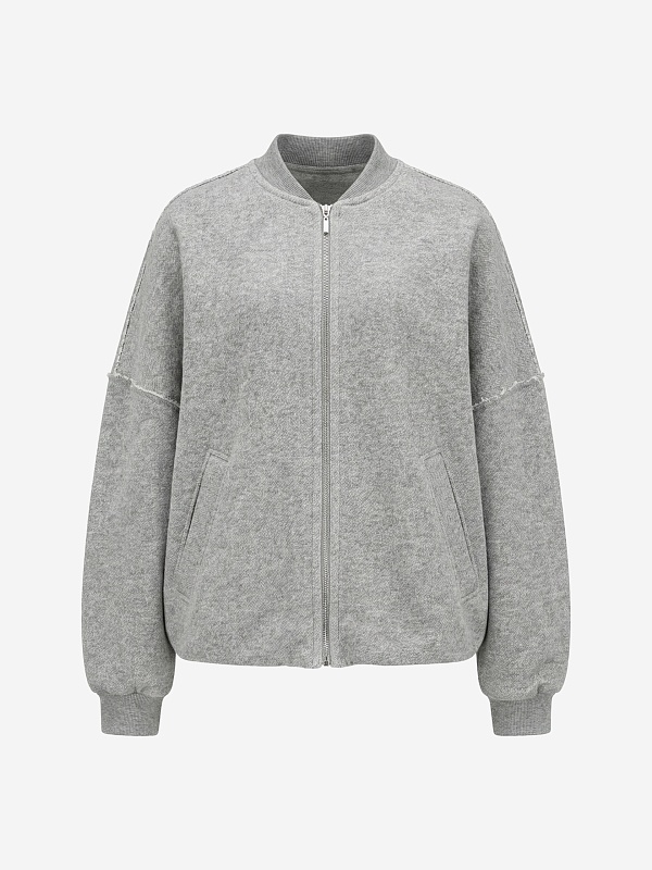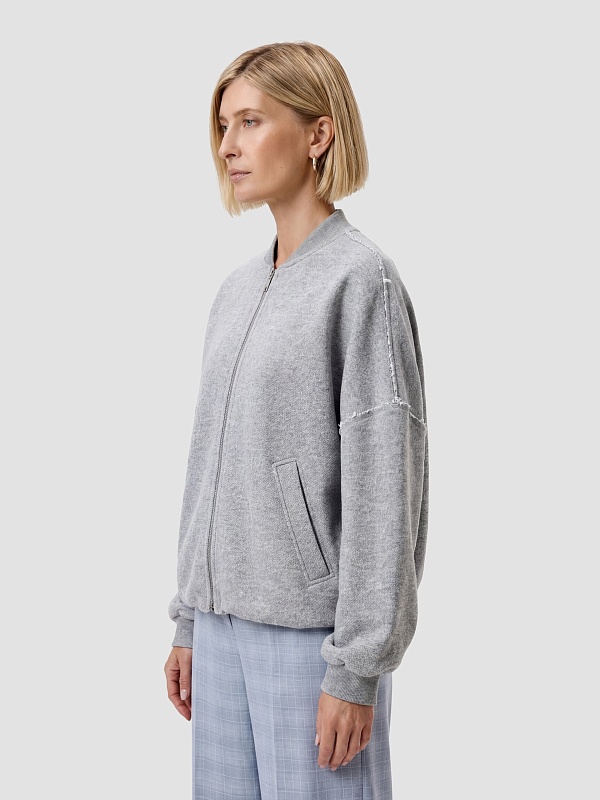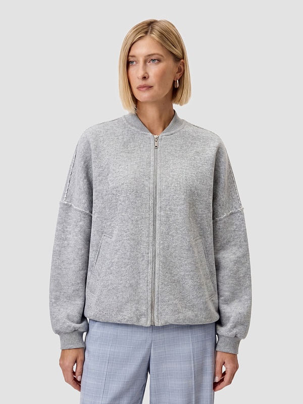 Жакет свободного силуэта из трикотажного полотна на подкладке. Перед с центральной застежкой на молнии. Втачной рукав со спущенным плечом и манжетой длиной ниже запястья.