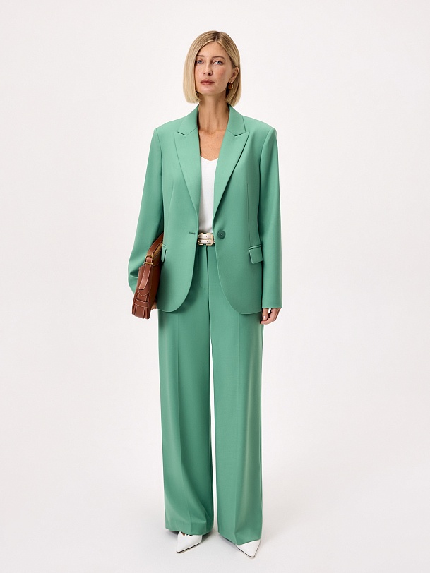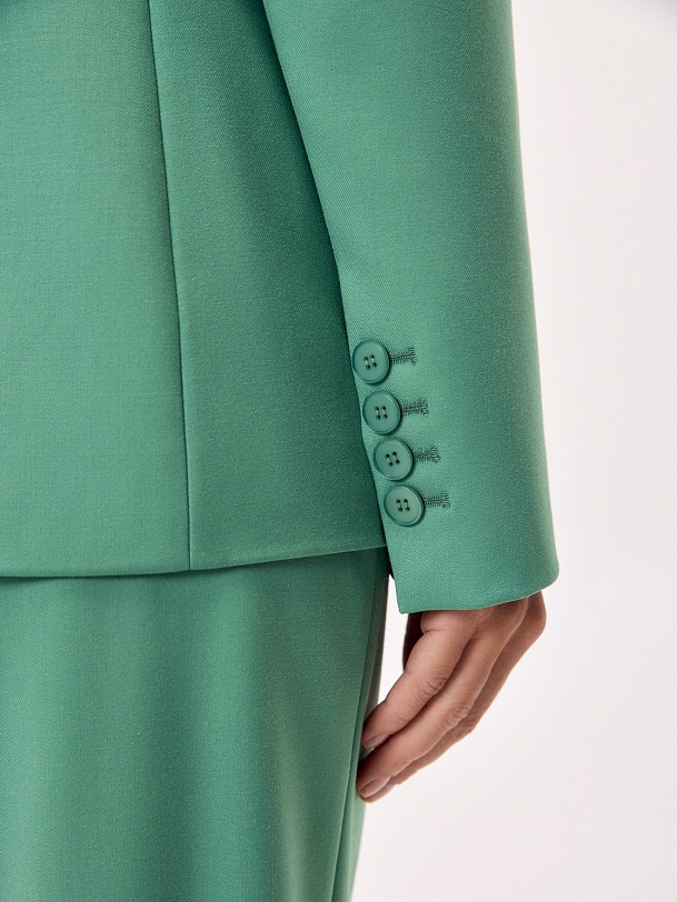 Жакет однобортный на одной пуговице, немного приталенный из костюмной ткани в трендовом зеленом цвете с лацканами формы «щука». На полочке рабочие прорезные карманы-листочки с клапанами. Составит идеальную пару с брюками и жилетом из одной ткани.