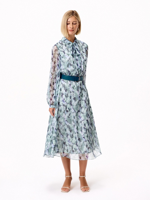 Платье шифоновое миди в романтичном принте с резинкой по талии, воротник отложной, застежка на пуговицы до талии. Рукав втачной на узком манжете. В комплект входит галстук из основной ткани и ремень из экокожи. Станет идеальным вариантом для праздника.