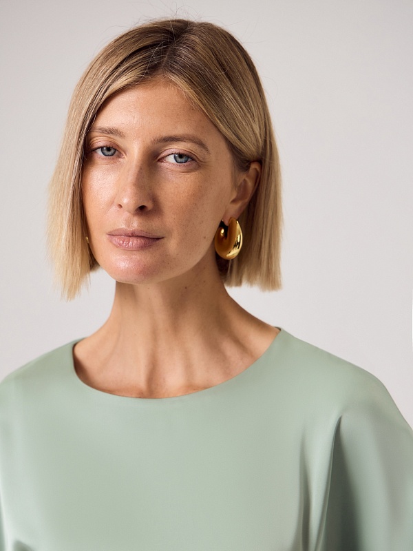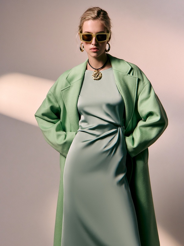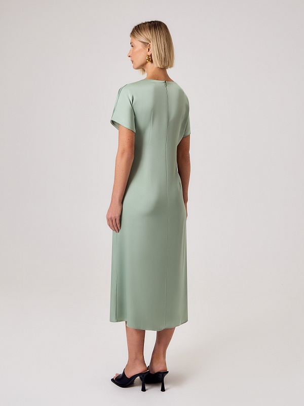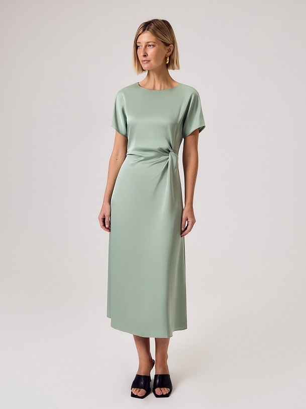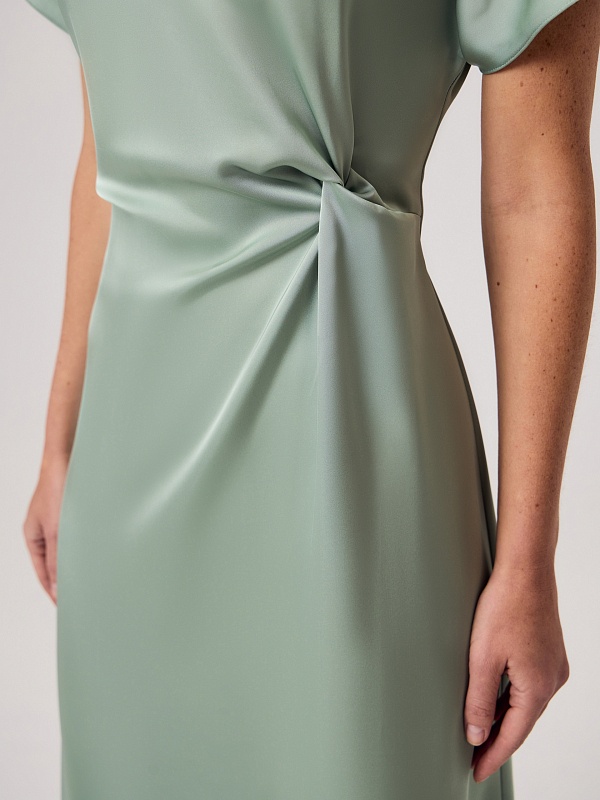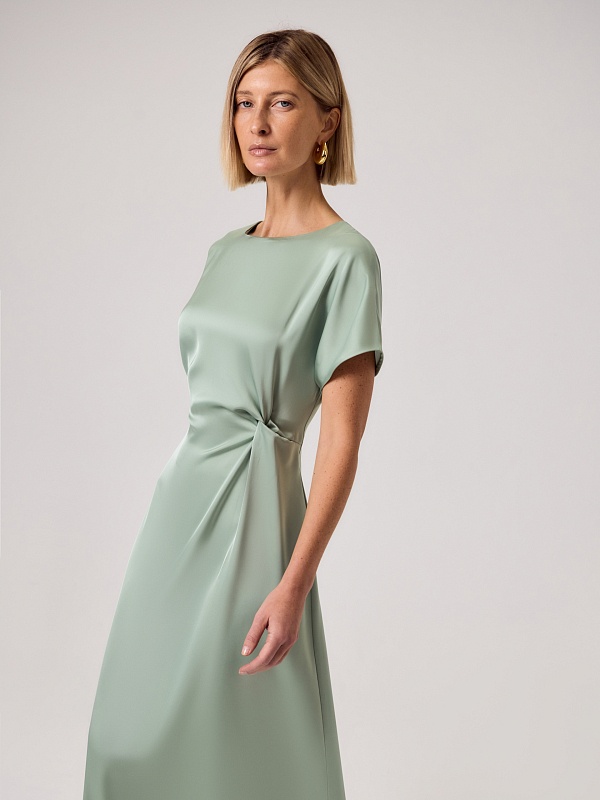 Полуприлегающее платье-миди из атласной ткани светло-зеленого цвета с круглой горловиной и спущенным плечом. На талии трендовый узел. Юбка по низу имеет расклешение и формирует мягкие складки.