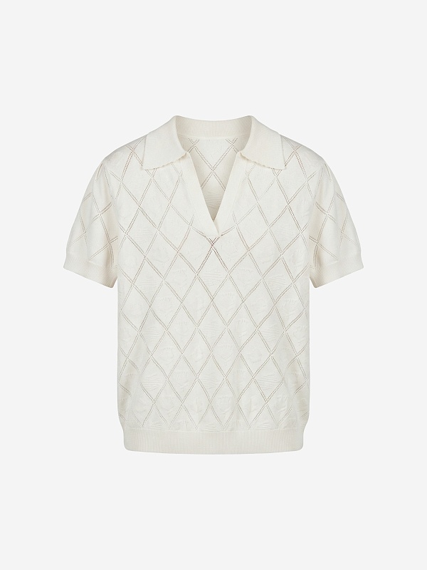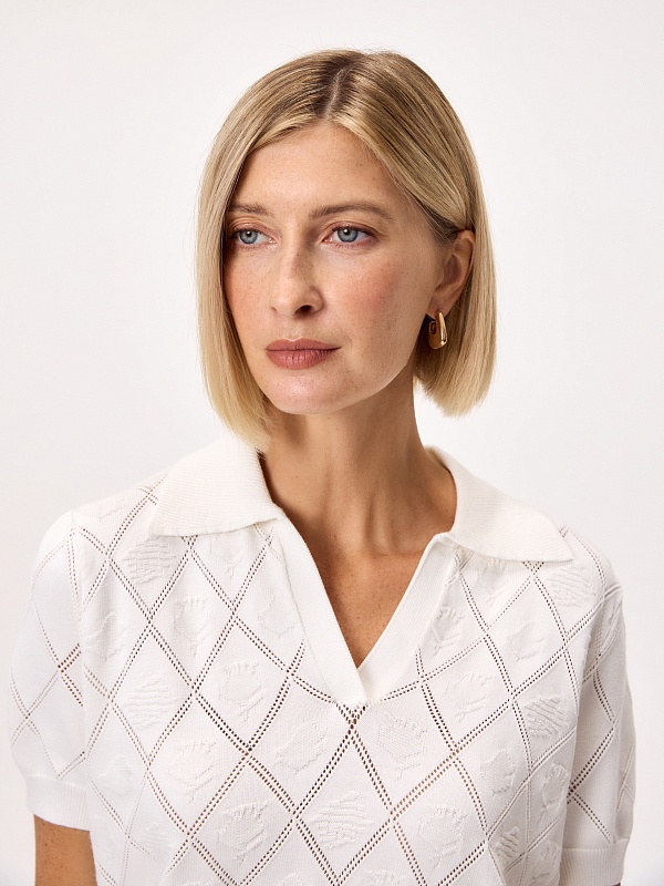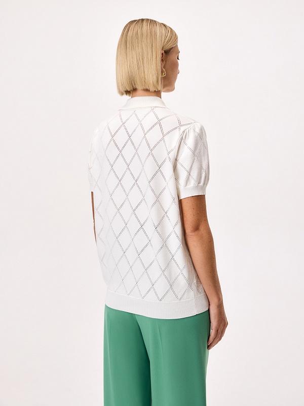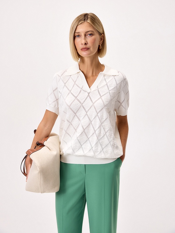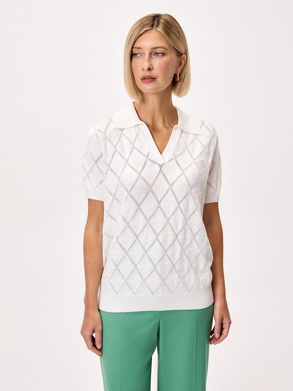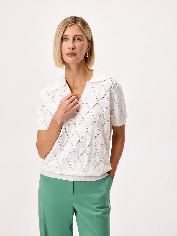 Вязаный фактурный джемпер с воротником-поло, коротким втачным рукавом. Джемпер отлично разнообразит гардероб.