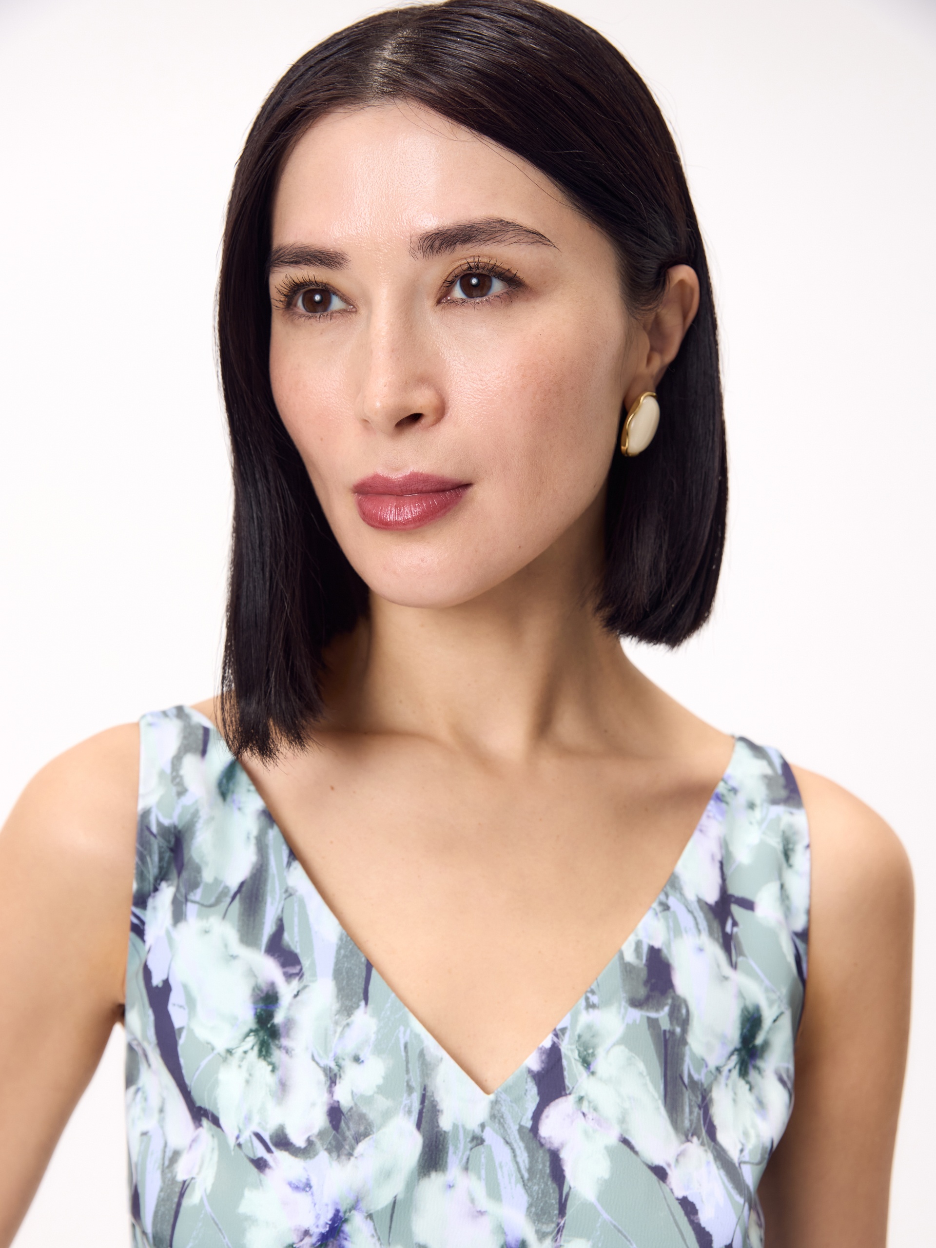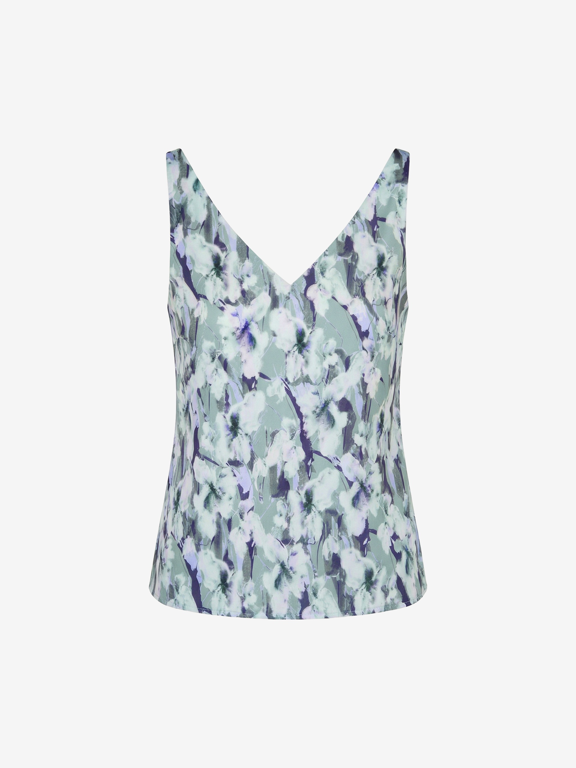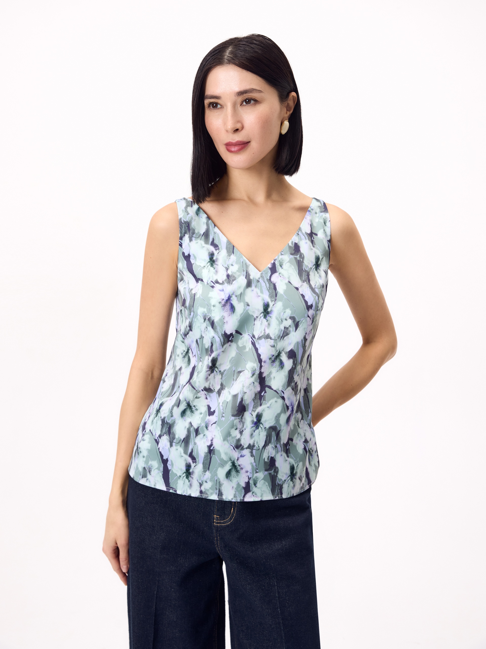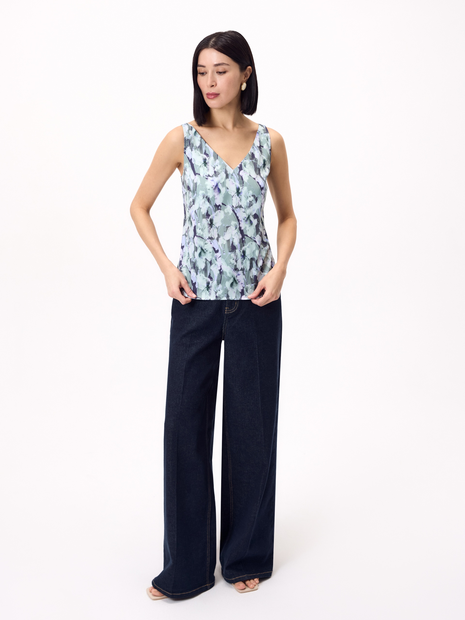 Прямой топ из из атласной ткани в романтичном весеннем принте на тонких лямках с V-образным вырезом, по низу есть небольшие разрезы на боковых швах.