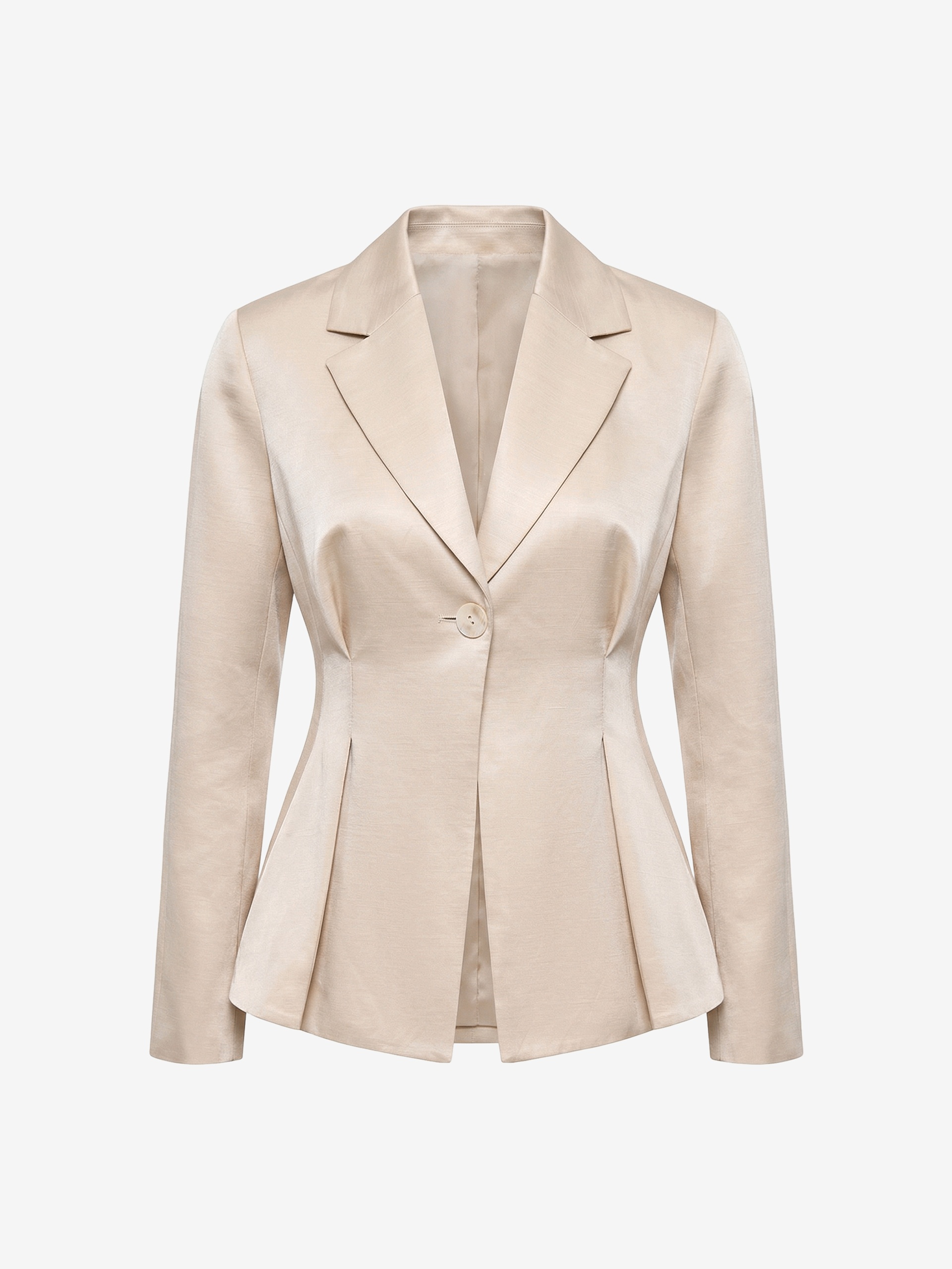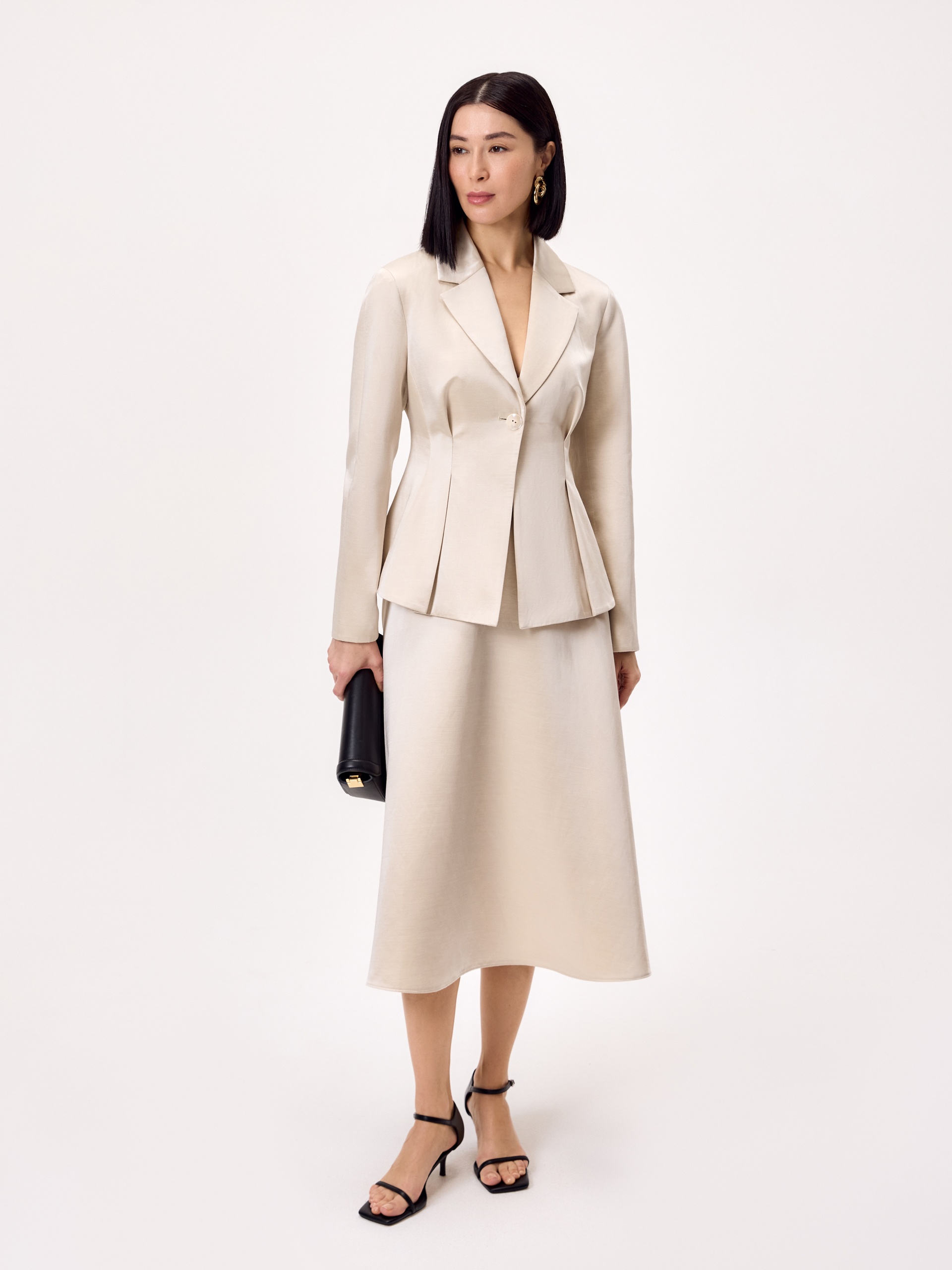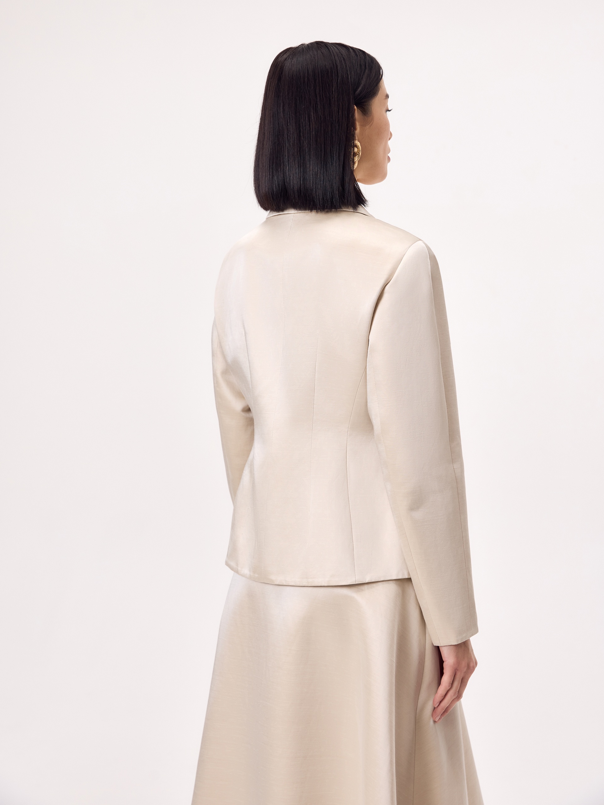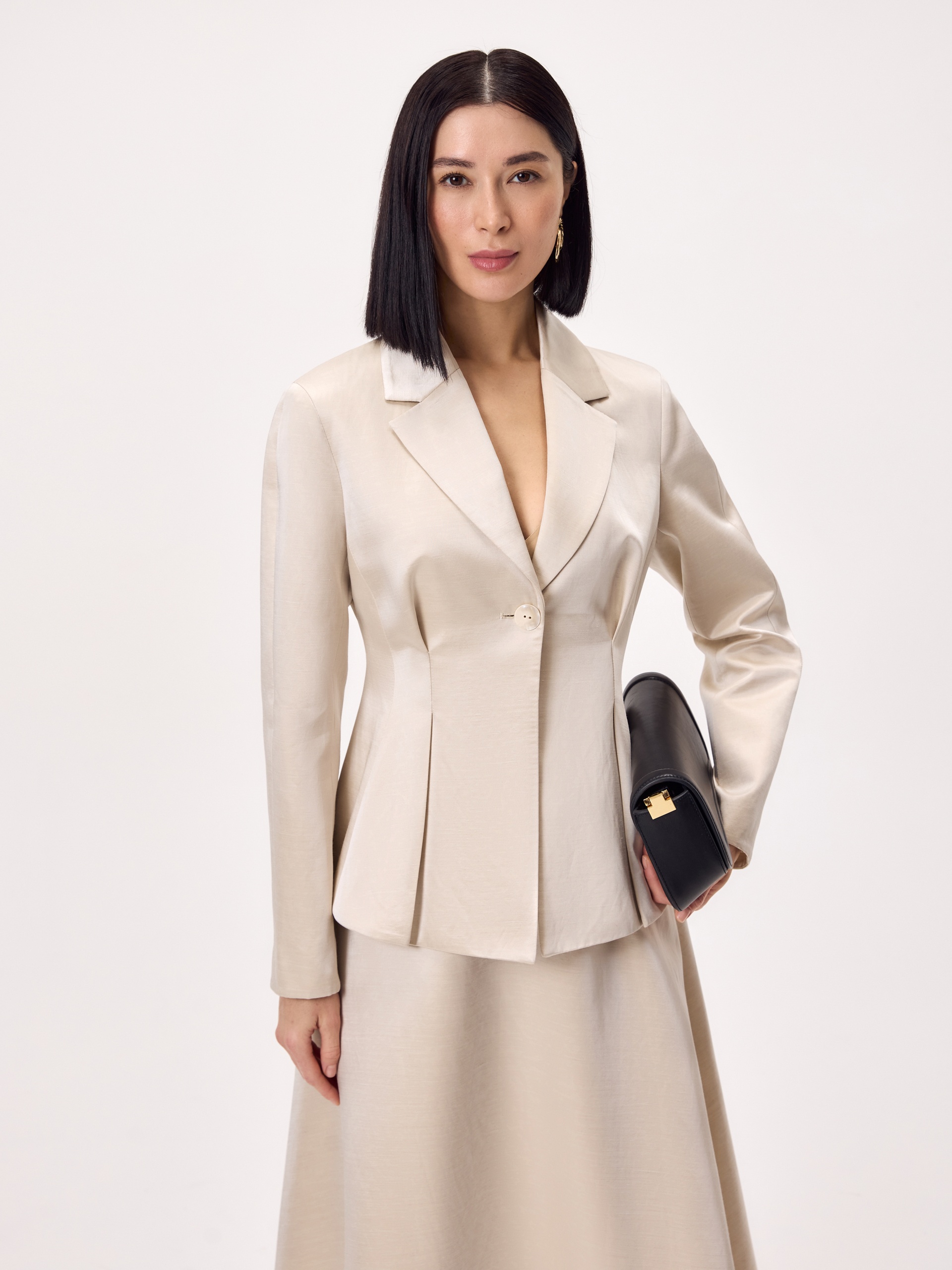 Нарядный приталенный жакет на подкладке, с расширенной линией плеча и складками от линии талии для формирования баски. Жакет однобортный на одну пуговицу, выполнен из смесовой ткани с блеском в цвете топленое молоко....