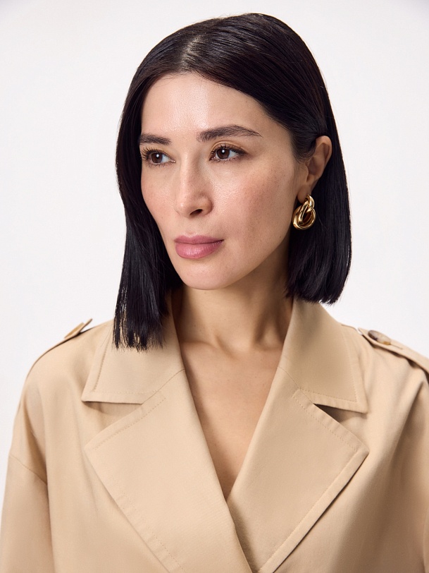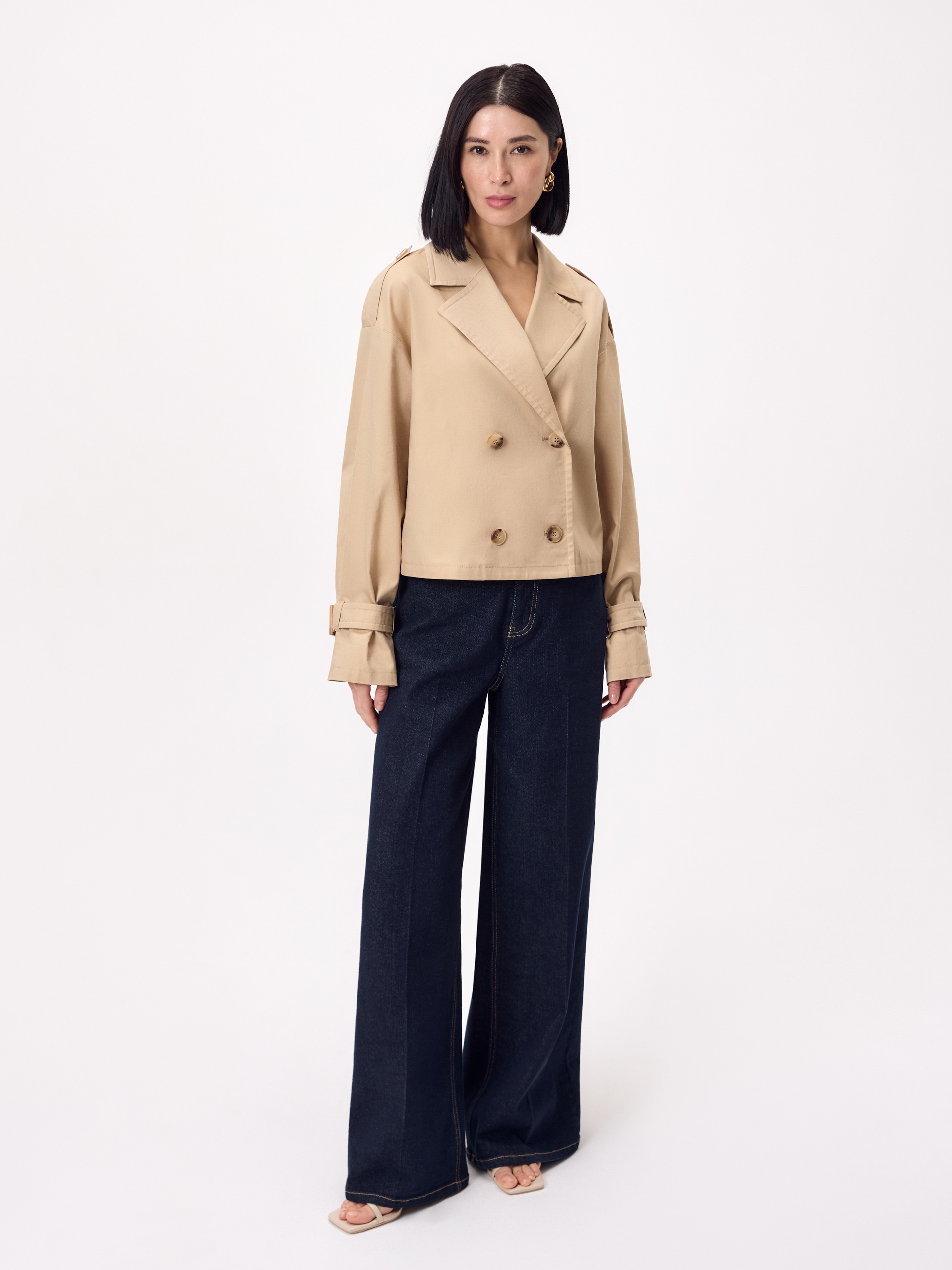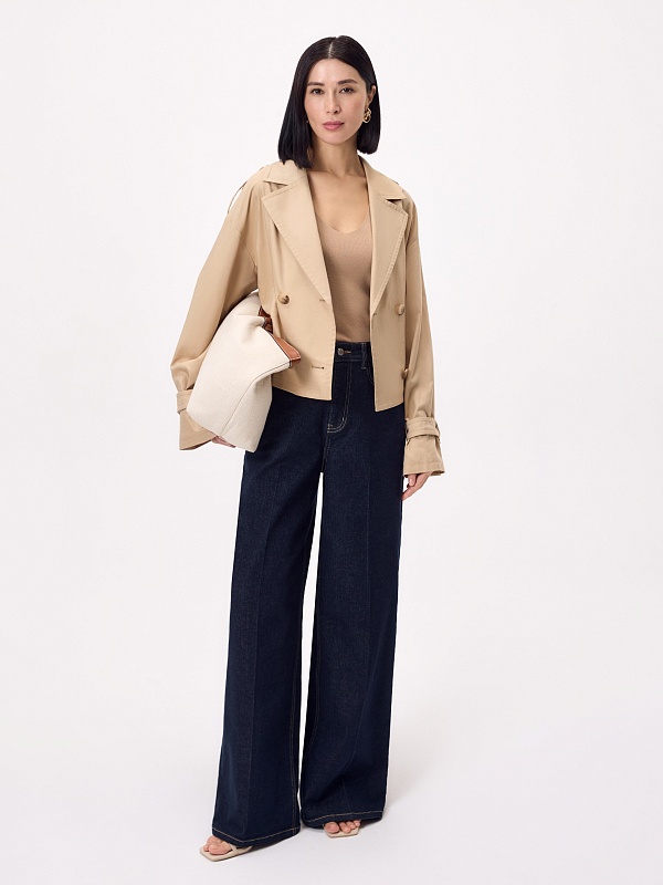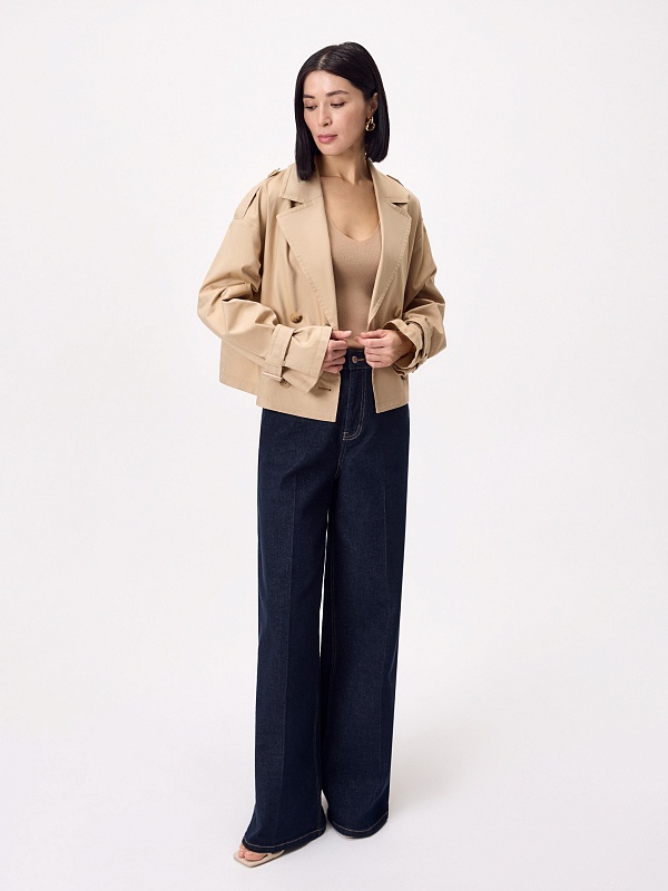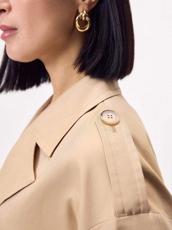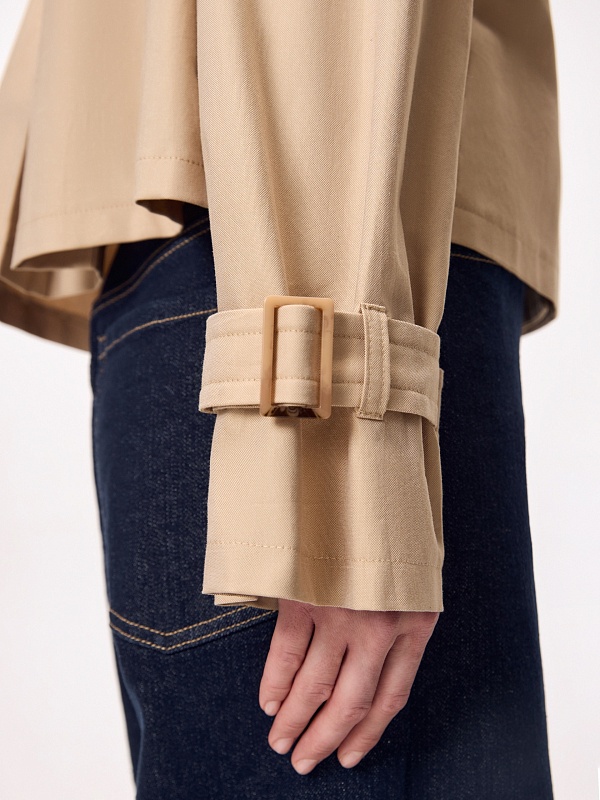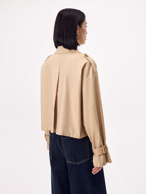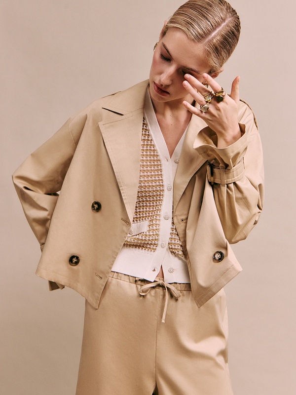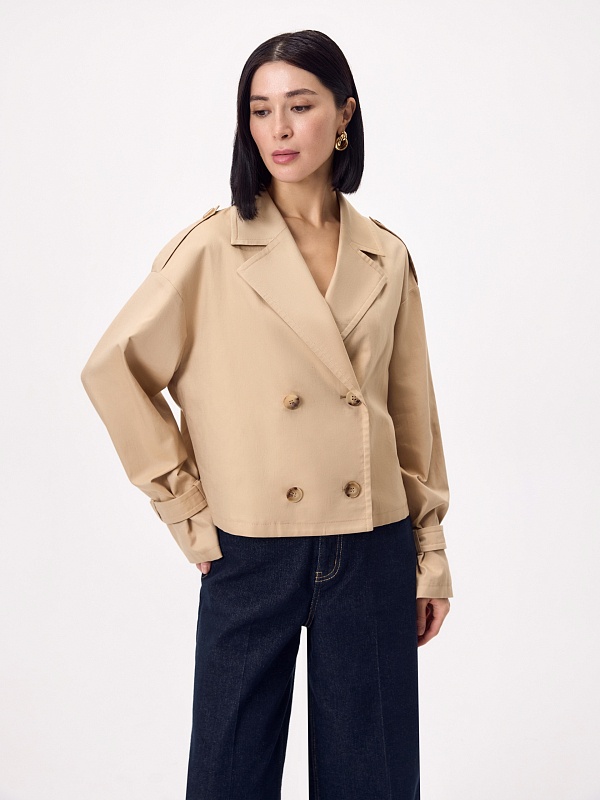 Укороченный двубортный жакет с элементами тренча. Английский воротник и лацканы, похожие на детали тренча. Рукав широкий и удлиненный, с патой и пуговицей внизу для регулировки объема. Жакет застегивается на пуговицы. На плечах есть паты, а на спинке — складка.