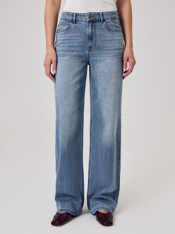 Прямые широкие джинсы из 100% хлопка голубого цвета на средней посадке с классической застежкой на молнию и пуговицу и карманами. Станет вашей любимой вещью в вашем гардеробе.
