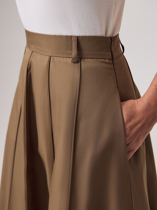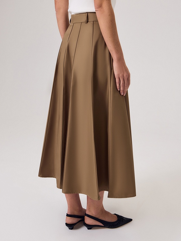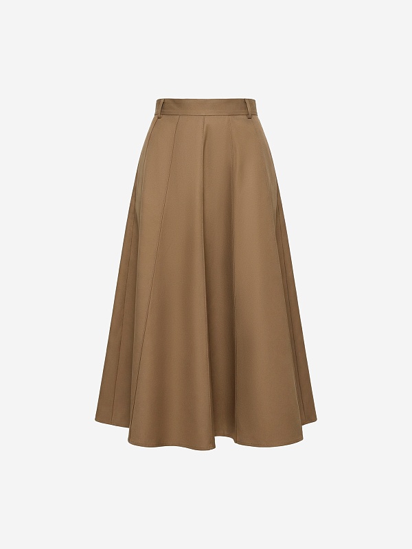 Юбка трапеция из клиньев выполнена из твиловой смесовой ткани с водоотталкивающей пропиткой в цвете «мокрый песок», на прямом поясе и потайной молнией в боковом шве.