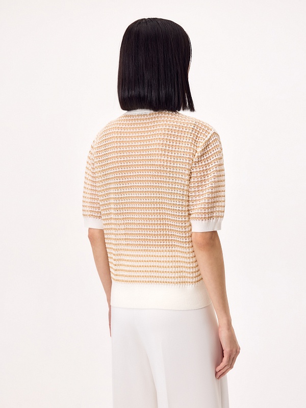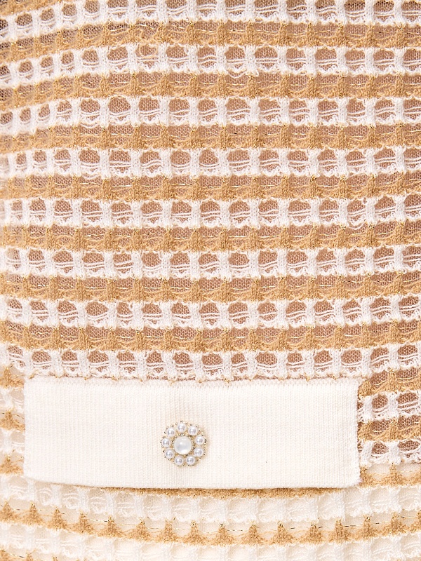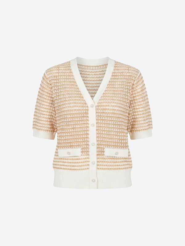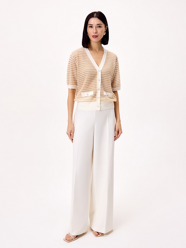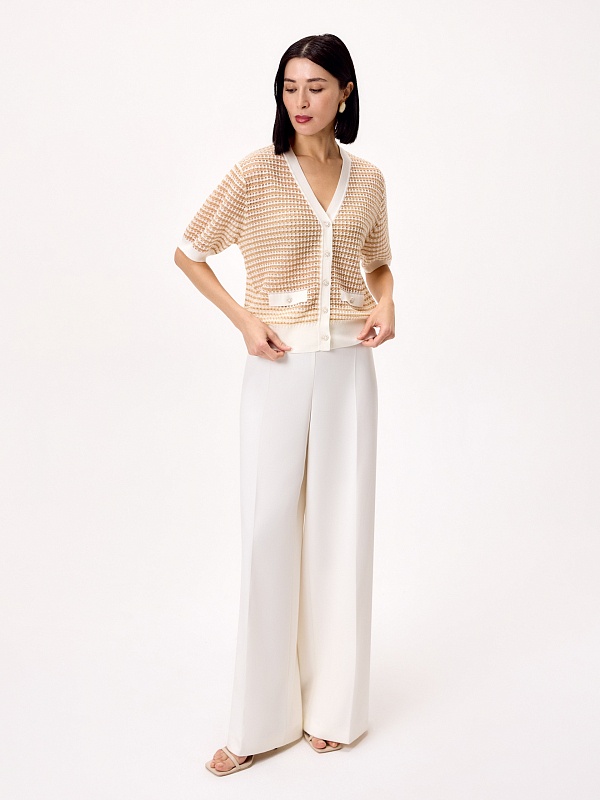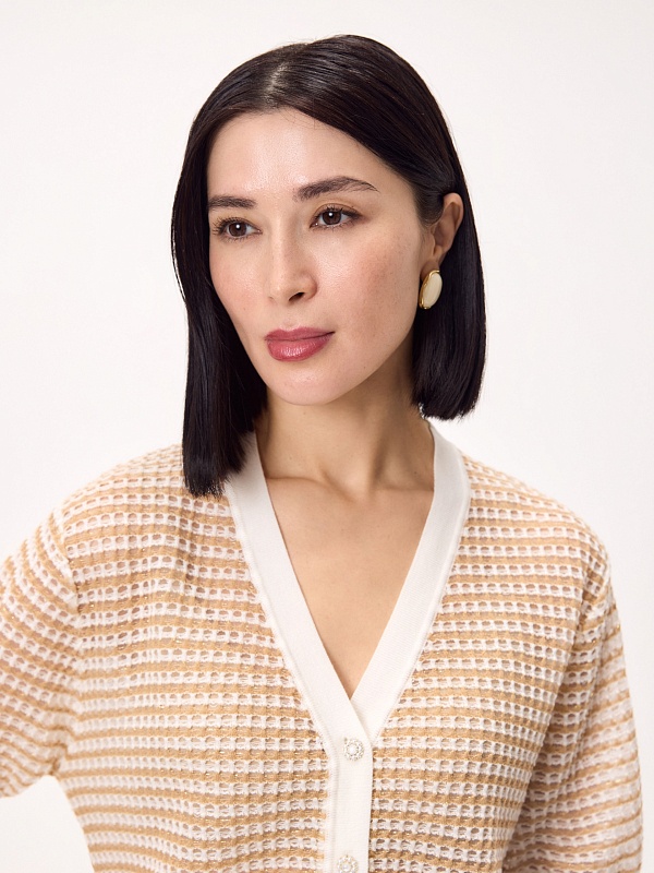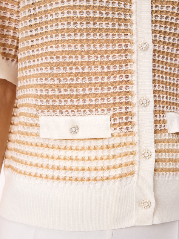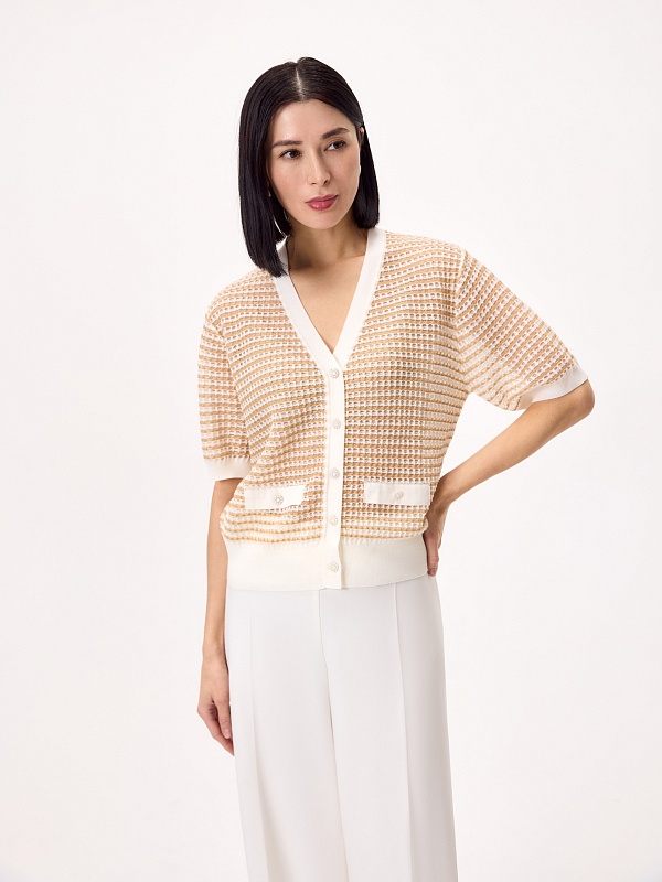 Легкий кардиган в фактурной вязке. У кардигана V-образный вырез, втачной короткий рукав с манжетой, застежка на красивые жемчужные пуговицы. Спереди есть два декоративных кармана с пуговицами, как на застежке. По низу есть резинка, благодаря которой можно регулировать посадку по фигуре.