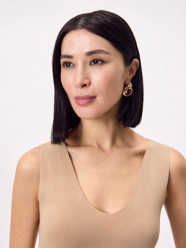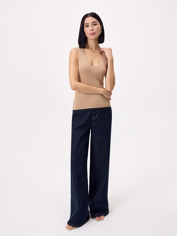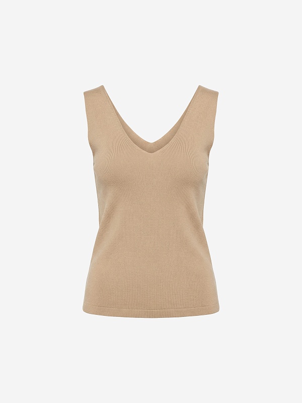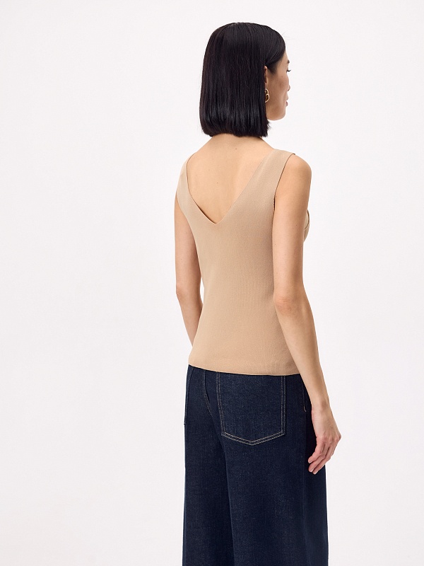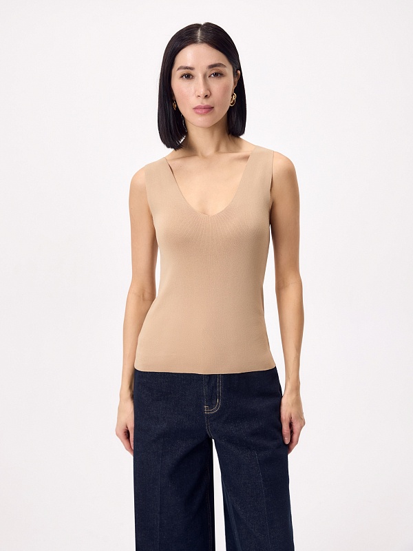 Топ из мягкого вязаного трикотажа в бежевом цвете с V-вырезом — лаконичный хит сезона для создания легких и стильных сочетаний.