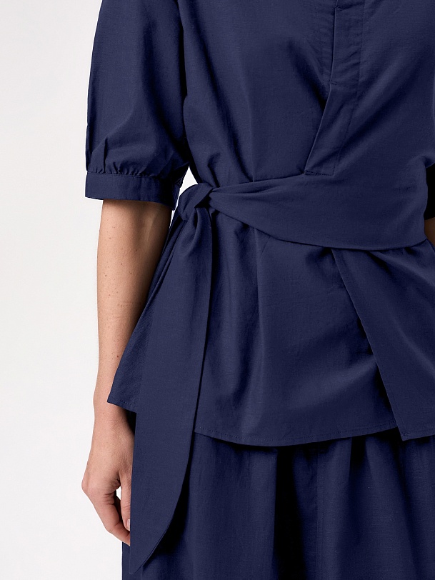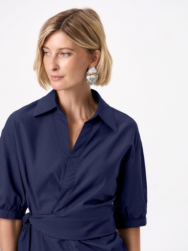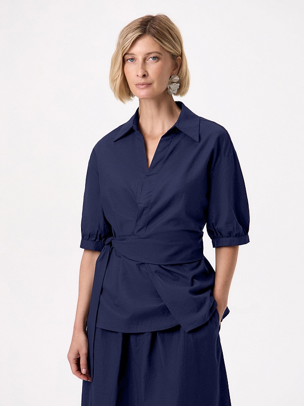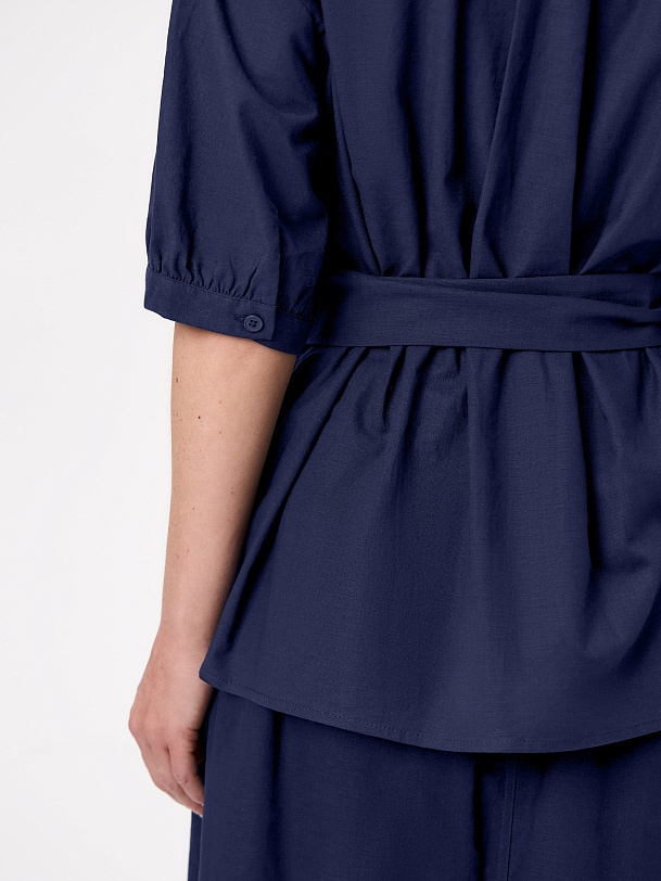 Полуприлегающая блуза на запах с небольшим отложным воротником и V-образным вырезом, спушенной линией плеча и рукавом 3/4. Блуза выполнена из смесовой ткани темно-синего цвета. Составит идеальную пару с брюками из одной ткани.