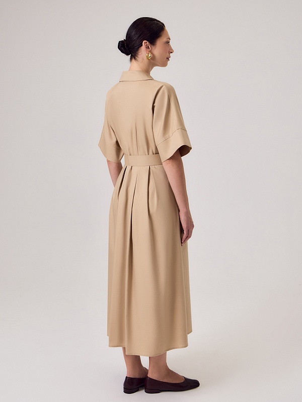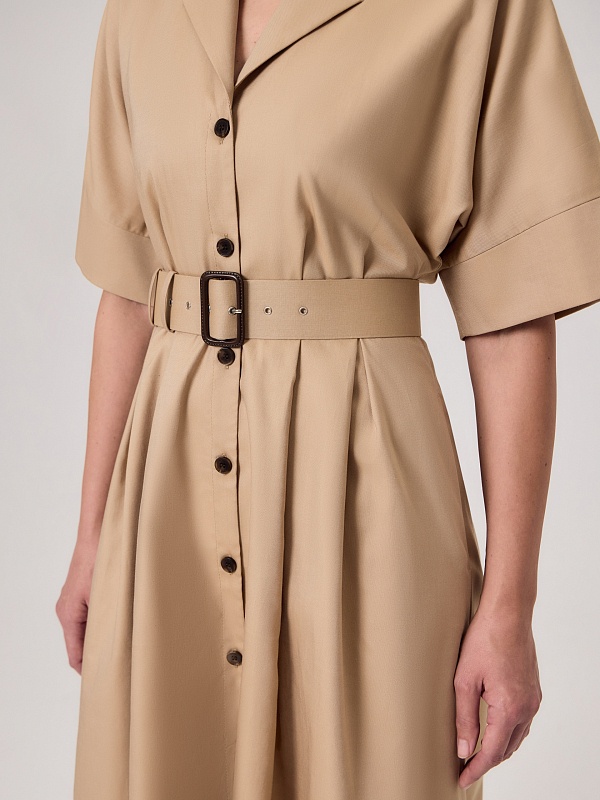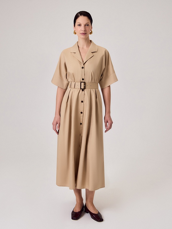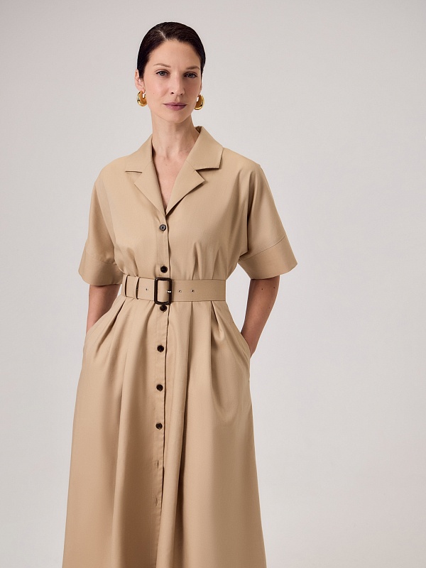 Приталенное платье в стиле сафари выполнено из 100% хлопка бежевого цвета. Платье отрезное по линии талии, классический английский воротник с лацканами, по переду застежка на пуговицы, рукав цельнокроеный с манжетом. На полочке и спинке складки для формирования юбки трапеции. В комплект входит обтяжной ремень.