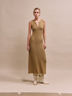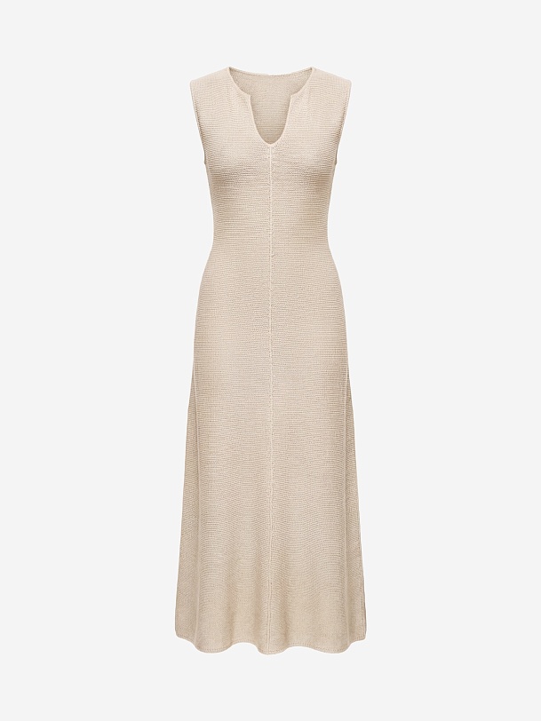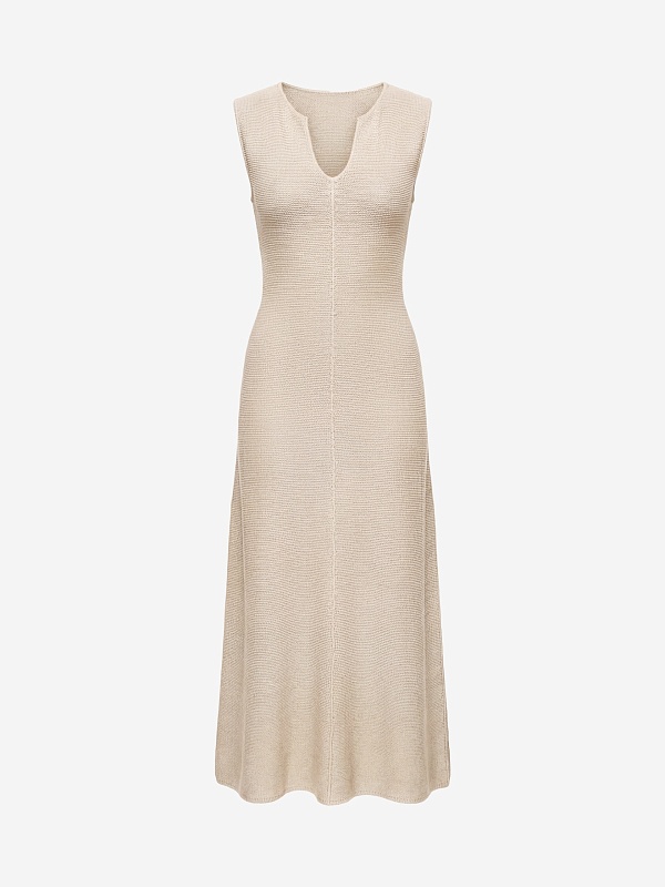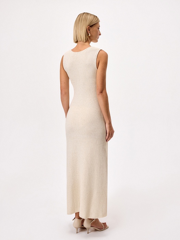 Вязаное платье из льняной пряжи прилегающего силуэта из лимитированной коллекции Pompa Premium станет отличной альтернативой в жаркие дни. Минималистичный силуэт, V-образный вырез и декоративный вертикальный рулик спереди зрительно вытягивают силуэт, а структорная вязка полотна придает современное звучание.