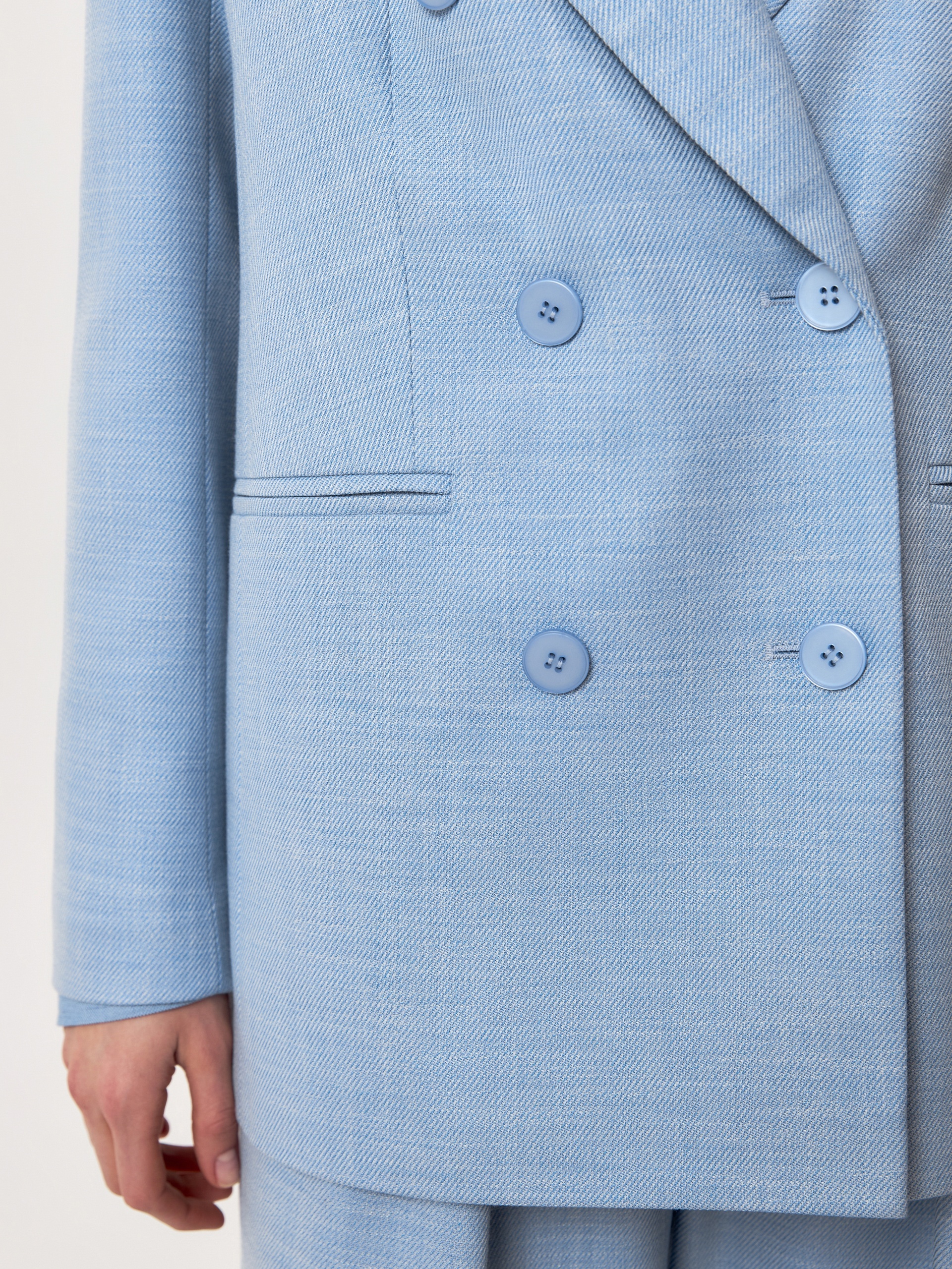 Жакет прямой двубортный, немного удлиненный, выполнен из вискозной костюмной ткани голубого цвета с меланжевым эффектом. Классический английский воротник с лацканами, на полочке прорезные карманы-листочки. На спинке шлицы, жакет полностью на подкладке. Составит идеальную пару с брюками и мини-юбкой из одной ткани....