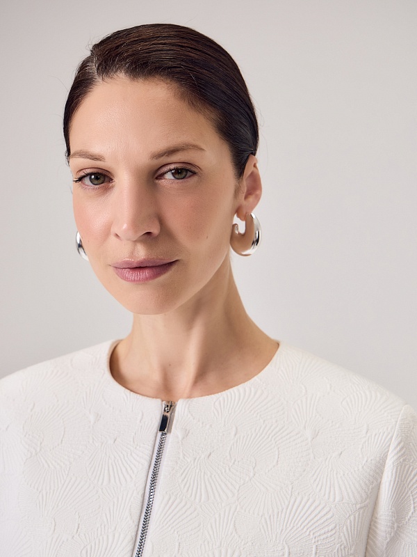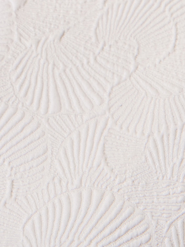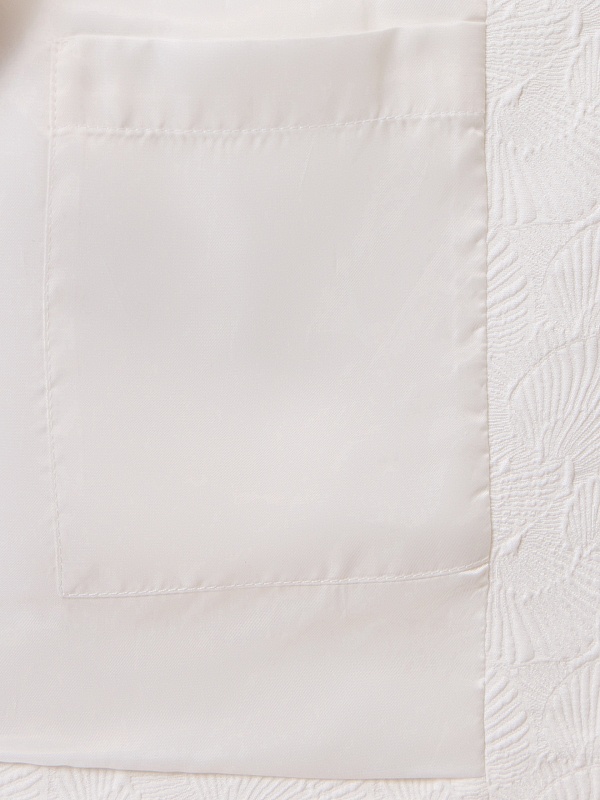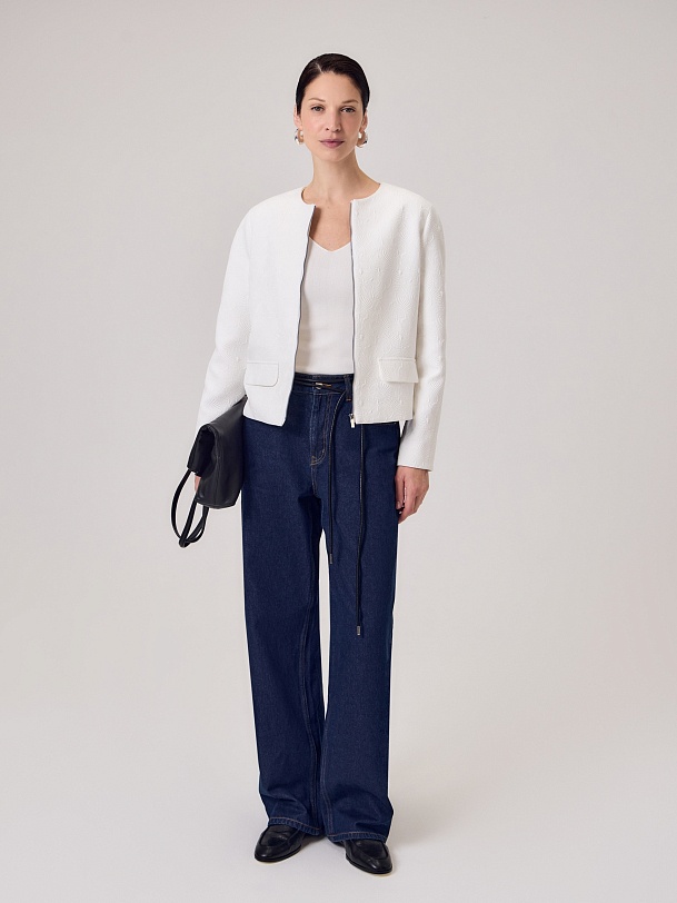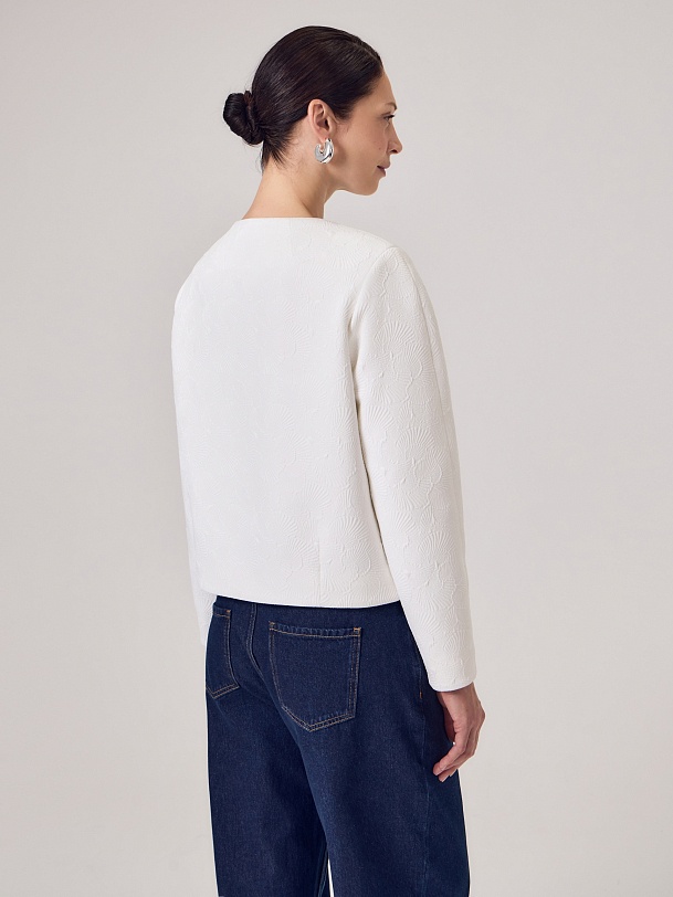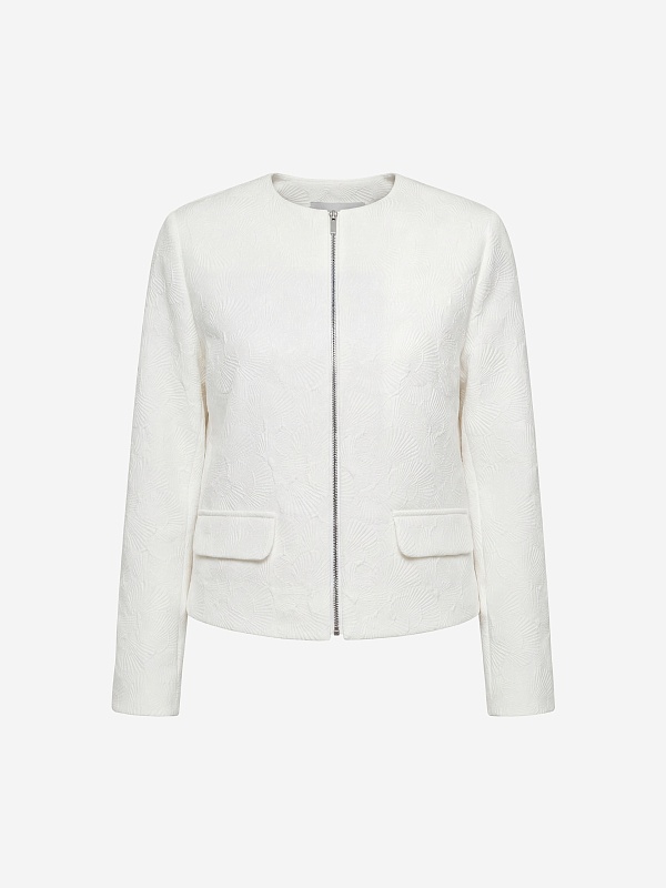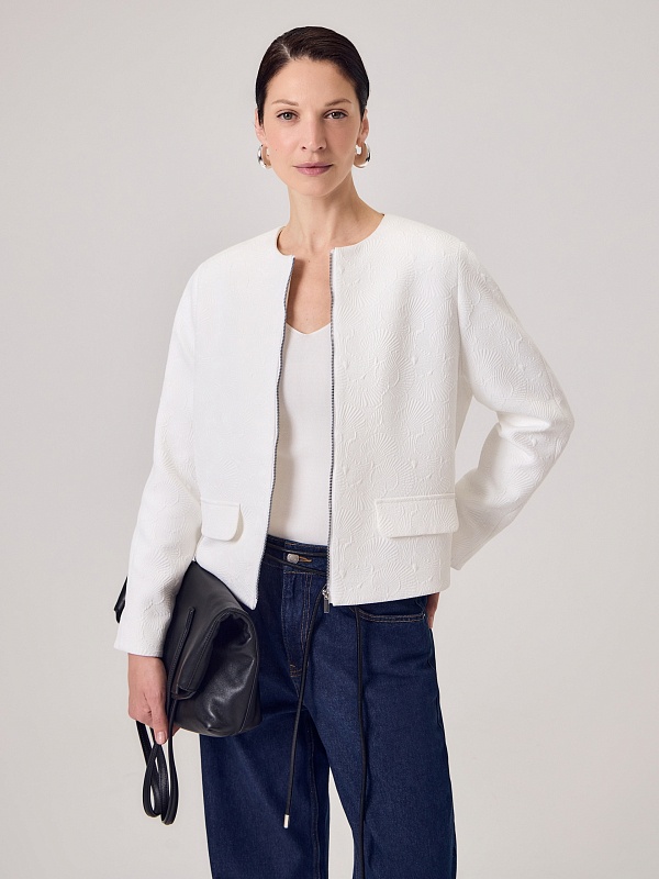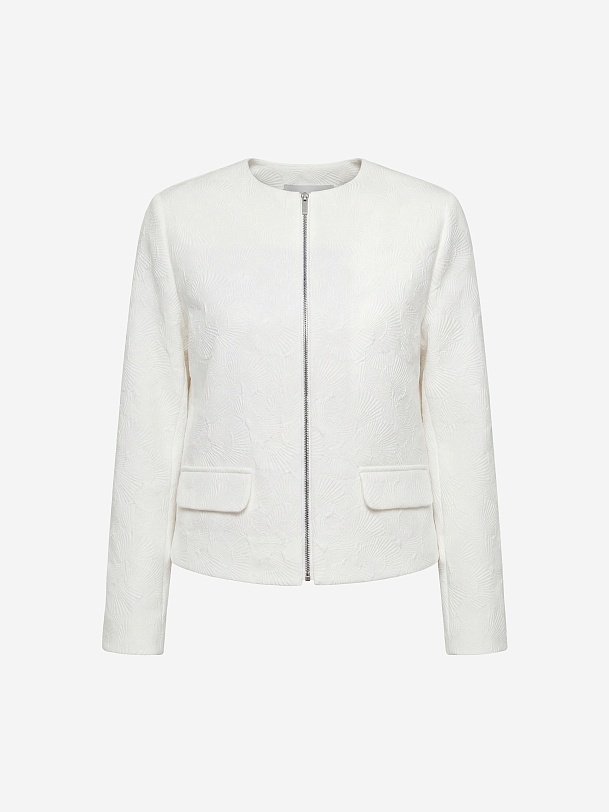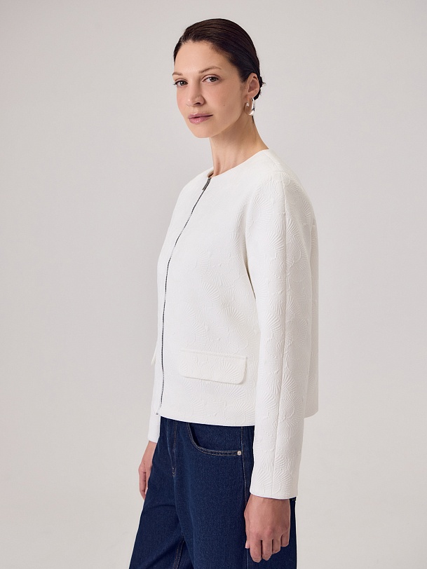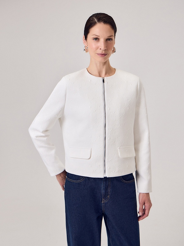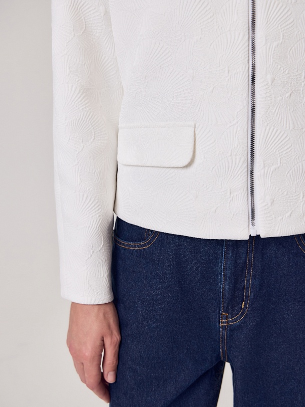 Укороченный жакет на молнии из костюмной жаккардовой ткани с узором ракушки выполнен в белом цвете, на подкладке. На переде прорезные карманы c клапанами. Жакет станет прекрасным дополнением как праздничного так и повседневного образа.