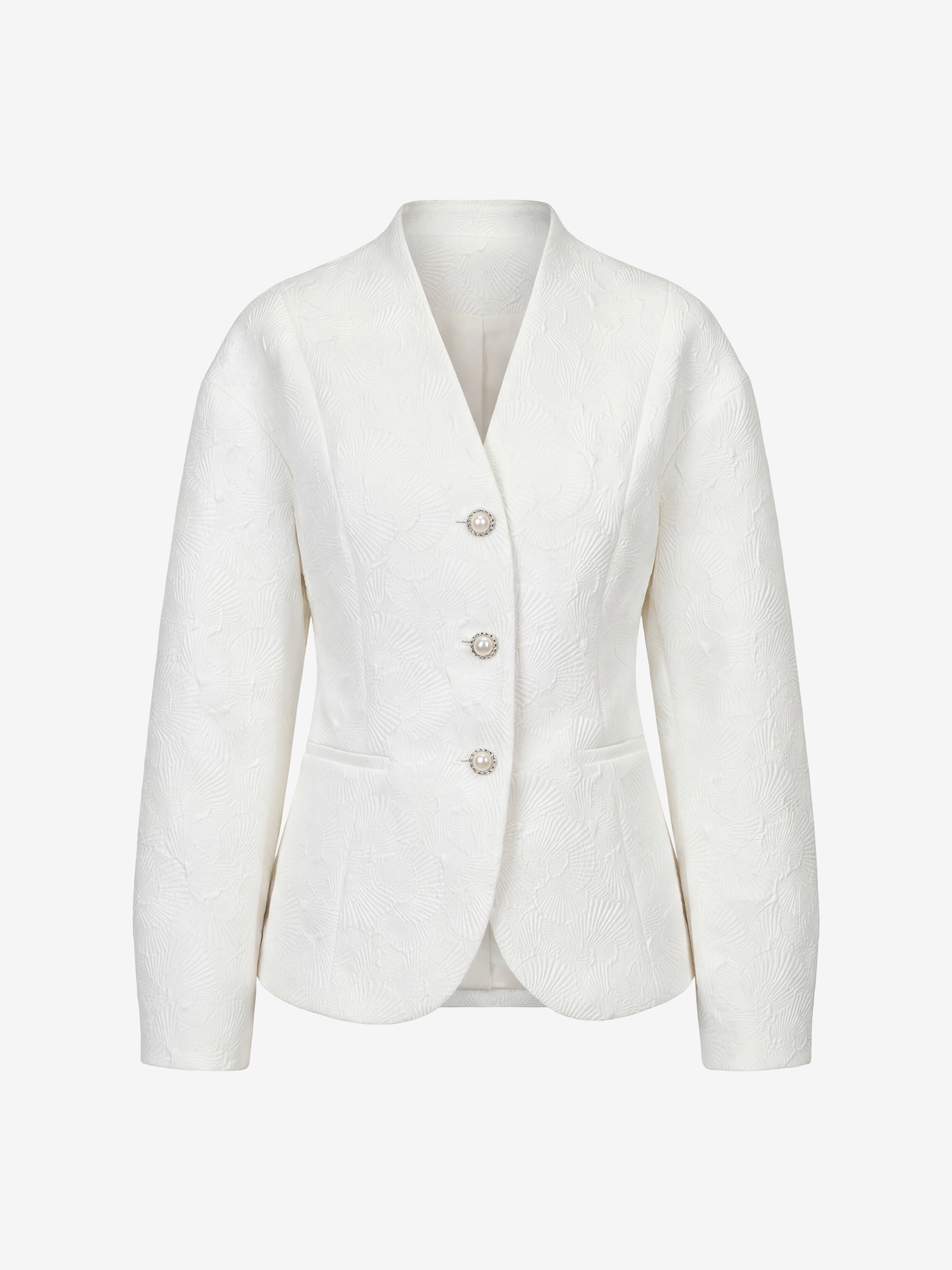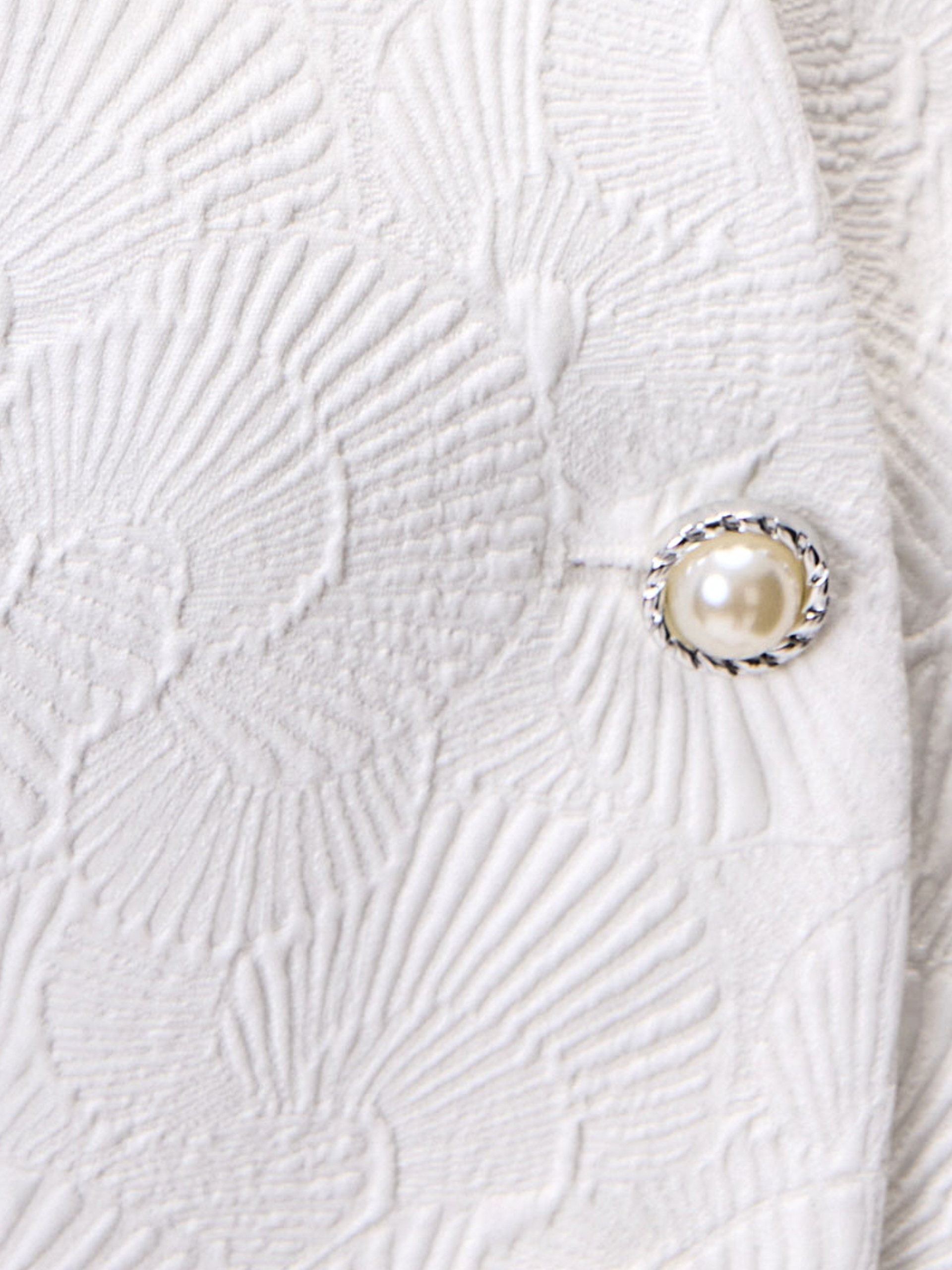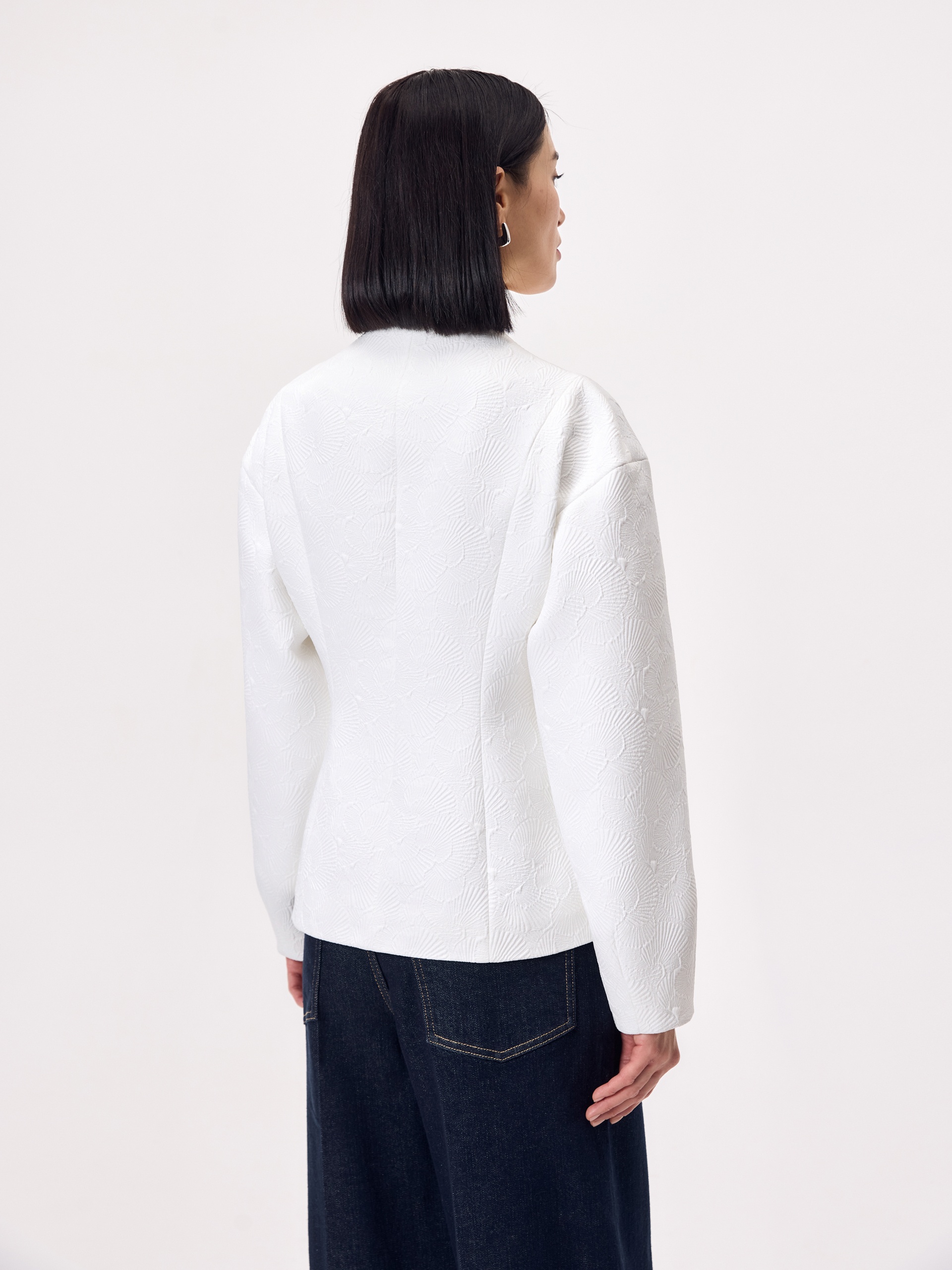 Жакет прилегающего силуэта из костюмной жаккардовой ткани с узором ракушки выполнен в белом цвете, на подкладке, длиной до линии бедер. На переде прорезные карманы c листочками. Жакет станет прекрасным дополнением как праздничного так и повседневного образа.
