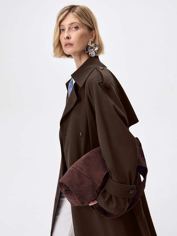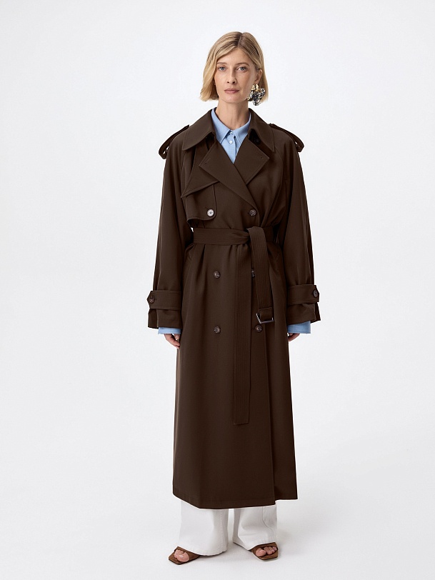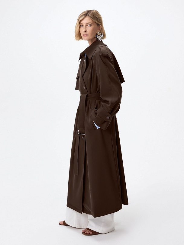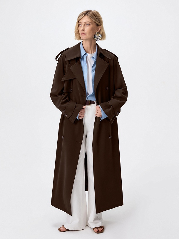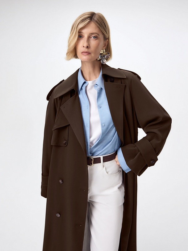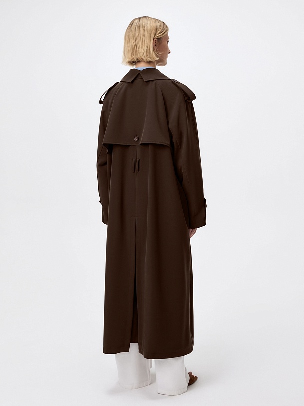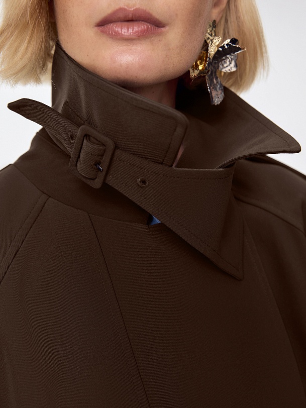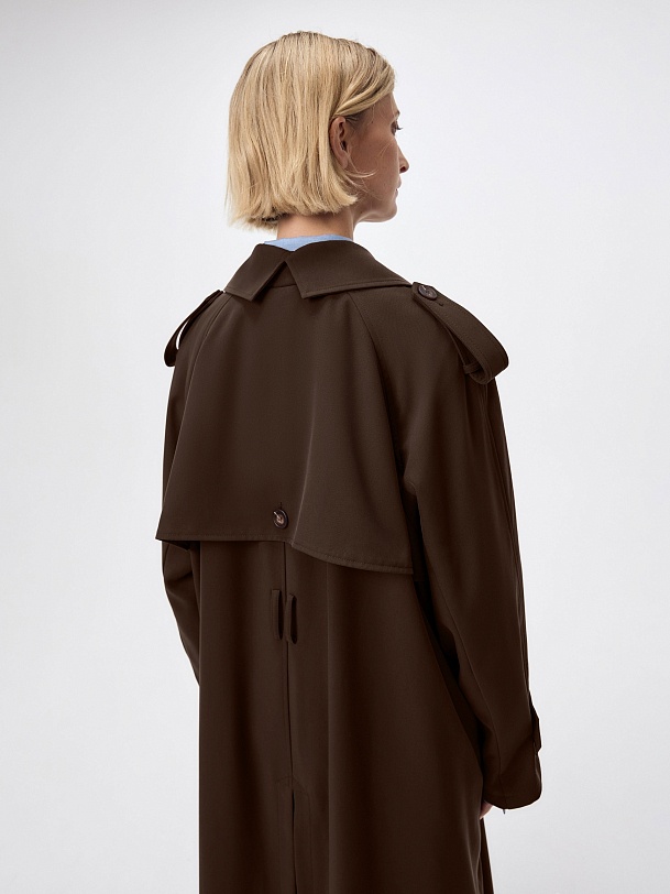 Классический плащ в модном оттенке "горький шоколад". Английский, полностью запахивающийся, воротник, отлетнаяя кокетка, паты на рукавах и погоны передают традиционную стилистику этого незаменимого для переменчивой весенней погоды плаща. На спинке выполнена глубокая складка, застегивающаяся на пуговицу. Образ дополняет пояс из основной ткани с пряжкой. Для дополнительной защиты от осадков ткань плаща имеет водоотталкивающее покрытие.