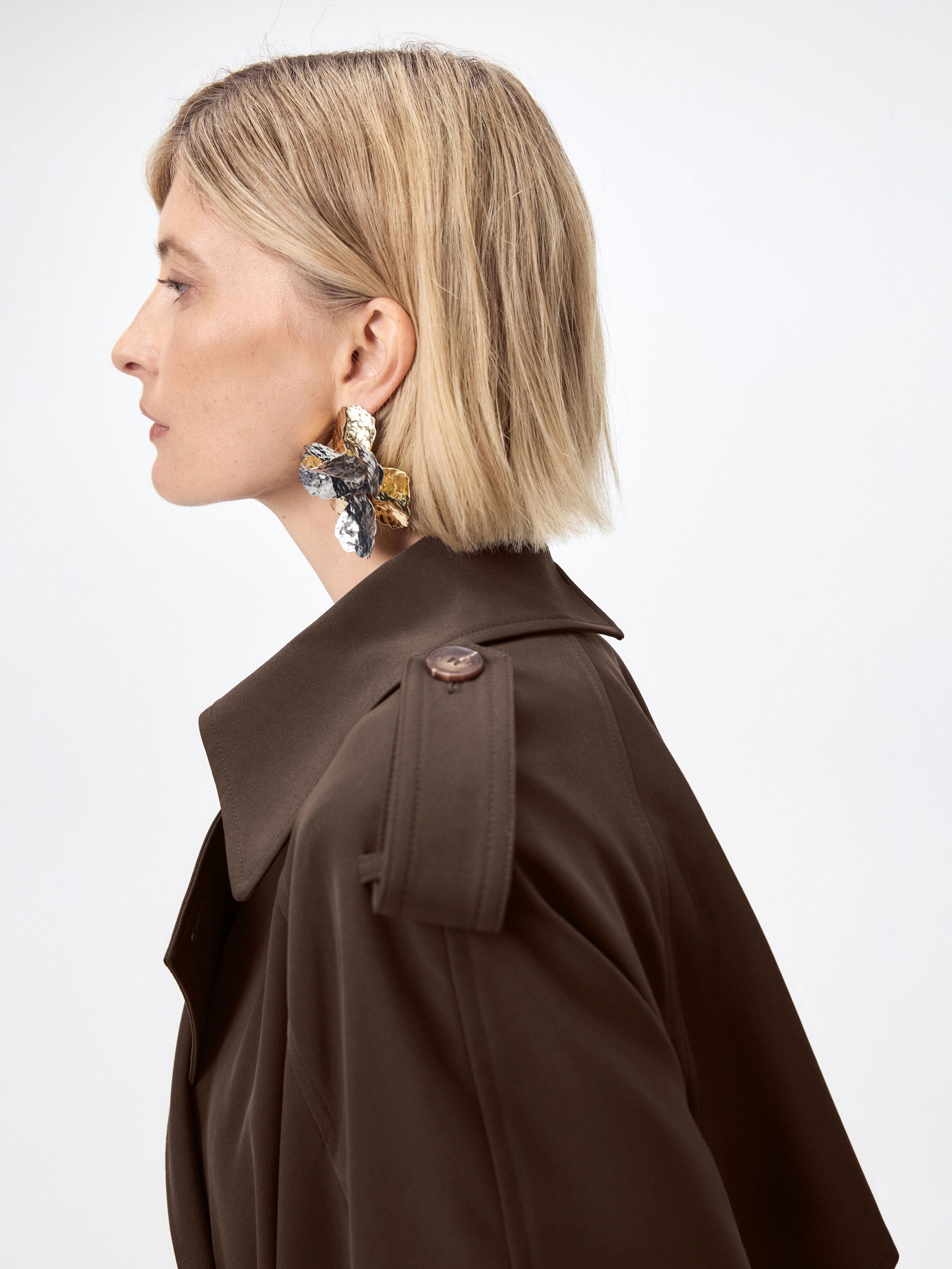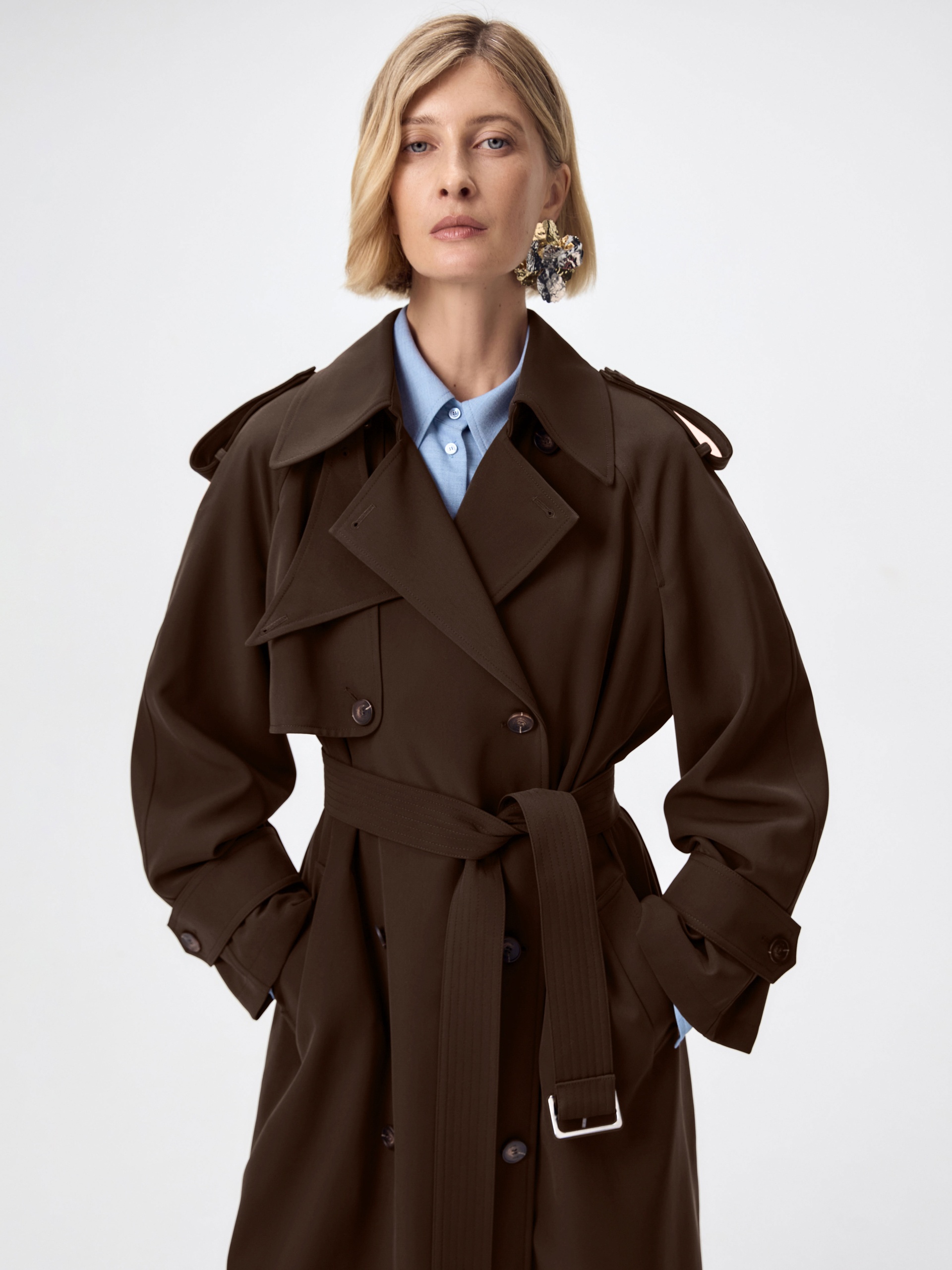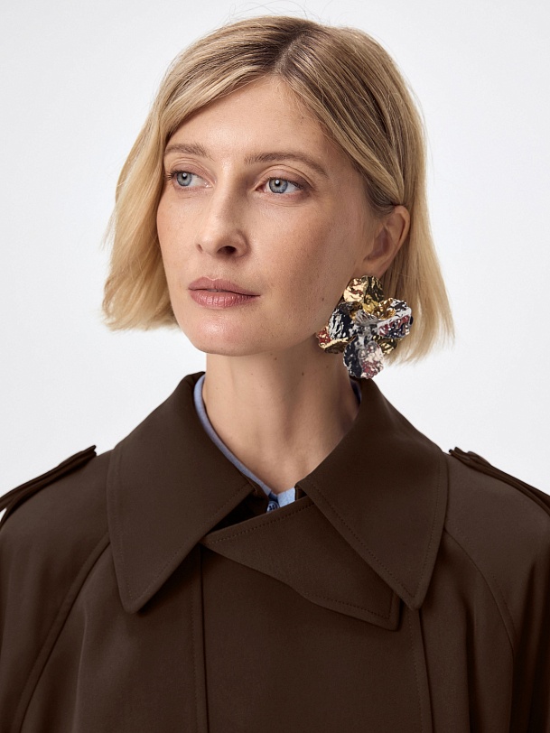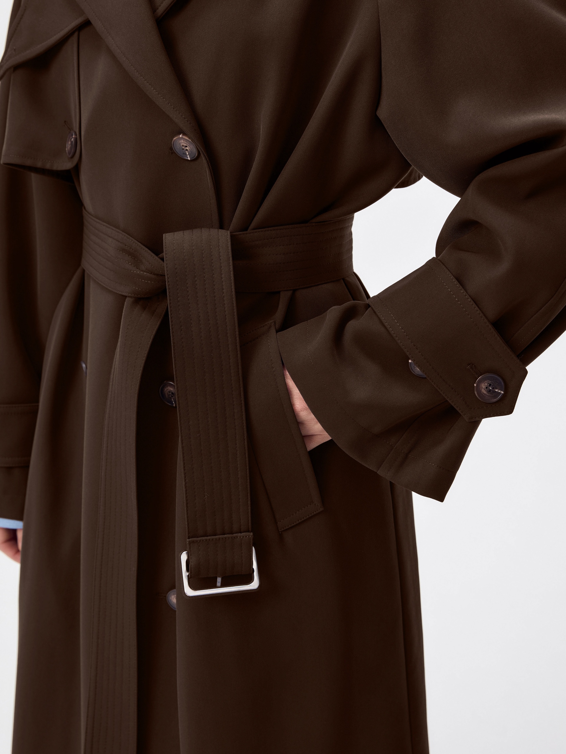 Классический плащ в модном оттенке "горький шоколад". Английский, полностью запахивающийся, воротник, отлетнаяя кокетка, паты на рукавах и погоны передают традиционную стилистику этого незаменимого для переменчивой весенней погоды плаща. На спинке выполнена глубокая складка, застегивающаяся на пуговицу. Образ дополняет пояс из основной ткани с пряжкой. Для дополнительной защиты от осадков ткань плаща имеет водоотталкивающее покрытие.