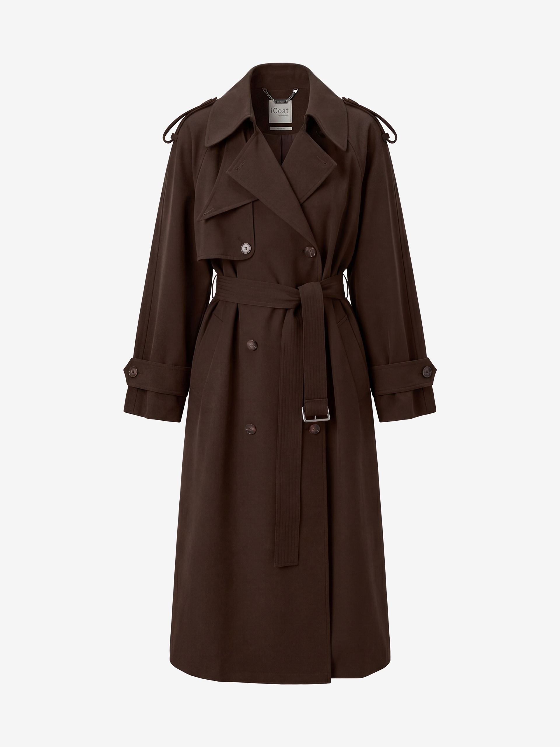 Классический плащ в модном оттенке "горький шоколад". Английский, полностью запахивающийся, воротник, отлетнаяя кокетка, паты на рукавах и погоны передают традиционную стилистику этого незаменимого для переменчивой весенней погоды плаща. На спинке выполнена глубокая складка, застегивающаяся на пуговицу. Образ дополняет пояс из основной ткани с пряжкой.
