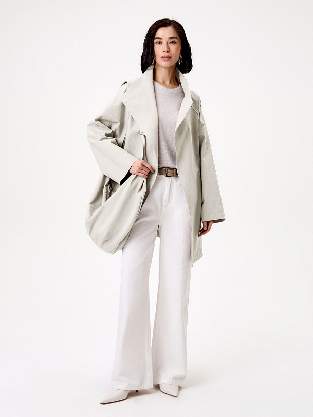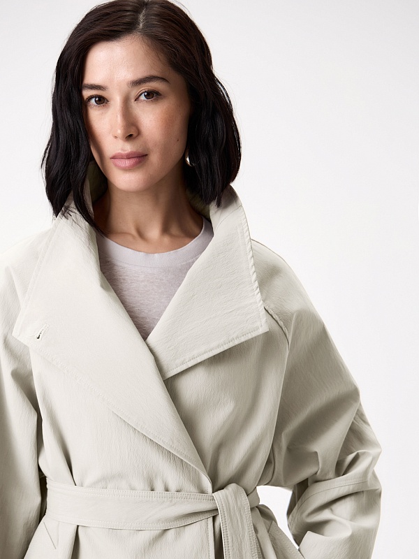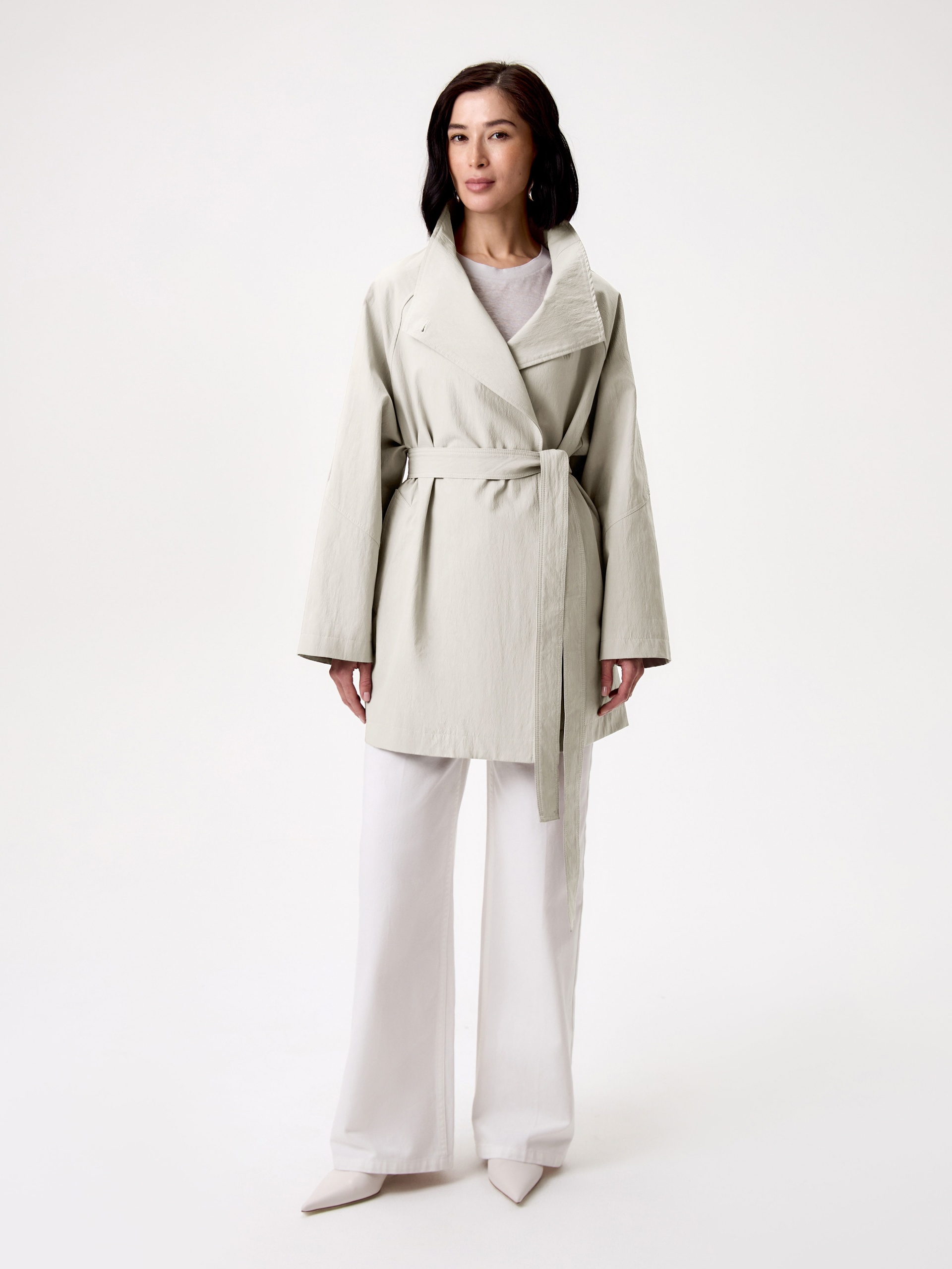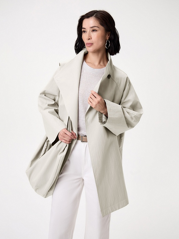 Must have сезона - укороченный плащ в светло-сером цвете с асимметричным воротником-стойкой. Плащ выполнен из премиальной хлопковой плащевой ткани с водоотталкивающим покрытием. Уникальный покрой рукава-реглан на спинке переходит в широкую кокетку. Спереди на рукавах декоративные швы, имитирующие широкие манжеты. По бокам расположены глубокие карманы с листочками. Завершают изделие двойные отделочные строчки, а также пояс из основной ткани. В комплект к плащу предлагается удобная и вместительная сумка-хобо из основной ткани, идеально подходящая к любому весеннему образу.